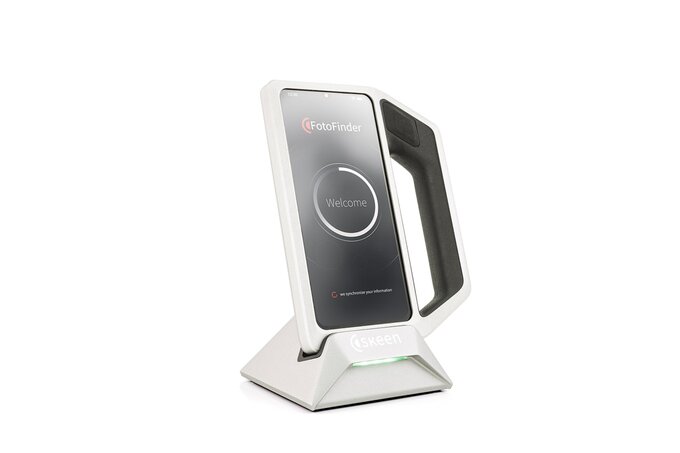 The mobile device for the medical examination of moles is formally reminiscent of a modern smartphone, with the large handle offering particular comfort. The use of advanced optics, state-of-the-art technology and AI-supported analysis raises the precision of skin examinations to a new level, significantly improving the patient experience. ‘skeen’ sets new standards in dermatological diagnostics.