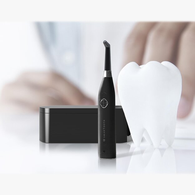 SmarTooth is an optical dental caries diagnostic device that uses a laser to help diagnose dental caries. The SmarTooth is composed of a portable hardware main body with batteries, a main body holder, and a mobile application. The hardware components provide a laser source, an LED indicator, and a zero point adjustment (calibration) unit to aid in the detection and monitoring of dental caries lesions in teeth. The software component provides a meter with a digital read‐out between 0 and 99. The hardware device is a pen-type device consisting of a laser diode that generates a laser and a photodiode sensor to detect fluorescent light.