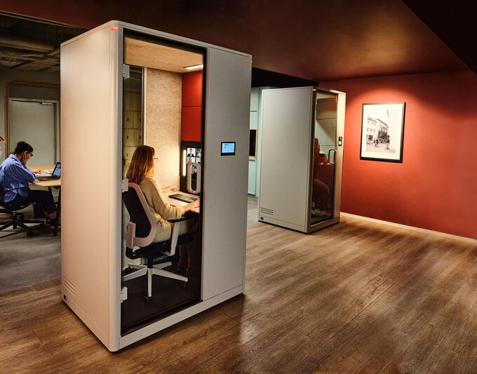 The acoustic cabins combine functionality and flexibility in a modern design tailored to the needs of today's work environment. They promote privacy and concentration while providing an efficient solution for meetings. »Calma For U« impresses with thoughtful features such as broadcast lighting and touchscreen controls, perfectly suited to modern working methods.