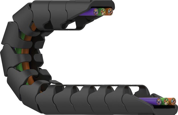 Cable carrier for guiding cables (monitor, power supply unit, keyboard & mouse etc.) on height-adjustable desks or in offices in general. It is characterized by an oval shape with an elegant matt surface. It also has a simple design that blends unobtrusively into any office. When straight, it is closed on one side, which makes it look more calm and tidy. Links that are not completely closed guarantee easy filling. In addition, the cable carrier can be easily attached to metal parts of the furniture using soft padded magnets without damaging them.