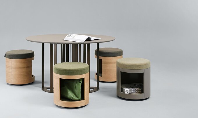 The ZooZoo occasional tables and poufs have a well-thought-out design that makes the user feel comfortable and the furniture easily adaptable to different situations. In lounge areas, tables are often only suitable for holding a cup of coffee, so when informal conversations turn into project discussions, they become uncomfortable because of their low height. The interior designer Annie Lee decided to solve this problem by creating an occasional table with an atypical height of 69 cm. The compact ZooZoo poufs can be hidden under the table and used to store small items such as a handbag.