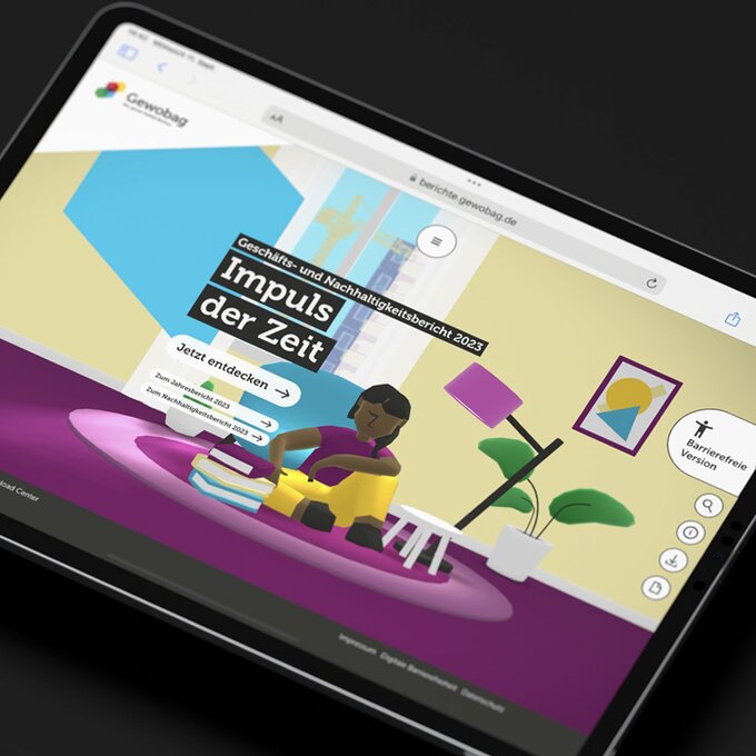 The year 2023 was characterized by numerous inspiring impulses, many of which were initiated by Gewobag itself - in the neighbourhoods, in a changing Berlin and within the company. The report invites you to take an interactive look back at the past year. In addition to a quick and comprehensive overview of the annual financial statements and key sustainability figures, the image section is the communicative highlight. In the form of a point-and-click adventure, it takes visitors on a playful journey through a virtual neighbourhood that reveals a variety of connections to the reality of Gewobag.