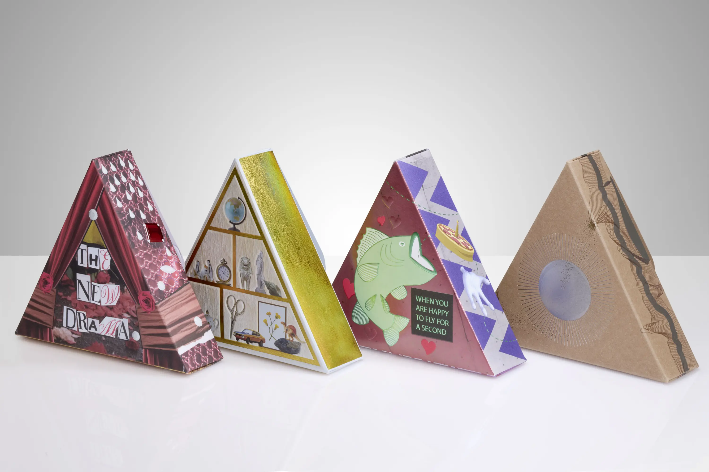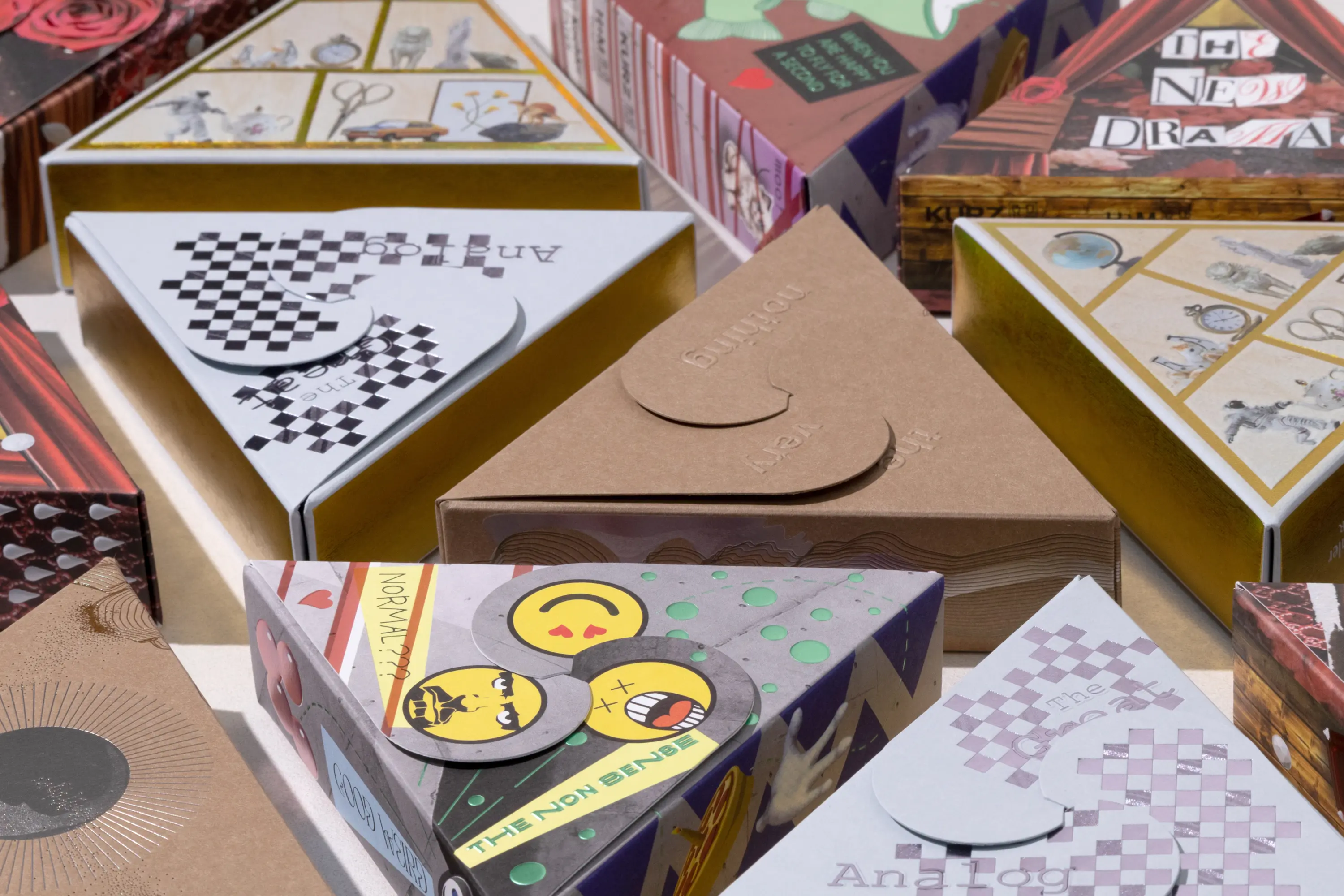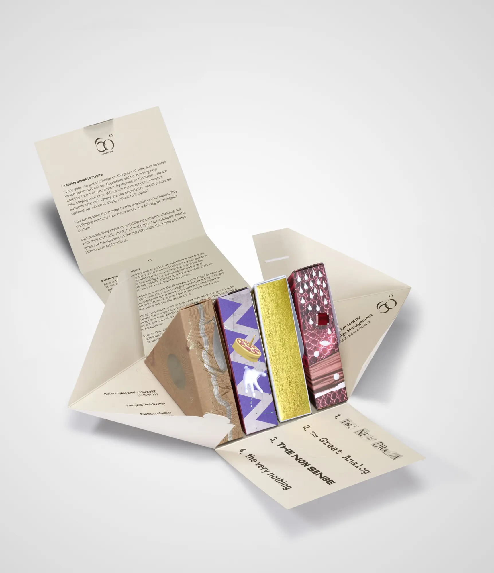A packaging series designed to inspire and inform the creative industry. Each year we research which sociocultural developments give rise to new creative expressions. This look into the future is a game with time: where will the next seconds, minutes, hours lead us? 60 seconds per minute, 60 minutes per hour. We engage with time and explore themes that we translate into packaging with a 60-degree interlocking system. Prism-like, they break conventional patterns and differ in optics and tactility. On the outside, applying hot stamping, matte, glossy, or transparent finishes. In the inside, informative texts.