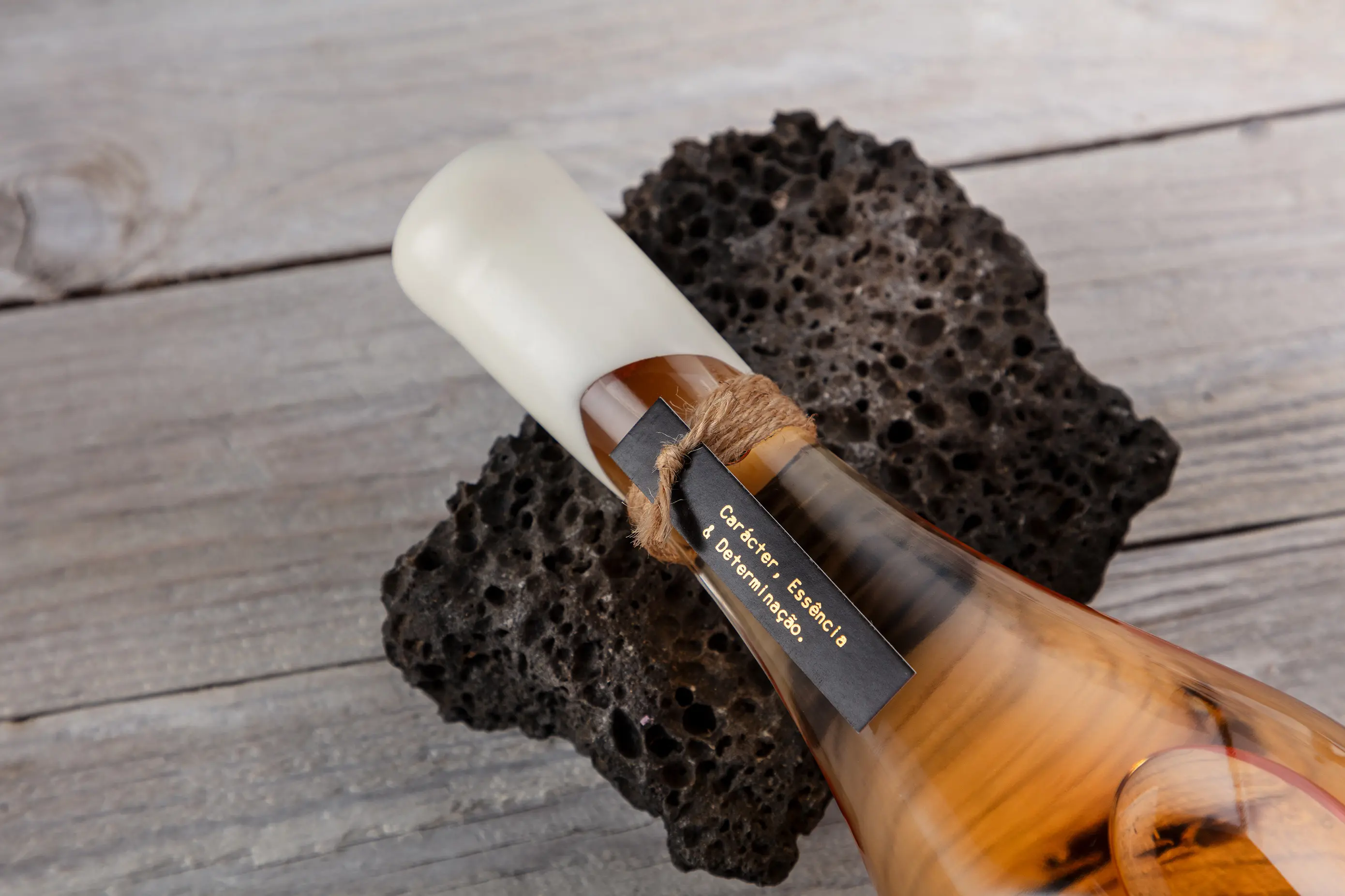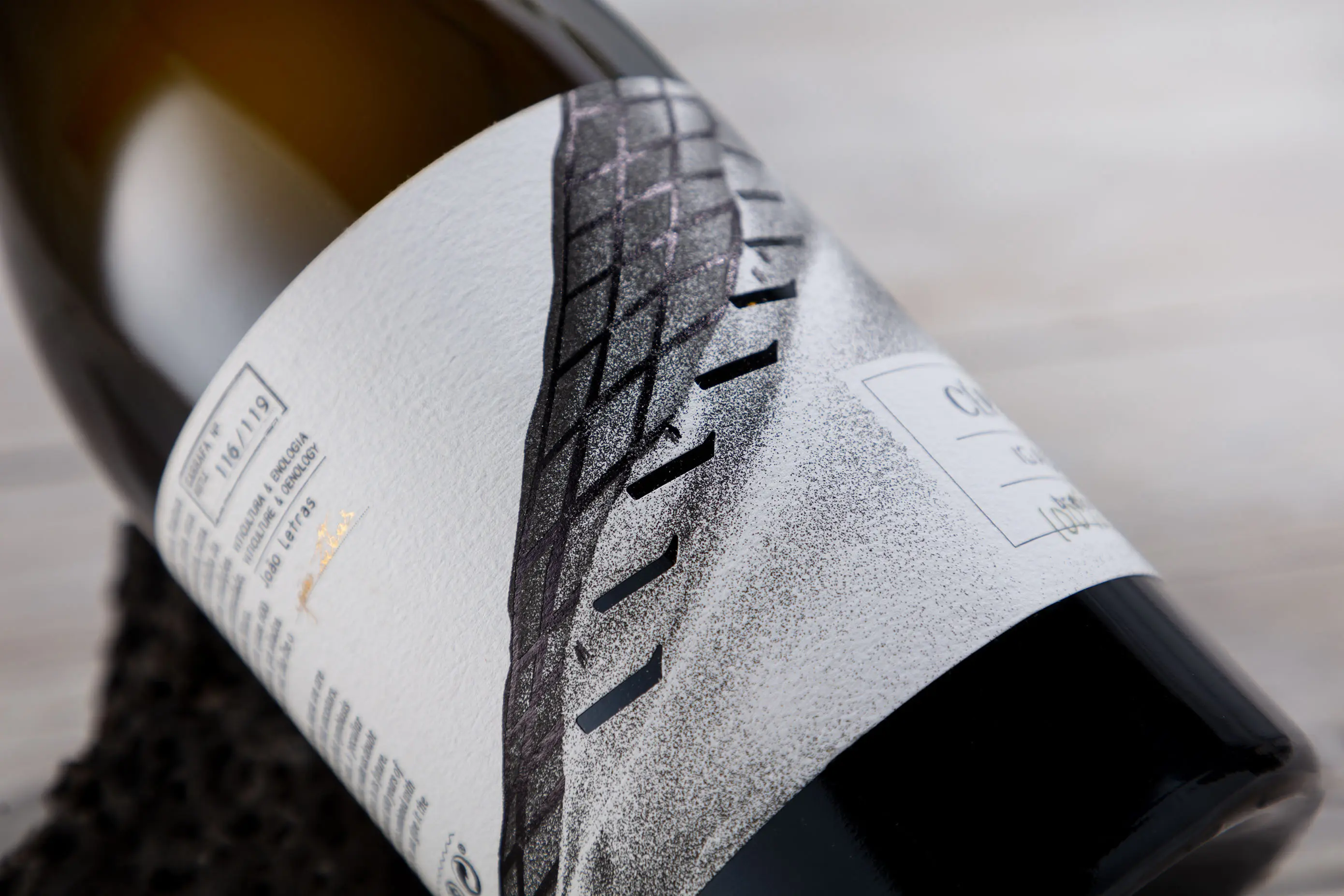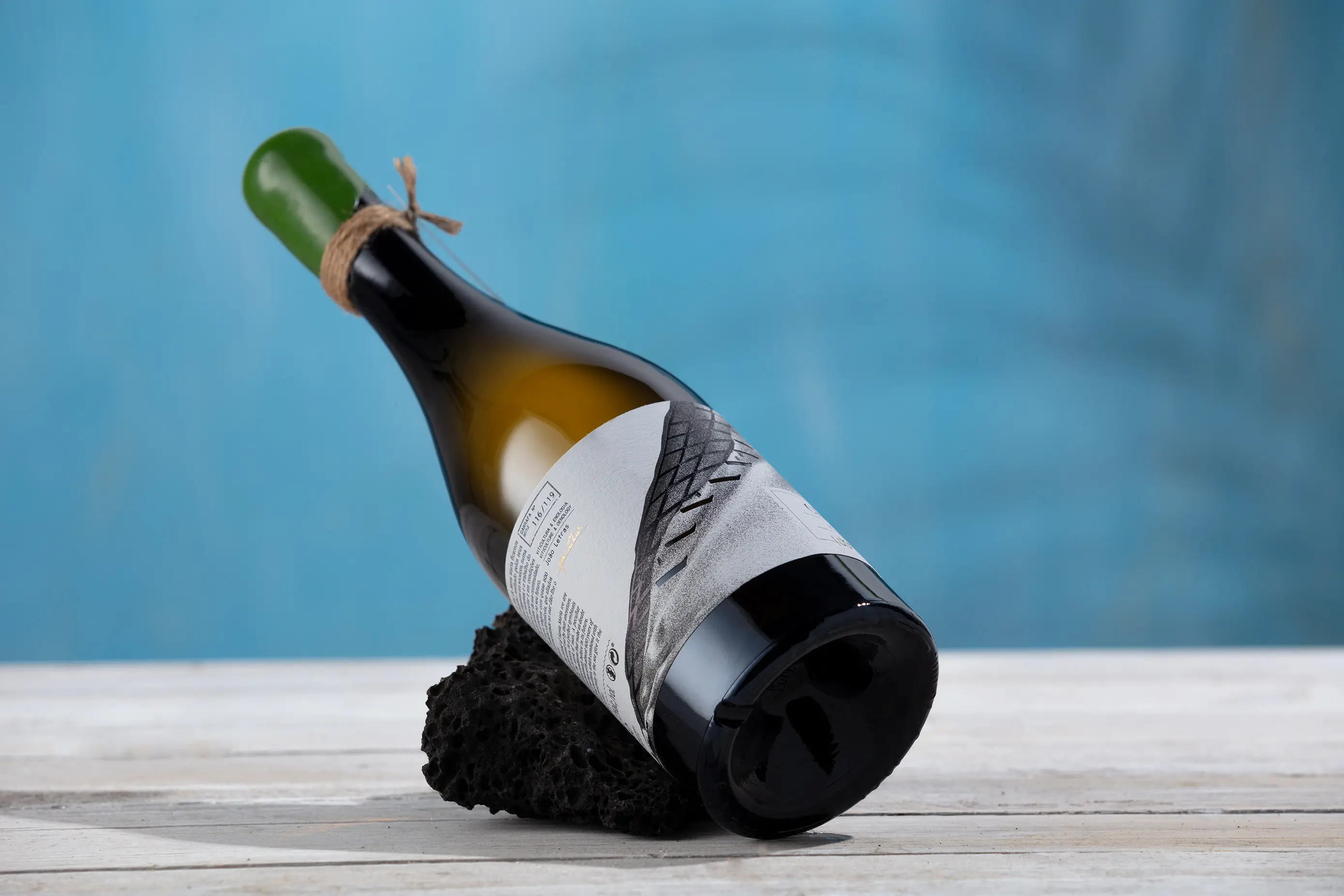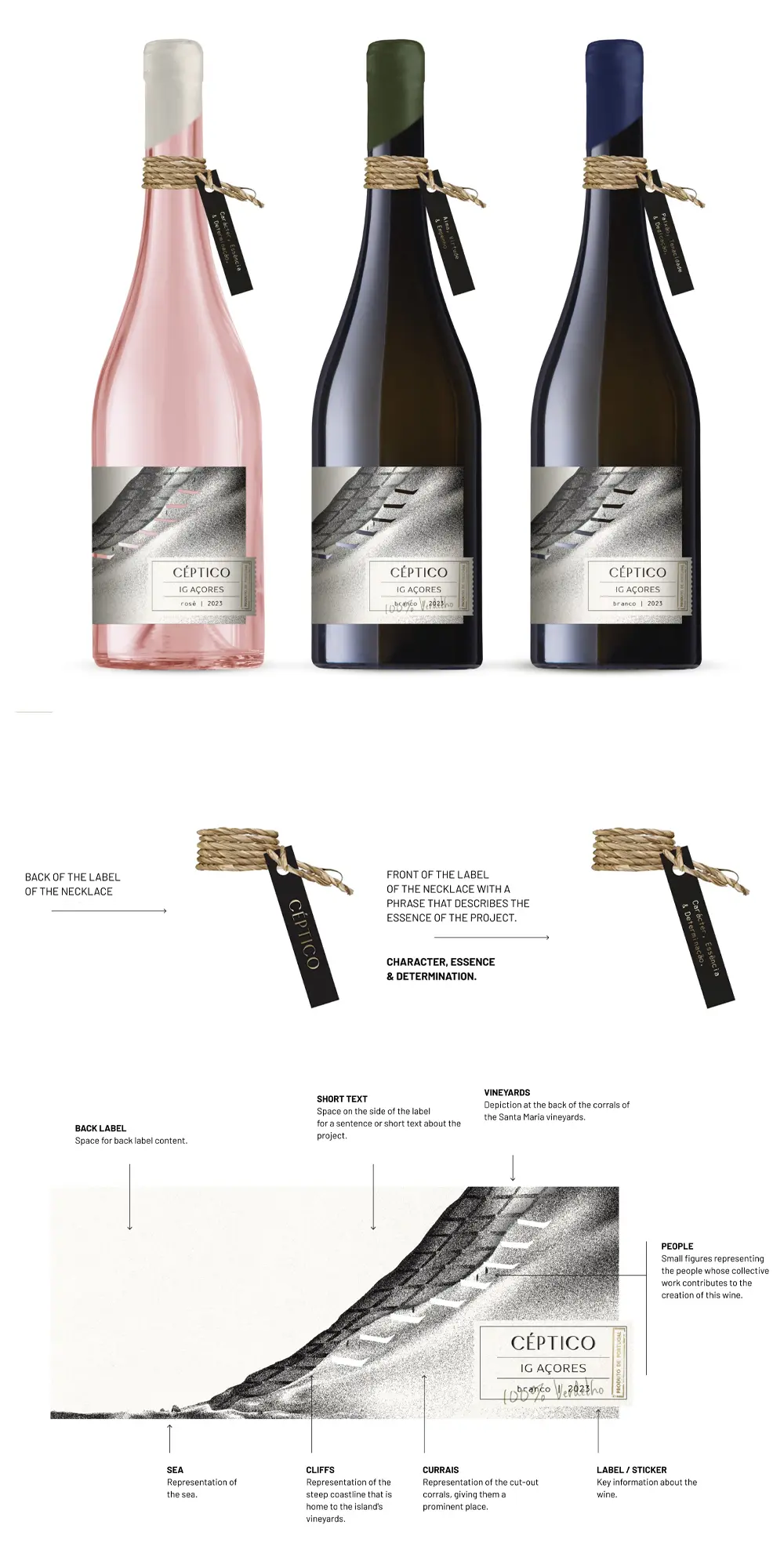 Born on a volcanic land embraced by the Atlantic, this label pays tribute to 600 years of winemaking on Santa Maria Island, Azores. Inspired by its dramatic geography, the charcoal design evokes sea, cliffs, and hills, while discreet human figures symbolise collective labour. Die-cut “windows” suggest terraces and depth, turning the label into a tactile relief. Clean typography balances legibility with impact, while a rope around the neck recalls maritime tradition. A small handwritten tag adds warmth and authenticity to the minimalist, poetic identity.