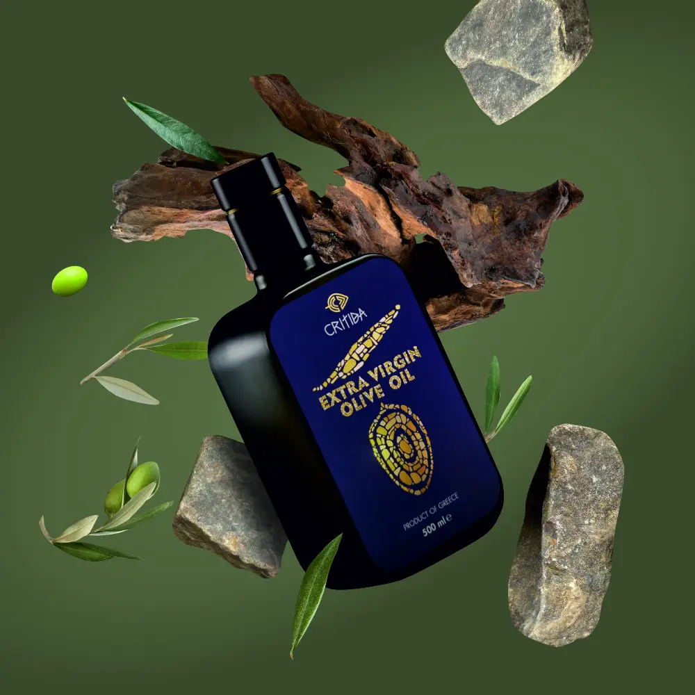 CRITIDA’s premium label pays homage to Crete’s traditional dry-stone walls, recognized by UNESCO as Intangible Cultural Heritage of Humanity. A deep Mediterranean blue fills the space, while golden geometric motifs depict an olive branch and olive, built piece by piece like dry-stone masonry. Each golden detail acts as a “design stone,” symbolizing the “liquid gold” of olive oil. This globally resonant design carries the soul of the land. CRITIDA is considering Braille integration to ensure accessibility for visually impaired users.