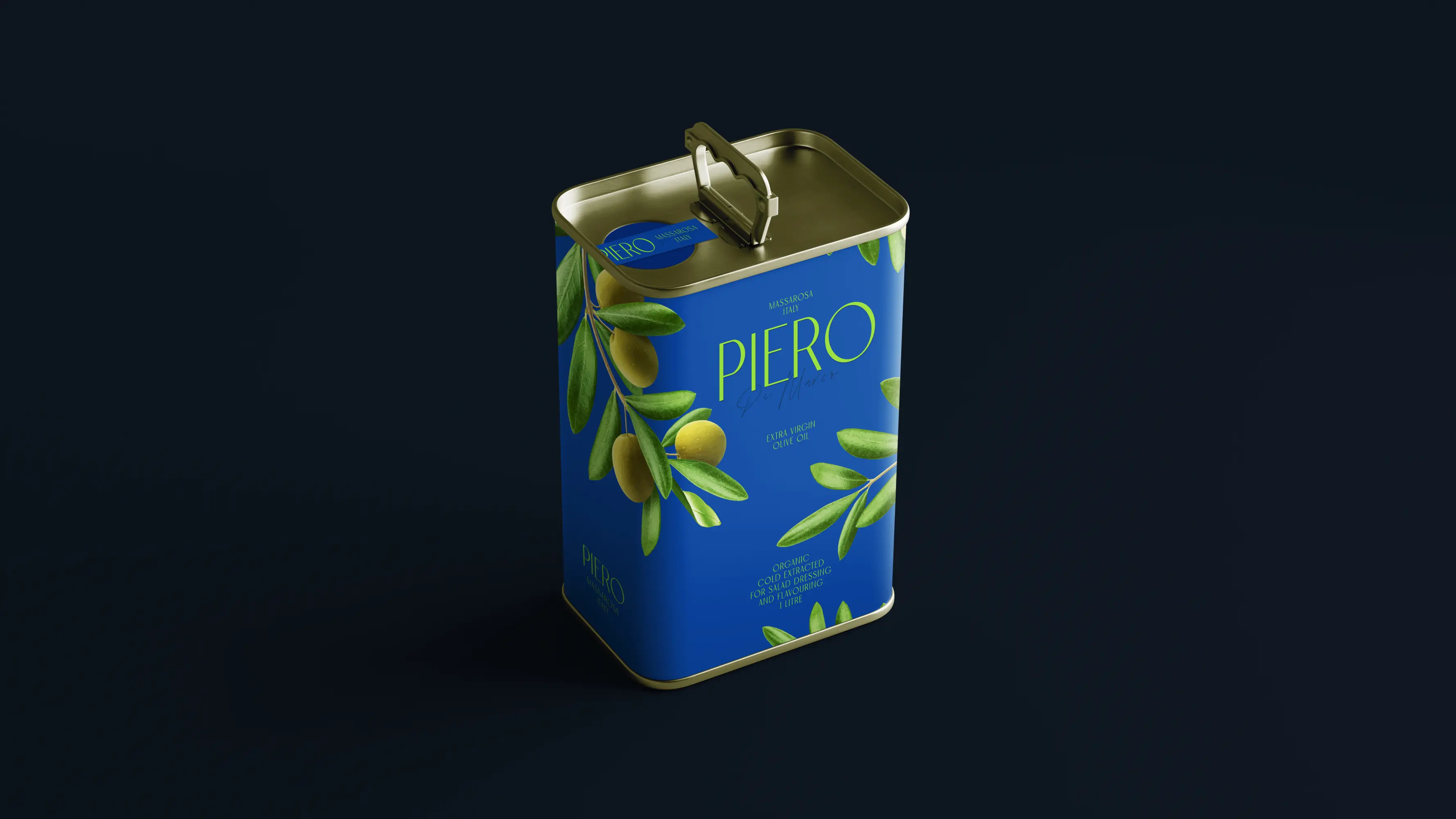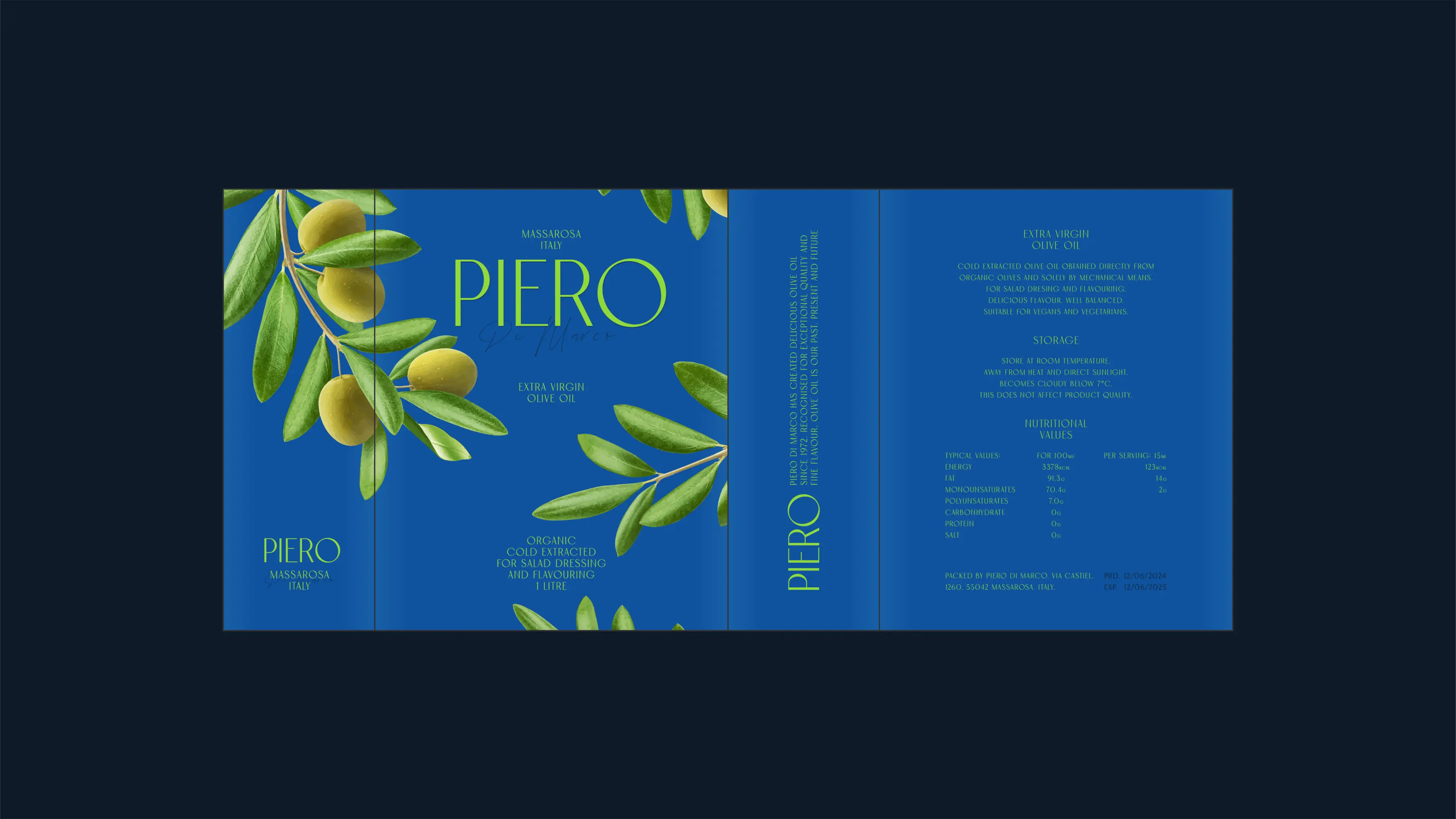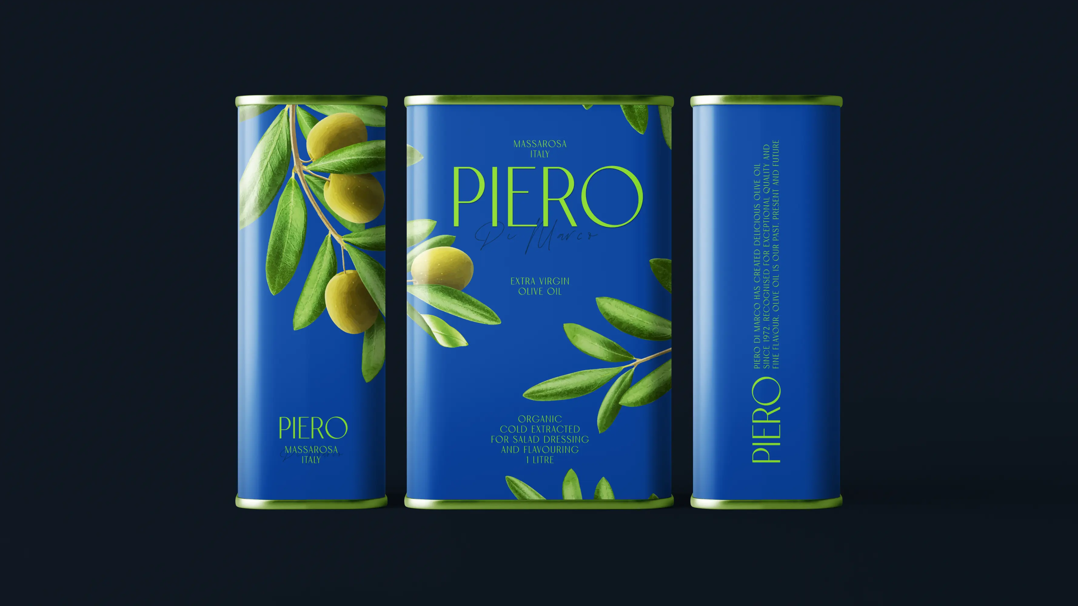 Olive oil packaging often leans to deep browns and greens to suggest richness and authenticity, leading to dull sameness on shelves. To reflect PIERO’s artisanal and organic values while standing out, this design takes a fresh approach. It found inspiration from the serene beauty of olive groves—branches gently swaying against a clear sky. This evocative scene, brought to life through detailed illustrations and a refreshing, majestic jewel-toned blue as primary colour, evokes a sense of natural, unadulterated purity echoing brand commitment, forming a clean, refined visual identity that is both striking and timeless.