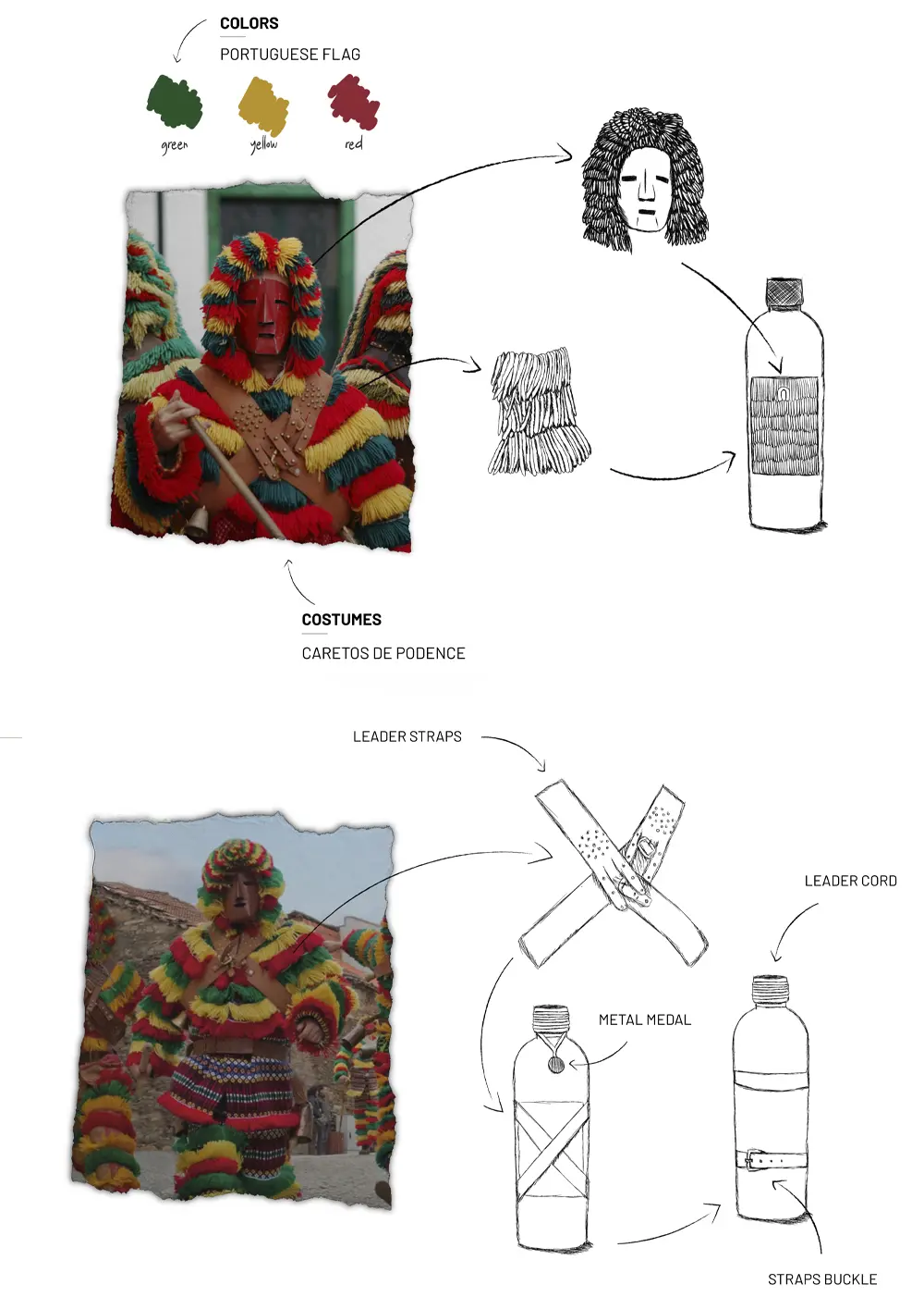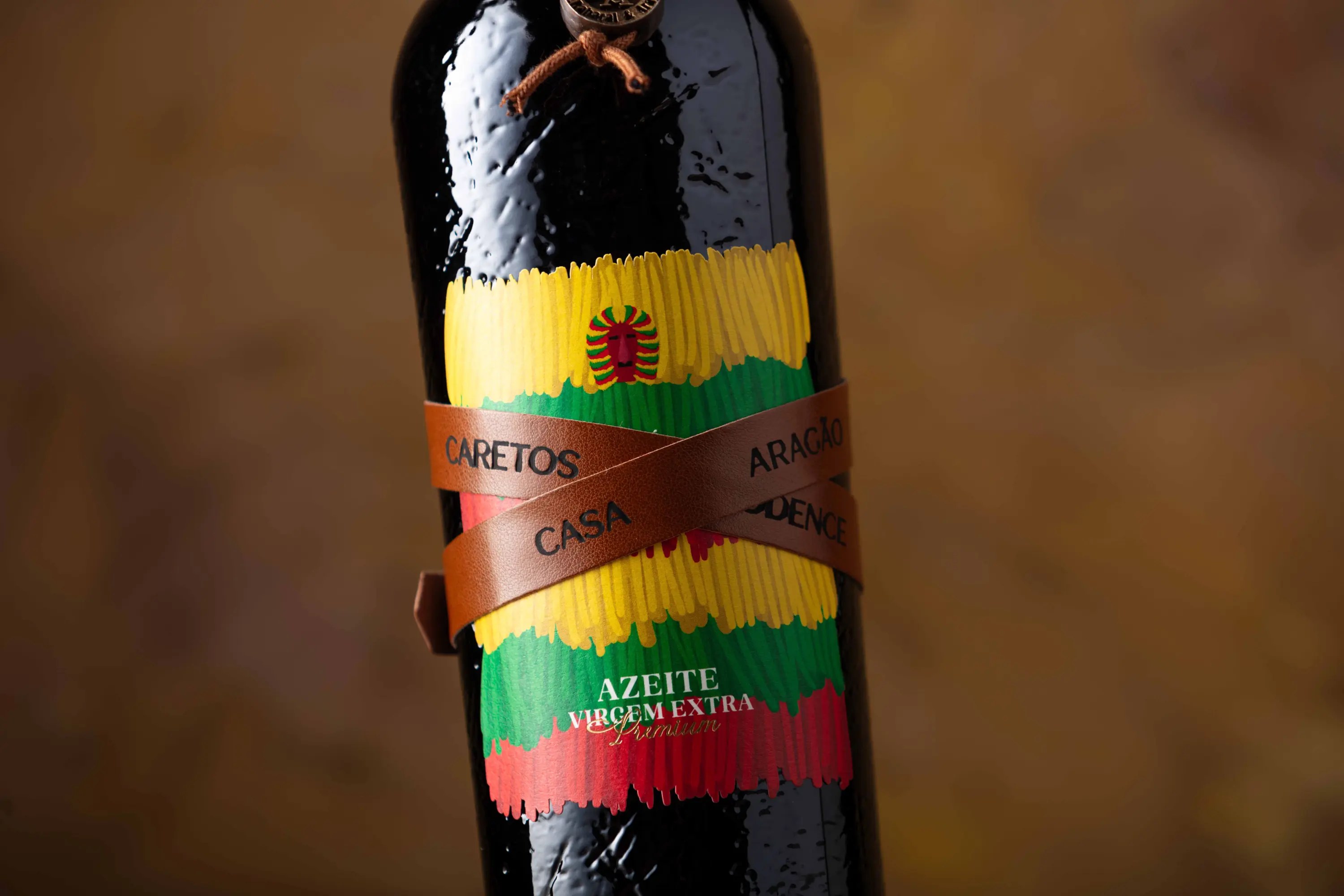 Inspired by the iconic traditional costumes of the Caretos de Podence, UNESCO-recognised protagonists of the Entrudo Chocalheiro, this project translates ancestral heritage into contemporary packaging. Wool fringes, quilt-like textures, and the vivid colours yellow, green, and red connect to Portuguese identity. Leather straps embrace the bottle, engraved with Casa Aragão’s signature, while recycled cork and metal closures reflect sustainability. A cork-handled box extends the narrative, merging tradition and design into an immersive, sensorial experience that honours cultural roots.