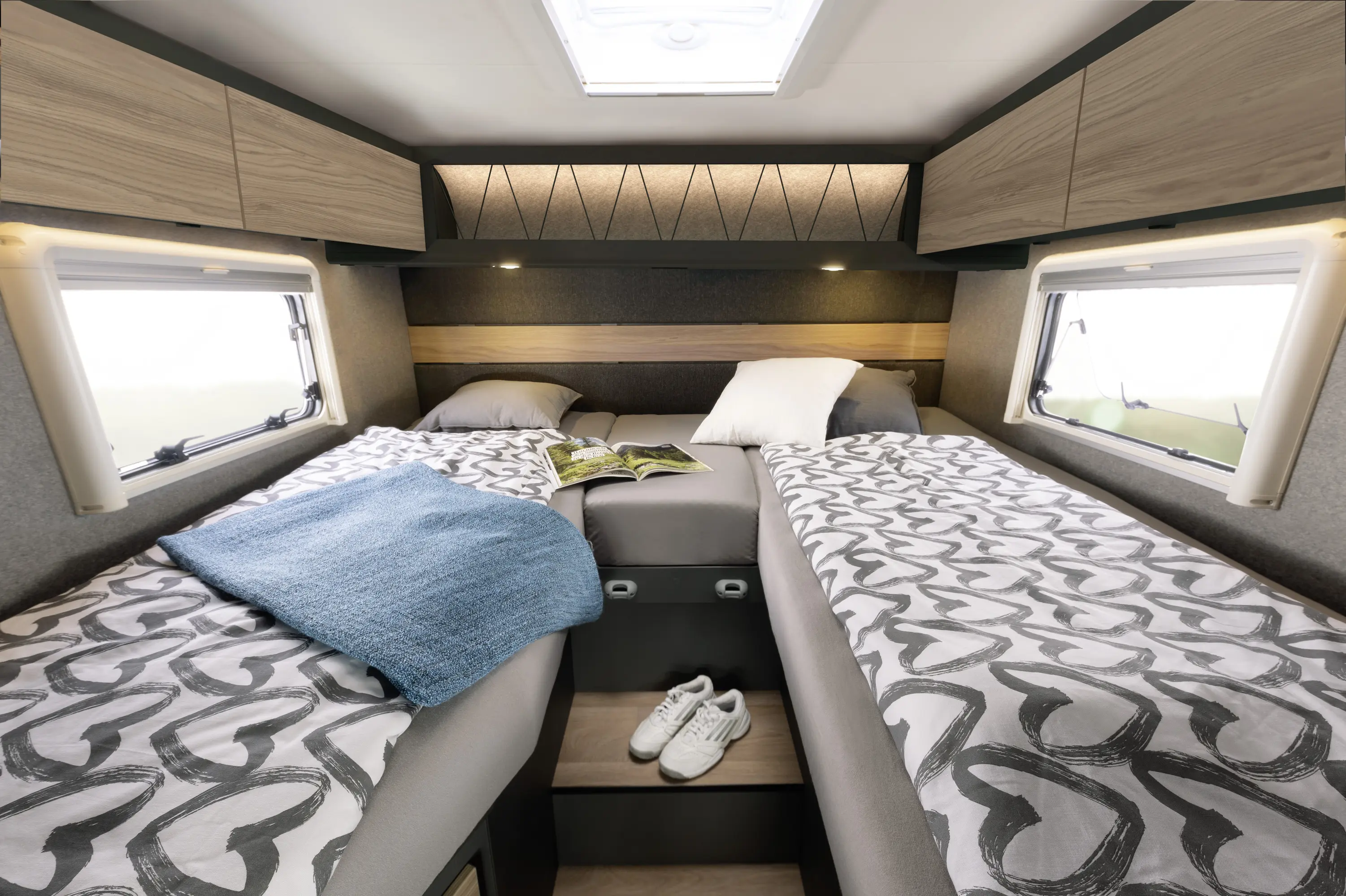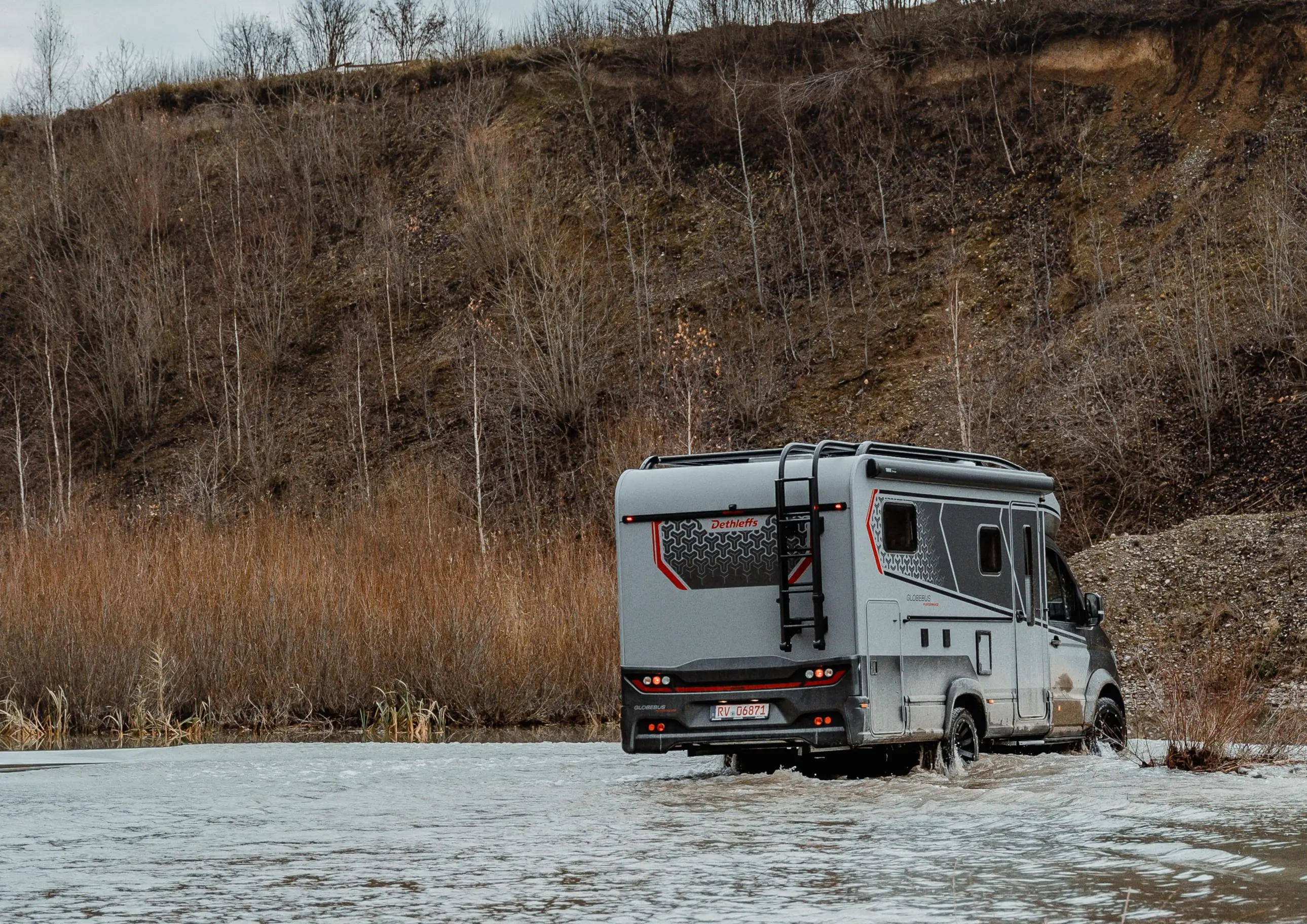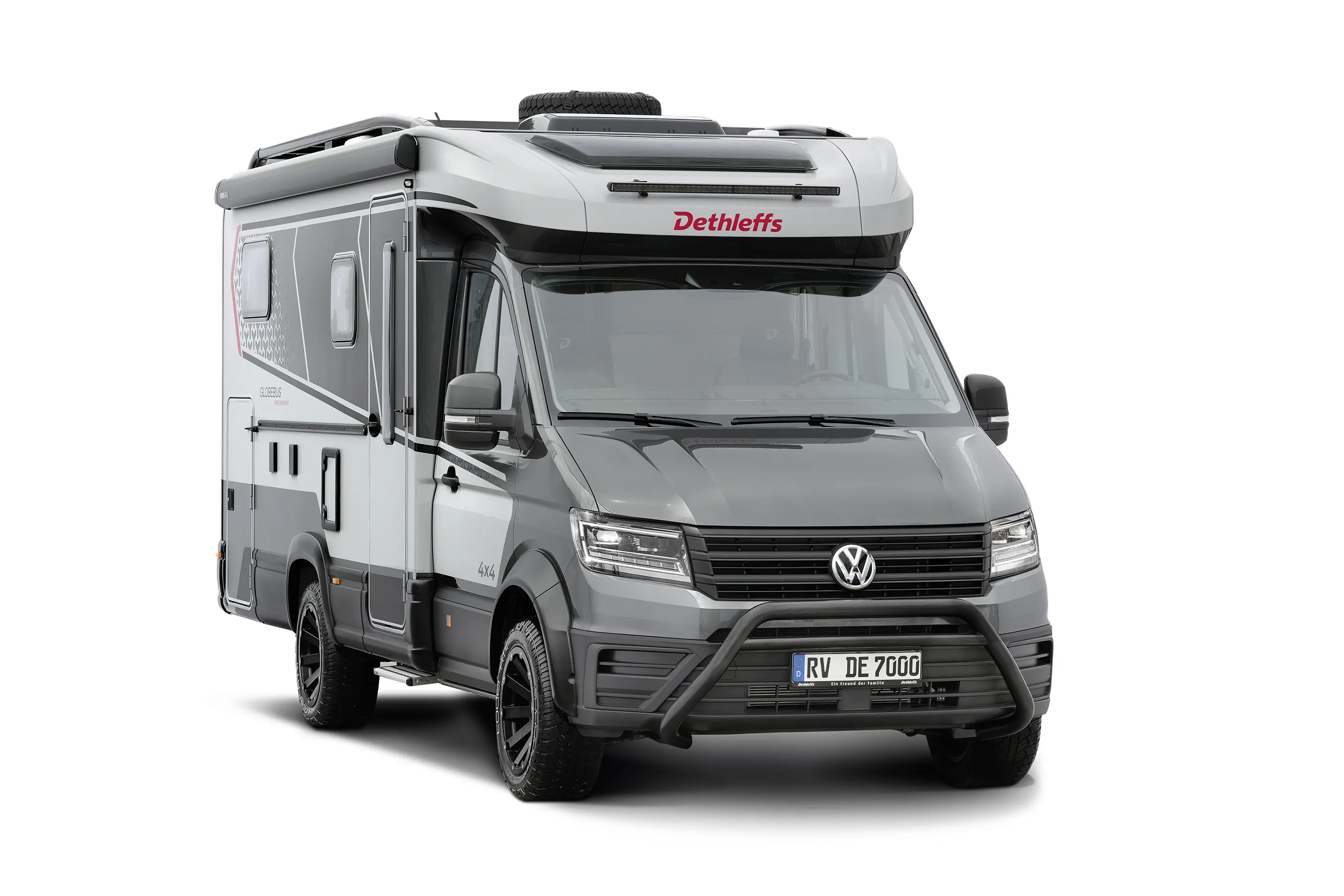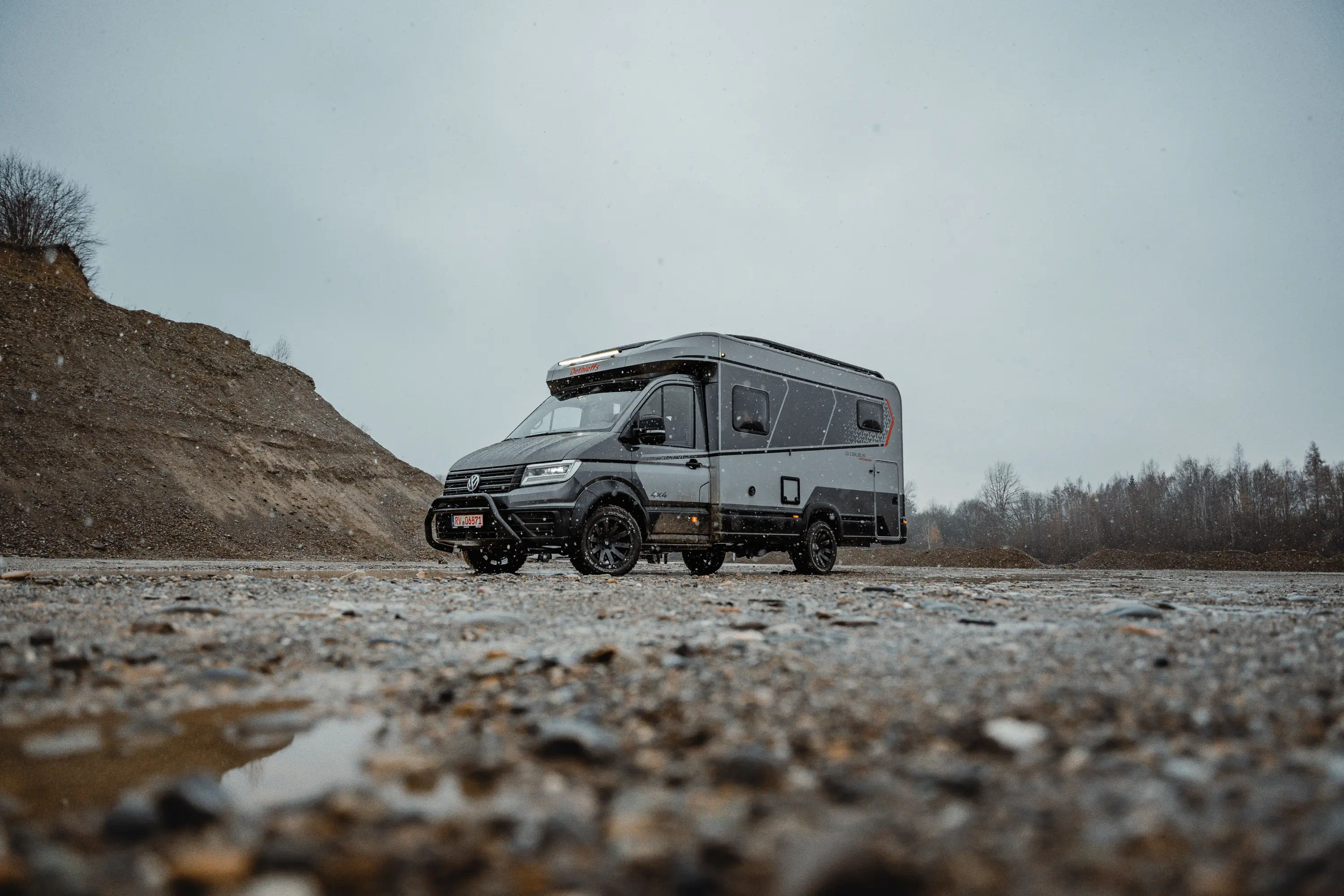 The Dethleffs Globebus Performance 4x4 combines off-road capability with sustainable travel in a compact motorhome. Key features like all-wheel drive, high battery capacity, efficient diesel heating, and an eco-friendly dry toilet enable low-impact, off-grid journeys. Durable materials support long-term use, reducing waste. Its rugged design and smart functionality make it the perfect choice for modern adventurers seeking freedom, comfort, and environmental responsibility. Striking “Action Grey” paint, matte black details, and bold off-road elements create a powerful aesthetic that unites style with performance.