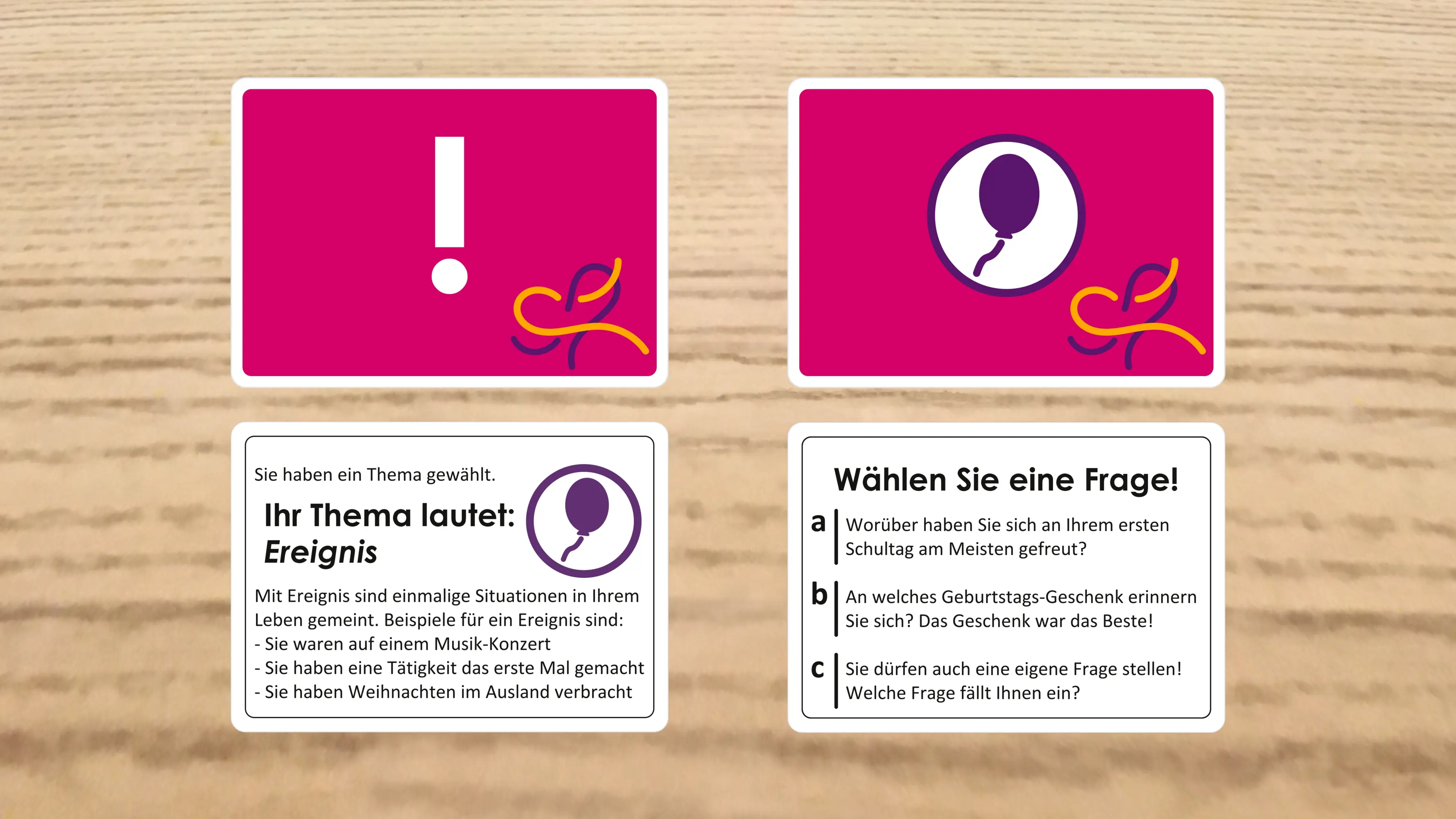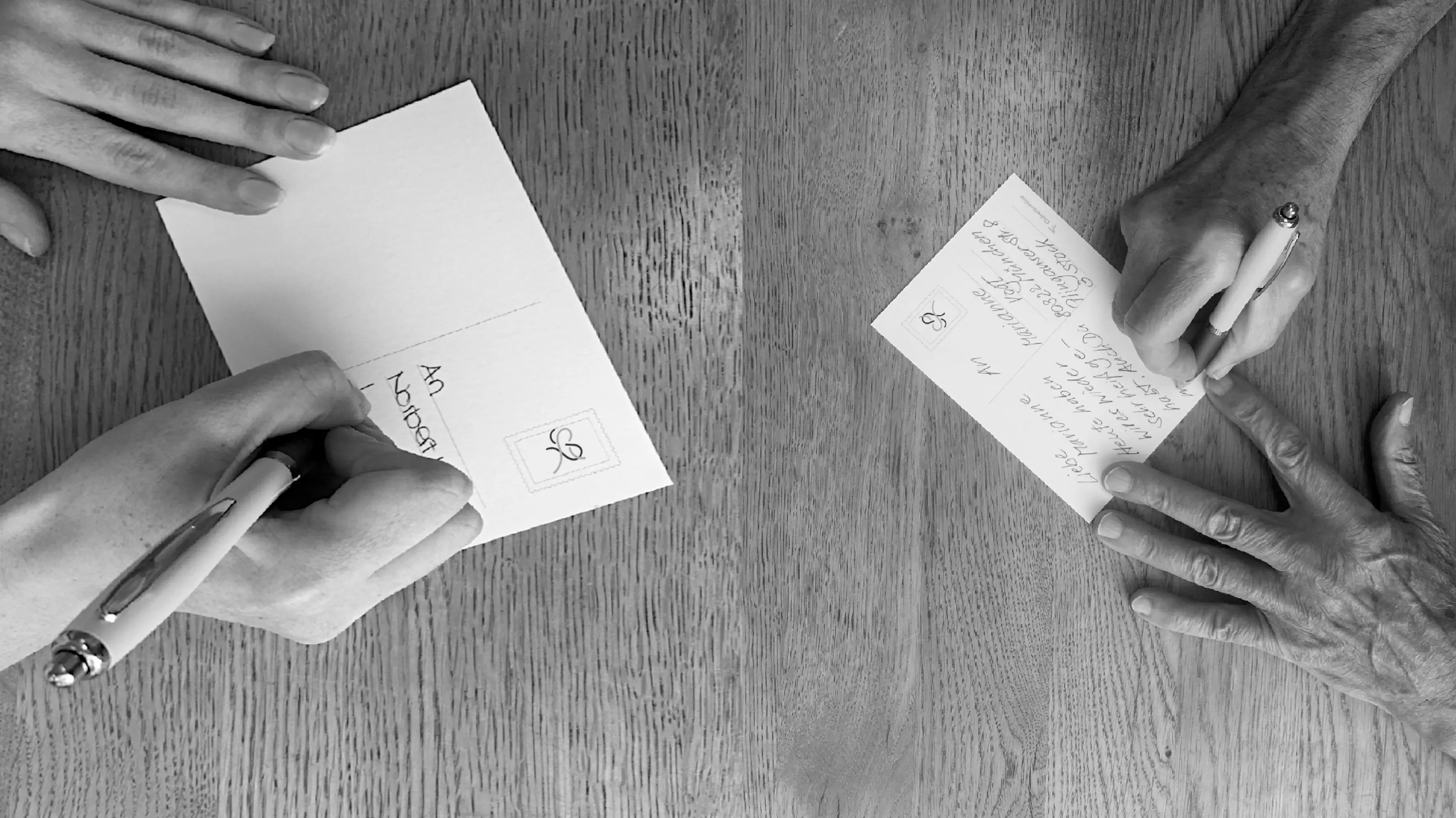 “Forget-me-not”. Integrating senior citizens more strongly. Creating opportunities for deeper exchange by deliberately choosing non-digital means. Represented by: the knot that connects two people – old and young. Opposing perspectives? The exchange offers plenty of advantages for both sides. The GeLiNu study by GESIS shows that, from the age of 50, the likelihood of losing reading competence increases. Prevention? Regular reading and writing! With a postcard and so-called “starter cards,” consisting of topic cards and question cards, the conversation gains momentum. The cards are designed according to DIN 33429.