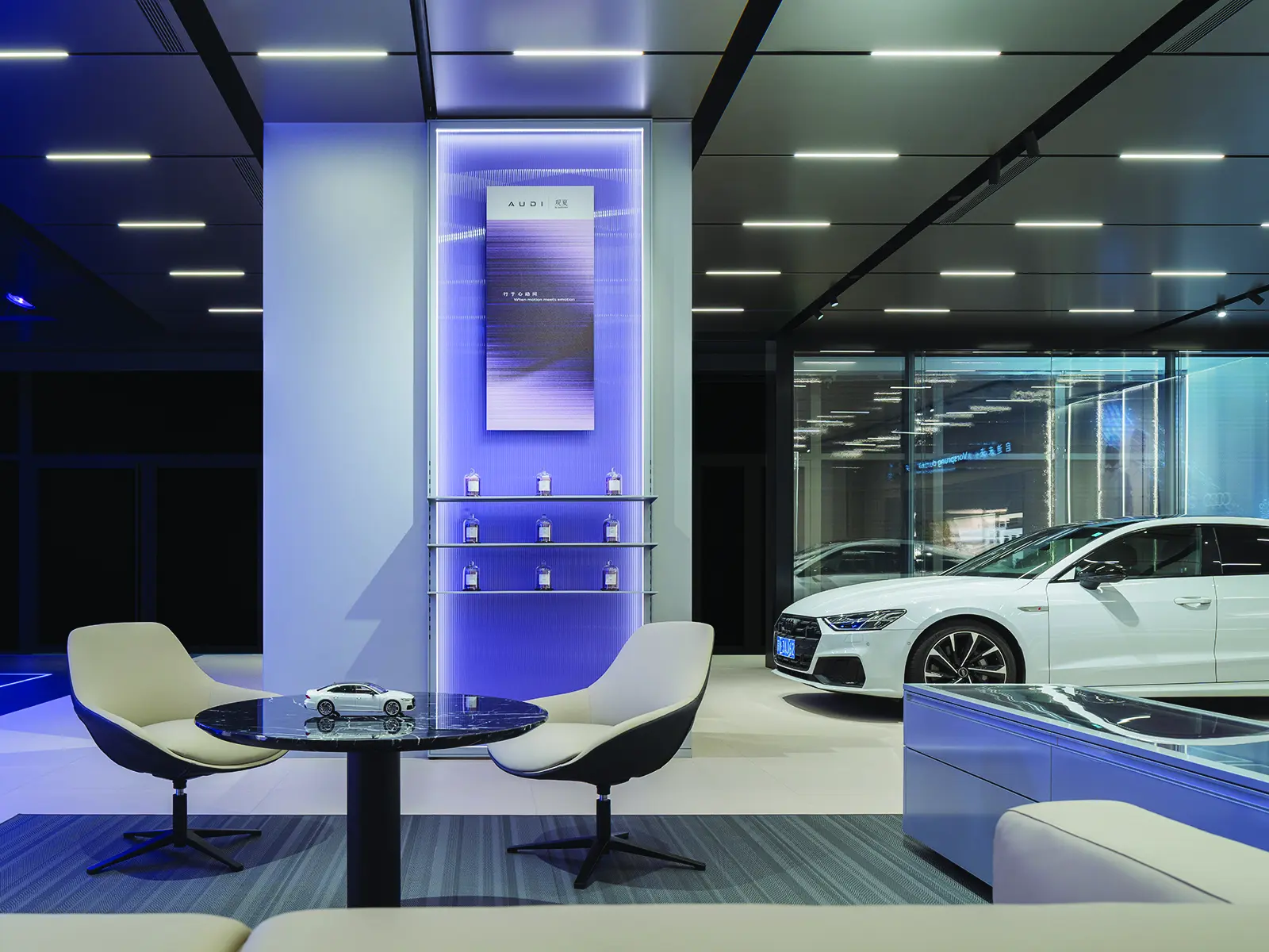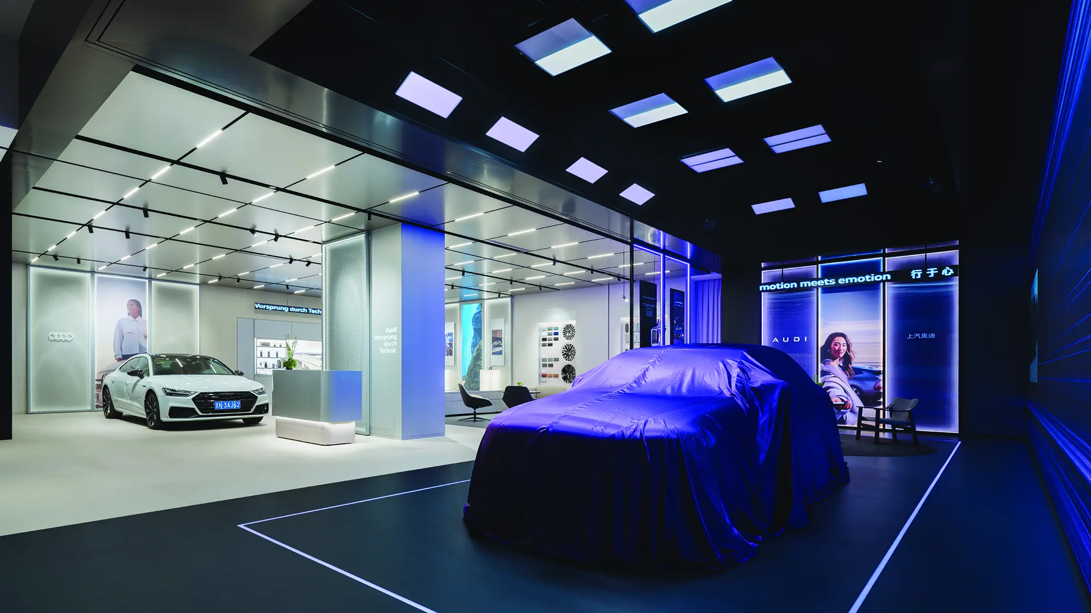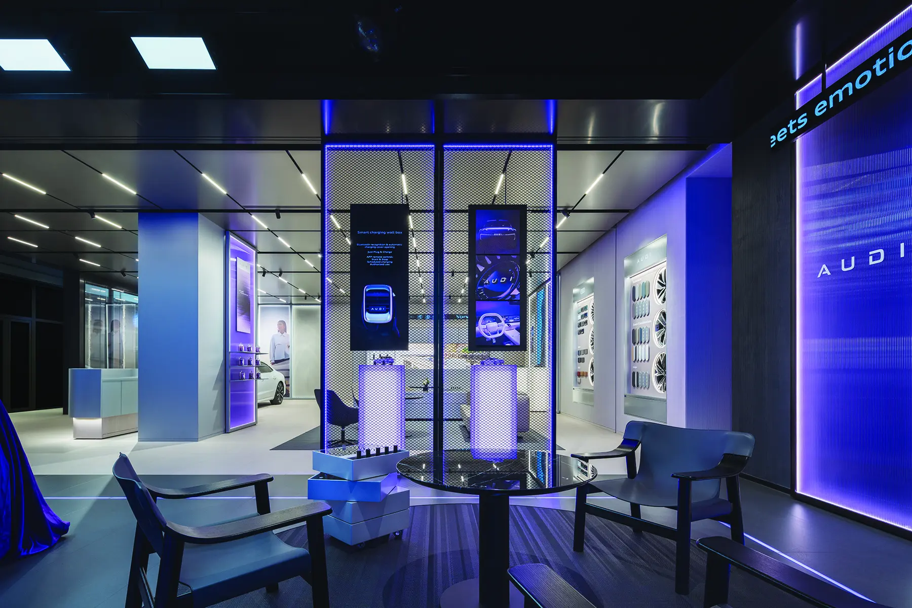 Audi takes a bold step in China with “AUDI,” a new EV sub-brand launched without the four-ring logo, targeting younger, tech-savvy audiences. Developed with SAIC, the debut E5 Sportback embodies minimalist, tech-driven design. anySCALE reimagined retail with the AUDI Runway, a cinematic stage with dynamic backdrops and full-spectrum lighting, optimized for live streaming and emotional sales. Gallery-like showrooms feature translucent partitions, digital tools, physical samples, and personalization, blending technology and sophistication into a new premium automotive retail experience.