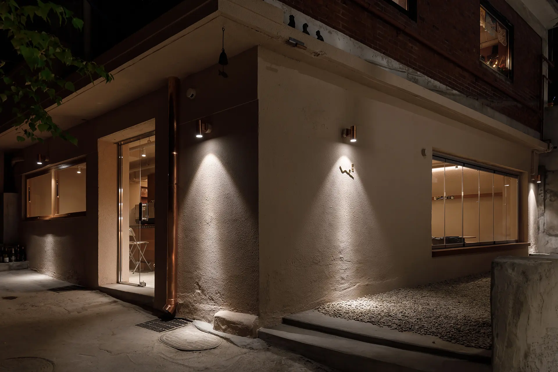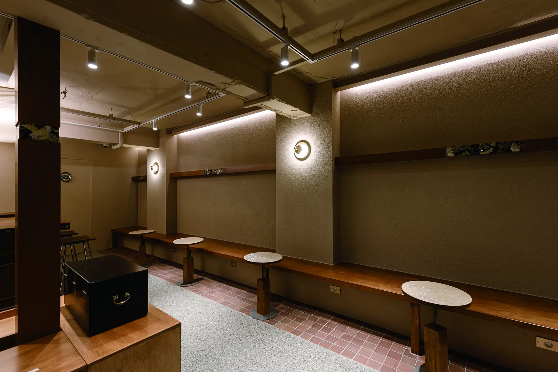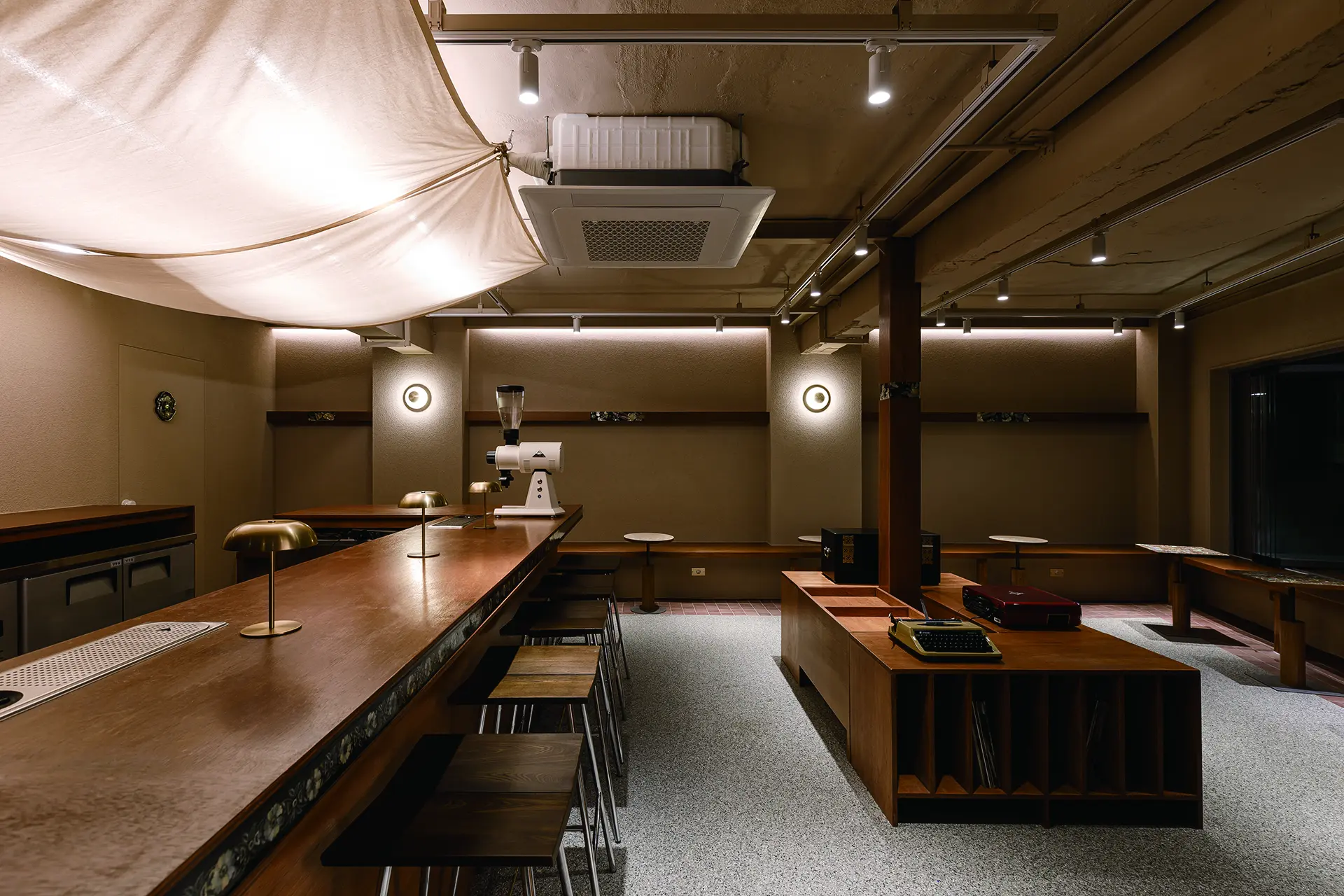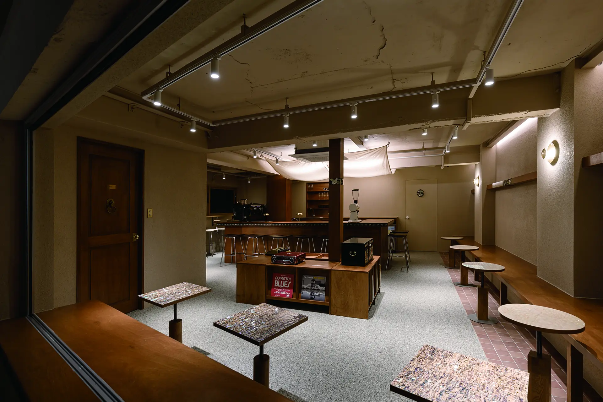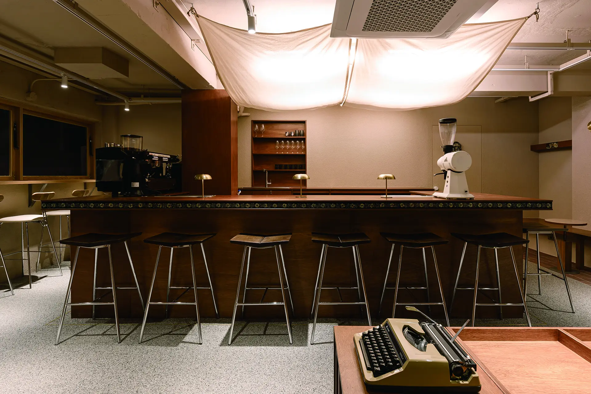 In Café Gaebang, the coffee bar is placed at the centre of the space, so guests seated around the perimeter can view the entire café at a glance. To highlight this central area, the ceiling was designed as a canopy, evoking the festive mood of a madangnori celebration. Narrative elements tied to Korean culture continue throughout the design. The mother-of-pearl furniture subtly reveals traces of the past through its decorations, handles, and patterns, inviting curiosity and storytelling.