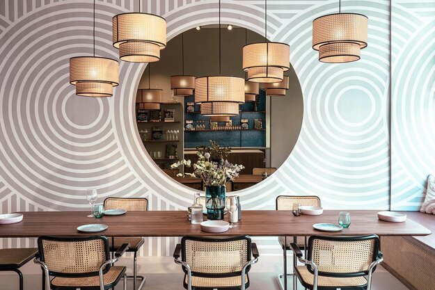 The name of the star chef and TV personality Ali Güngörmüş literally means "Look into the sun, look into the day." His cooking school complements his restaurants Pageou and Pera Meze in Munich. On 58 m², the school features two spacious rooms with street views and three more secluded areas. The design concept blends the sensual elegance of Pageou with the modern flair of Pera Meze. The cooking school focuses on high-quality materials, a well-thought-out lighting concept, and an open kitchen. The spaces are inspired by oriental elements and colours from Ali’s homeland, creating a unique atmosphere.