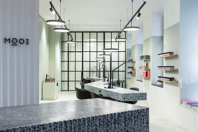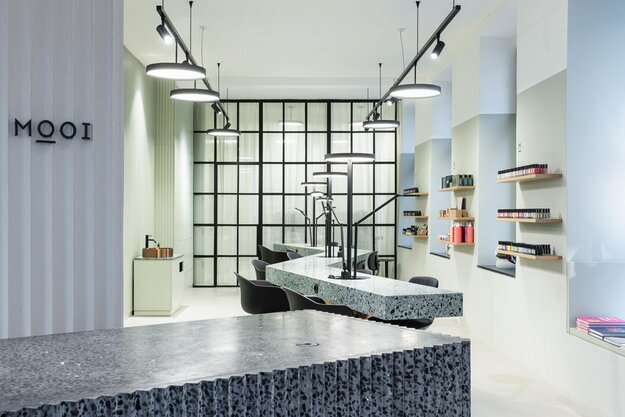 MOOI, a "Beauty & Concept Store" in the Viennese 8th district, impresses with a clear, urban design that becomes immediately apparent upon entry. The reception counter, which extends as a bar, is made of black, jagged terrazzo supported by copper bases, and is complemented by a backdrop of curved concrete arches. This interplay of natural materials like wood and stone in delicate green tones creates a welcoming and cosy atmosphere. The concrete floor coating and wavy wall cladding provide a calm base, while the various terrazzo and reflective copper elements add a touch of elegance to the space.