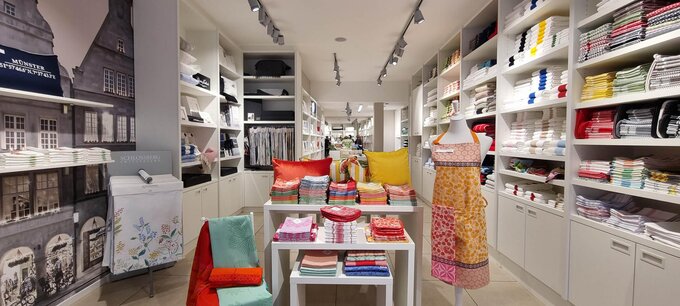 The N&K Bielefelder laundry store in Münster combines tradition and modernity through clear lines, high-quality materials and well-thought-out product presentation. The design and design of the furniture are deliberately reserved in order to bring the products into the focus of the customer. Bright materials with pleasant light create a relaxed atmosphere. The wall depicting historic gabled houses from Münster’s Prinzipalmarkt combines the design with local tradition. The overall concept conveys luxury, quality and regional identity.