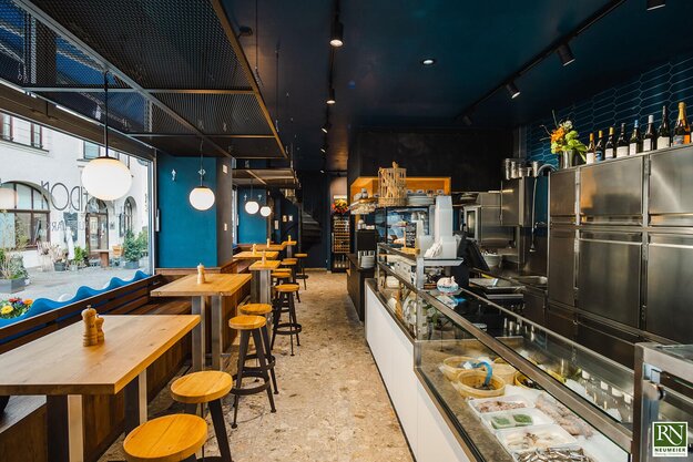 POSEIDON - a store with seating area in downtown Munich - was to be revitalized through core renovation and extensive remodelling, while preserving its cult status and tradition. The core idea of „ocean atmosphere“ was realized with a harmonious maritime concept that is reflected even in the details. Deep petrol blue walls, shell limestone flooring, and fish scale-like tiles form the foundation. Cognac-coloured wood elements create a rustic cabin charm, while stretch metal grids and pendant lights resembling bubbles enhance the ambiance in the details.