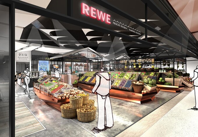 The concept of the Rewe Markt, in the planned shopping center of Unibail-Rodamco's Überseequartier, interprets Hamburg's values and culture in a modern and abstract way in order to offer customers a special shopping experience with all the senses. The design of the market is based on Hamburg's history as a port city and the defining architectural elements of the cultural Speicherstadt and Hamburg landmarks such as the Elbphilharmonie.