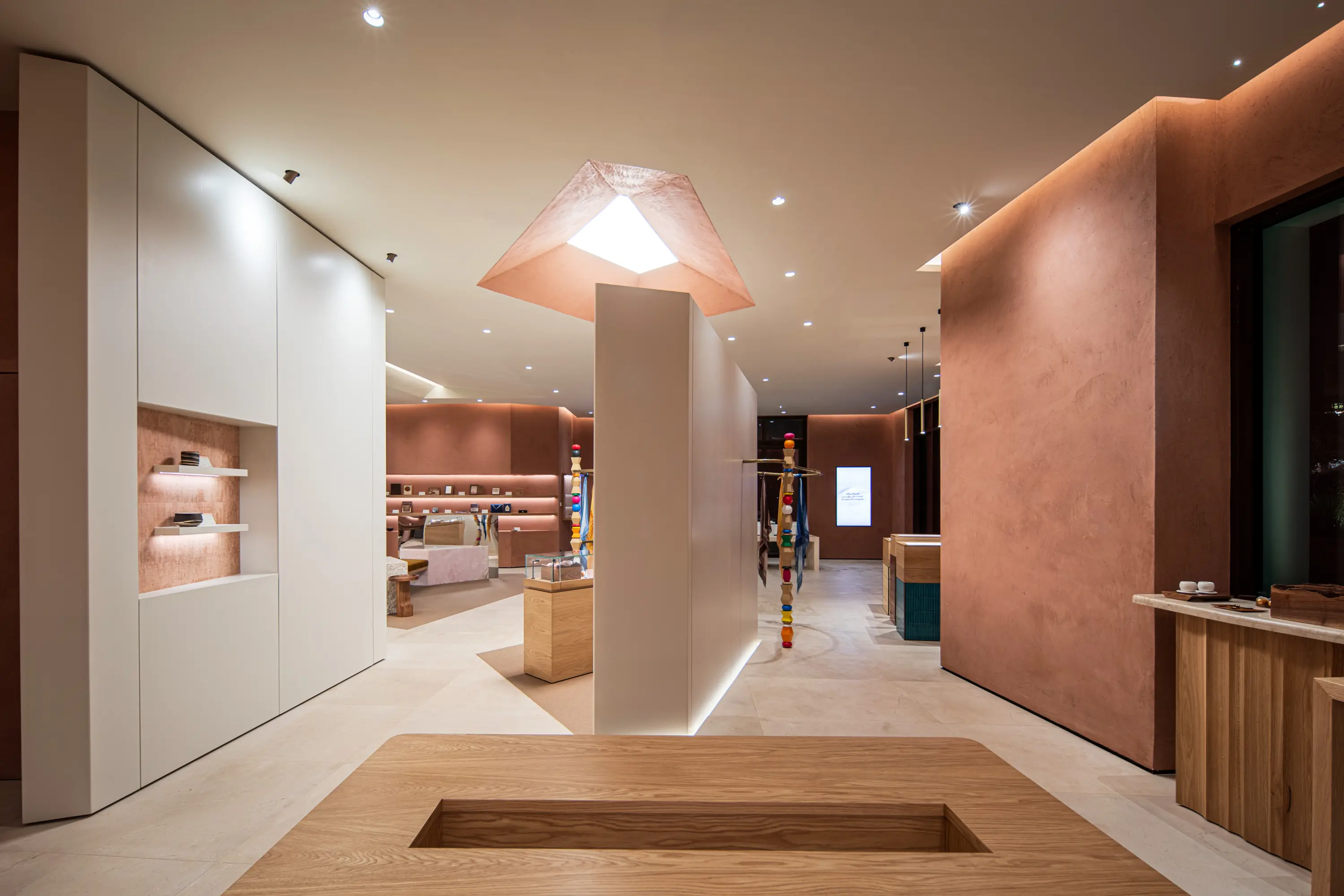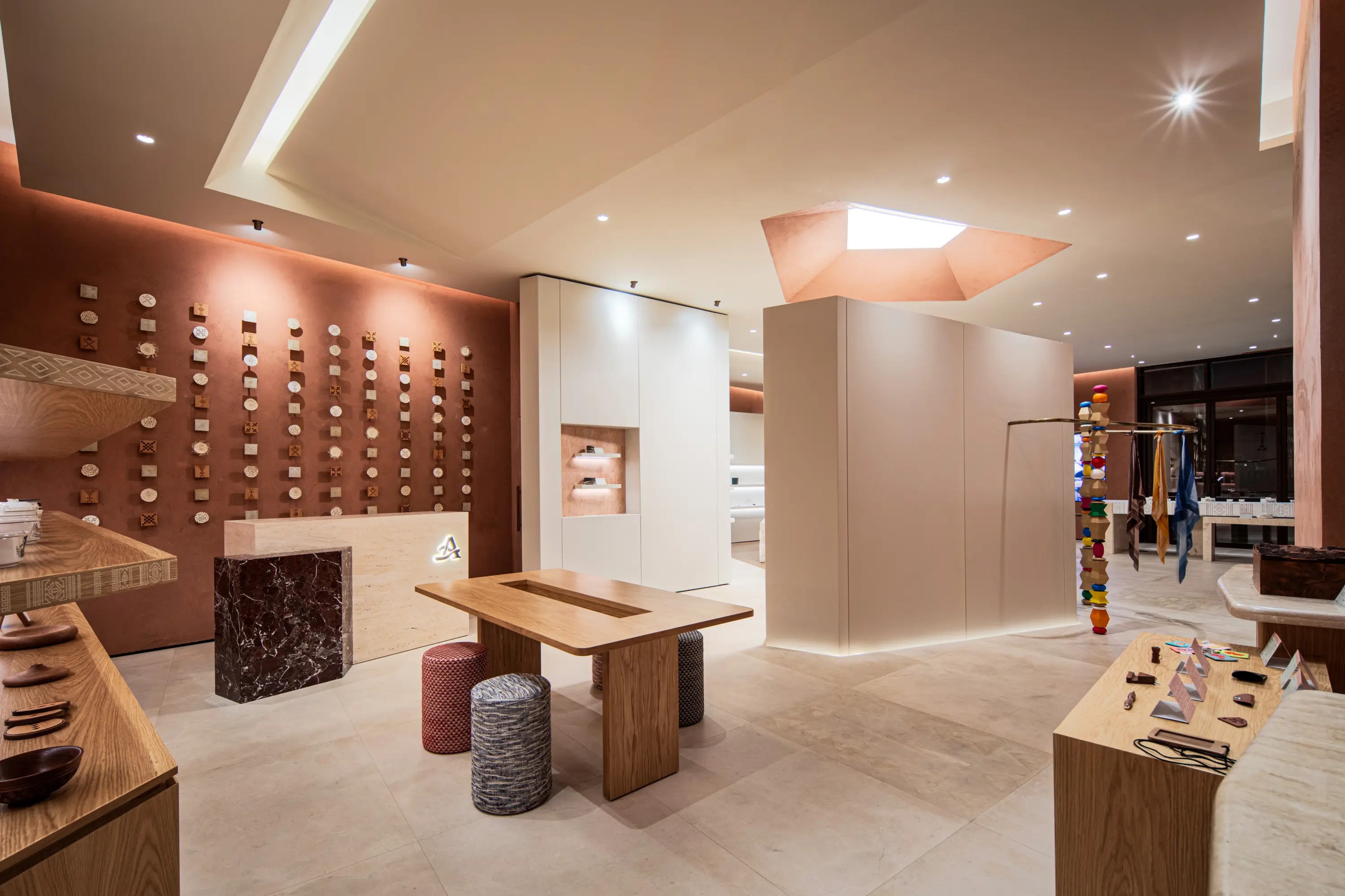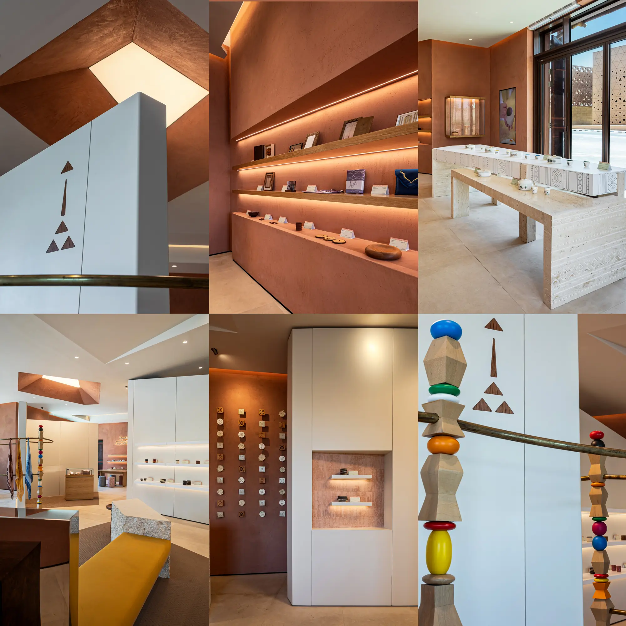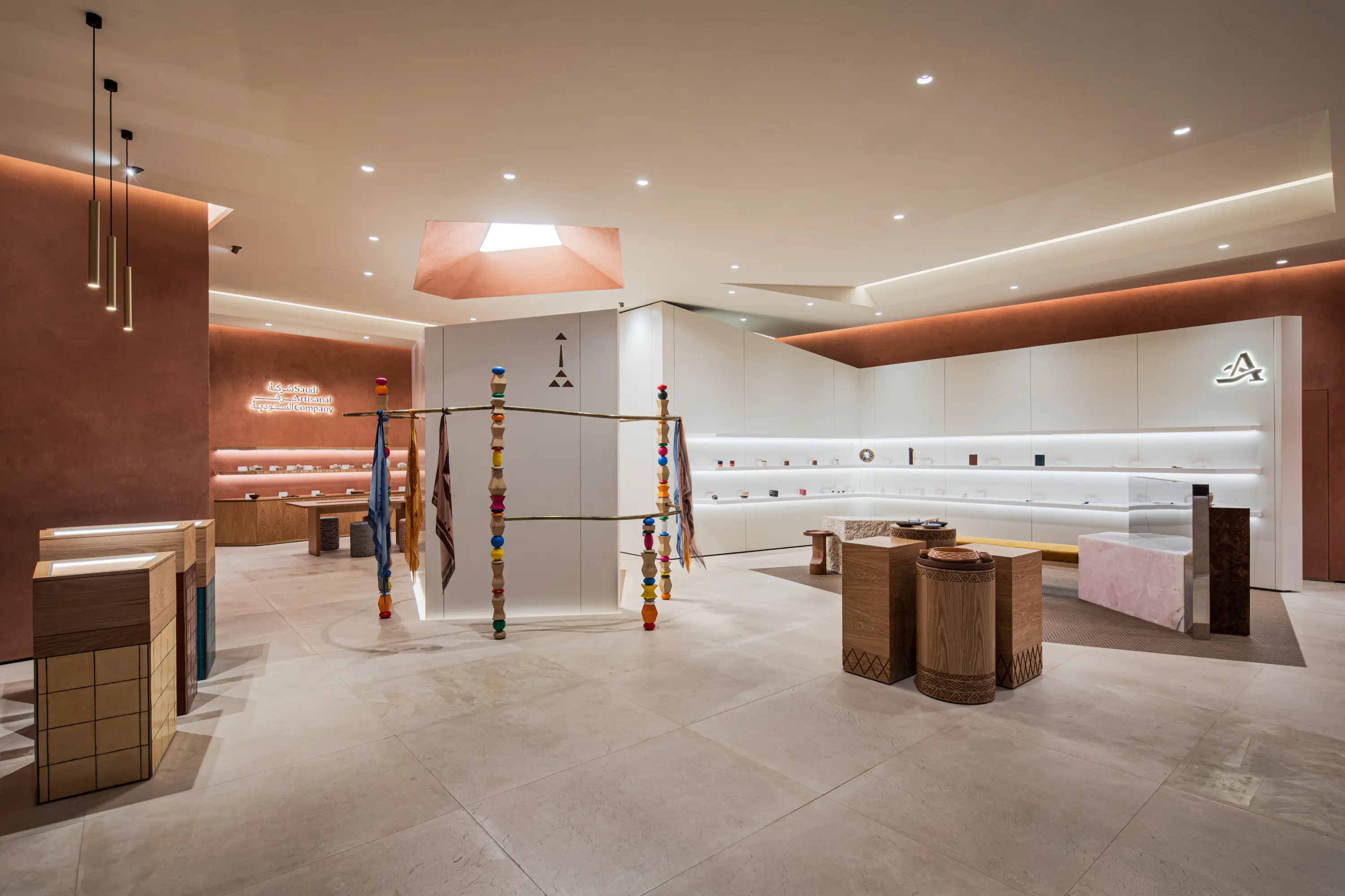 In Diriyah, Riyadh, the Saudi Artisanal Company (SAC) Flagship Store unfolds as a quiet gallery of craft; honouring the artist, the land, and the product. Earth-toned walls and white surfaces frame the crafts, and sculptural displays echo desert landscapes; engraved with Najdi patterns that anchor memory in form. A focal wall of raw fragments - clay, wood, ceramic, and textile - celebrates making as meaning, not just product. The space balances contrast and continuity, gently guiding visitors through moments of discovery, where heritage and contemporary design meet in rhythm and depth.