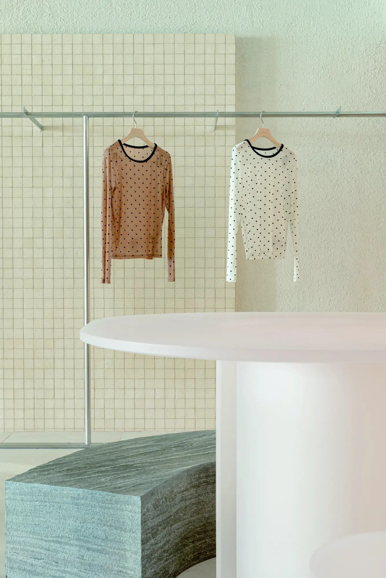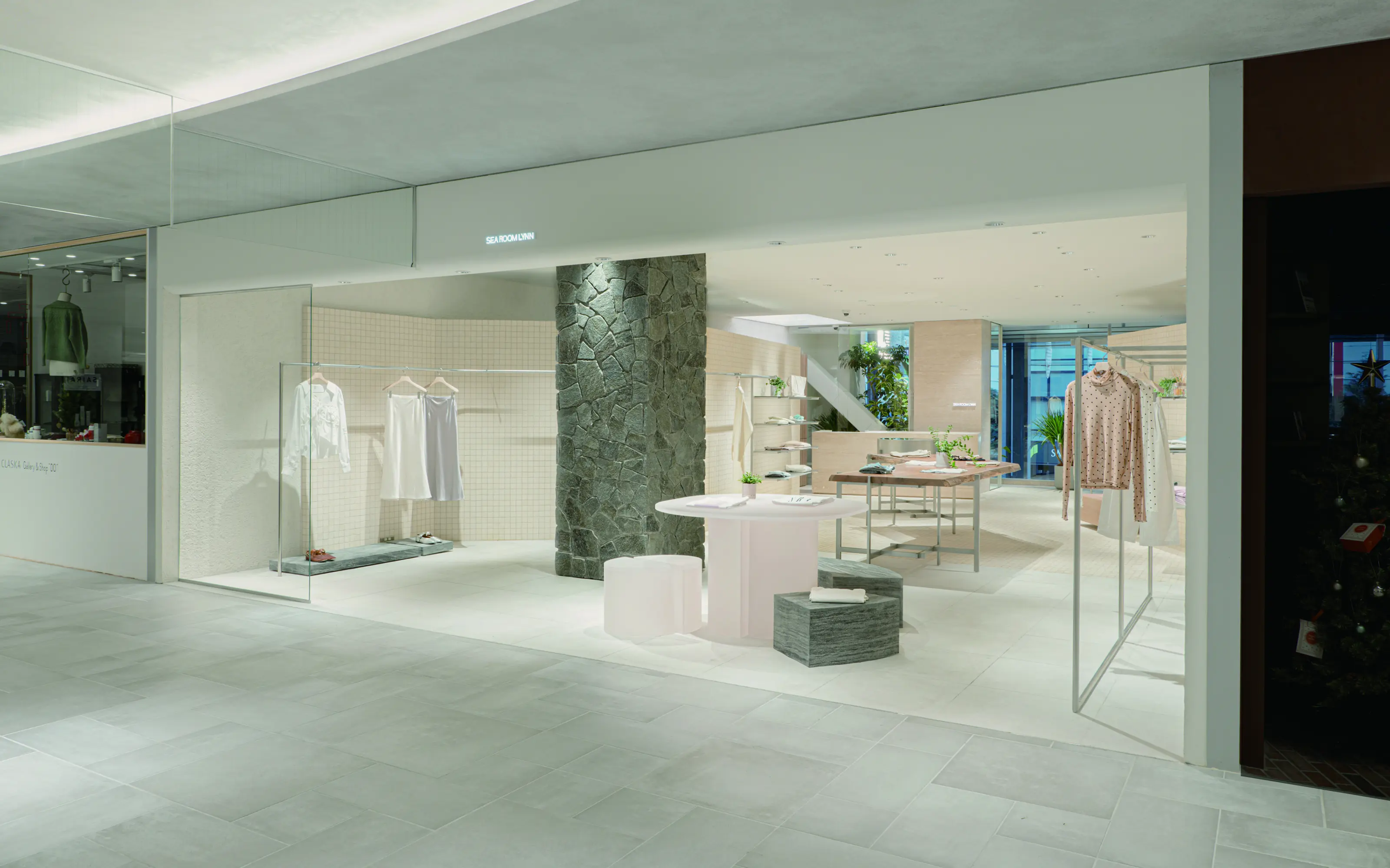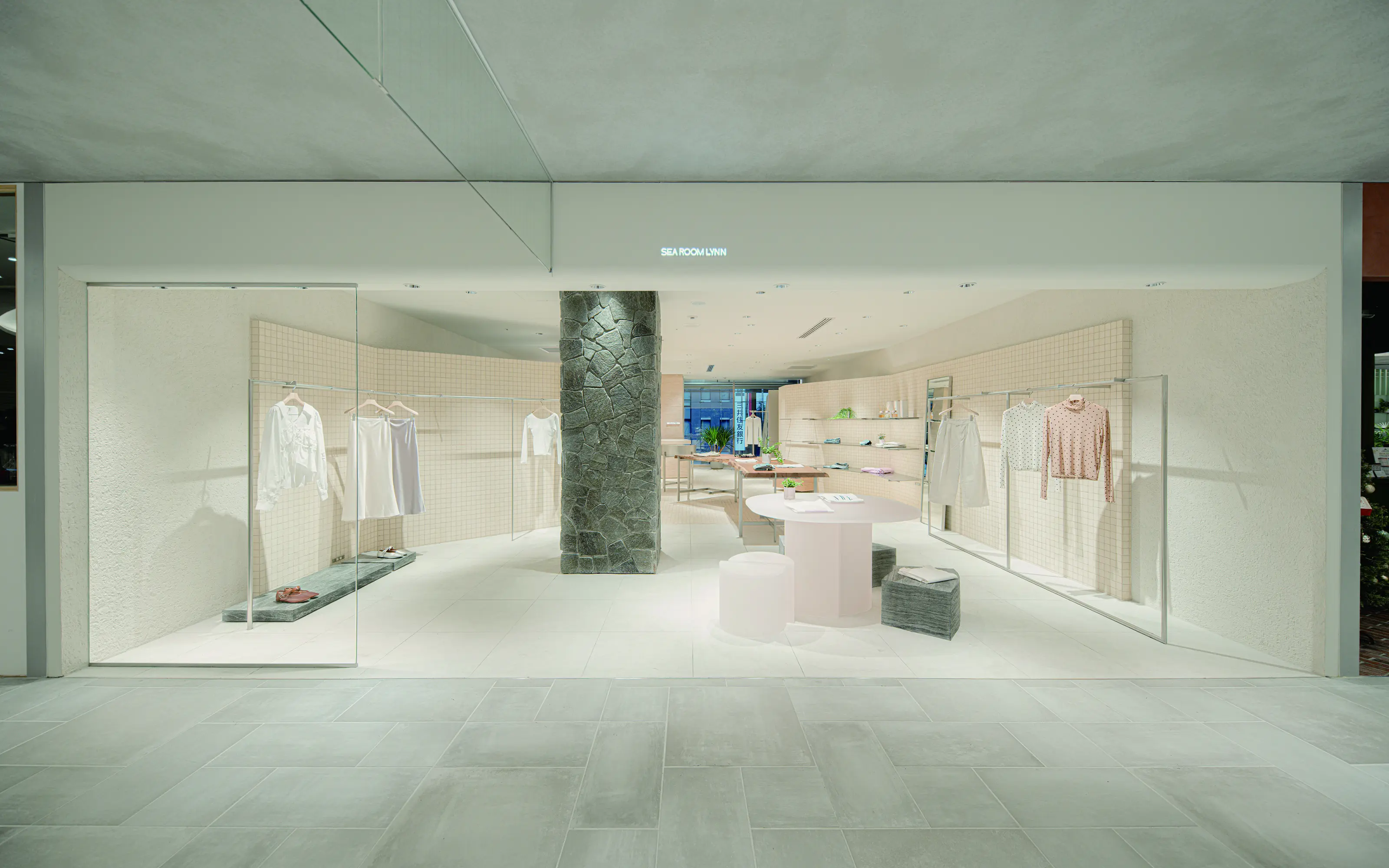 Sea Room Lynn is a life style shop which concept is for women who enjoy city life while admiring beaches. Carefully planned lines that deliberately narrowing in the middle of the shop makes the space visually deep and open, while considering customers' natural behaviour and traffic. Together with a large window that brings natural sunlight and dedicated located top lights in the ceiling make the room bright and open. Selected stone on the pillar combining natural material and straight lines describes those independent and dignified women. Colour scheme is subtle but combining various material makes the shop calm and exclusive atmosphere.
