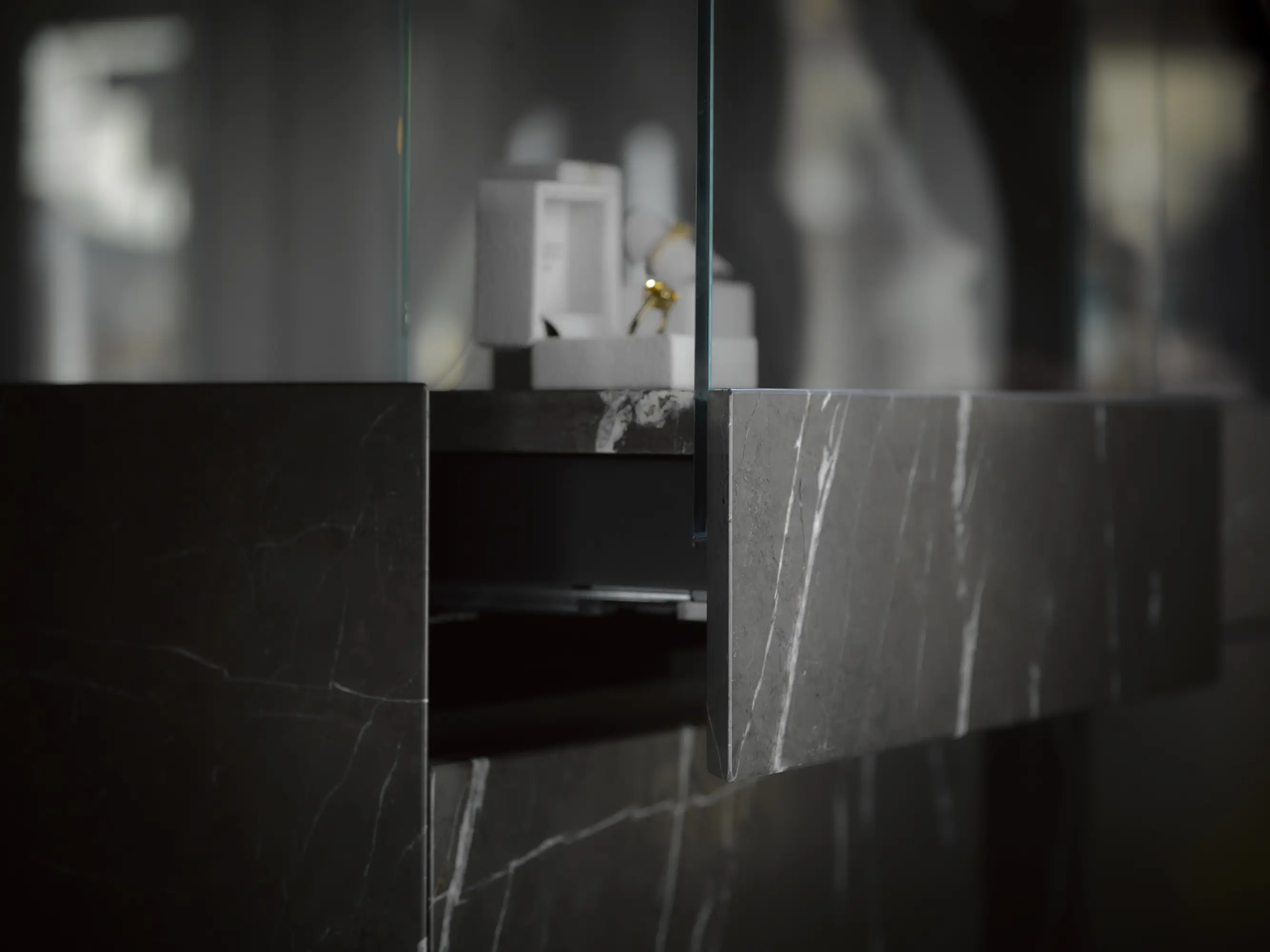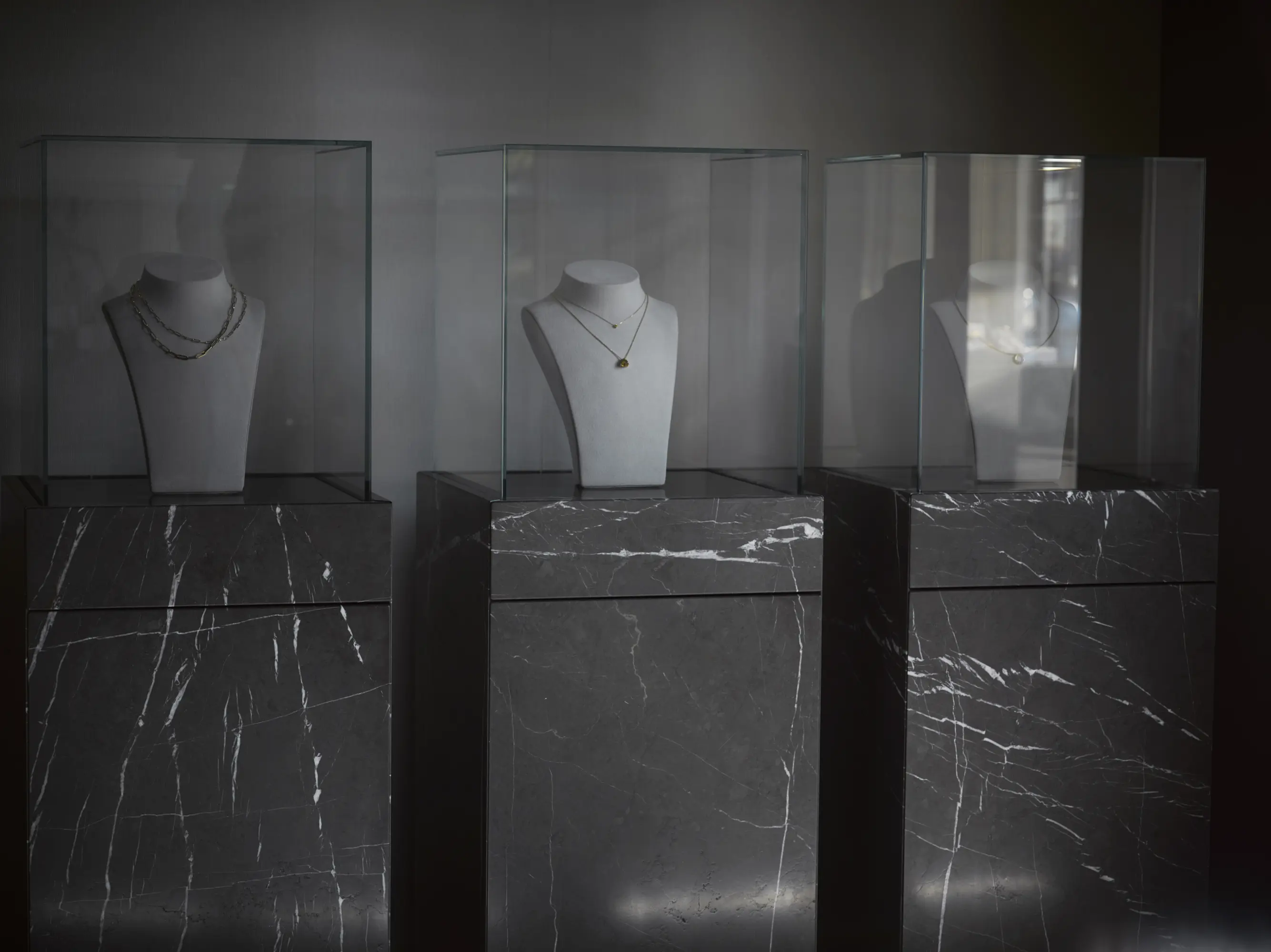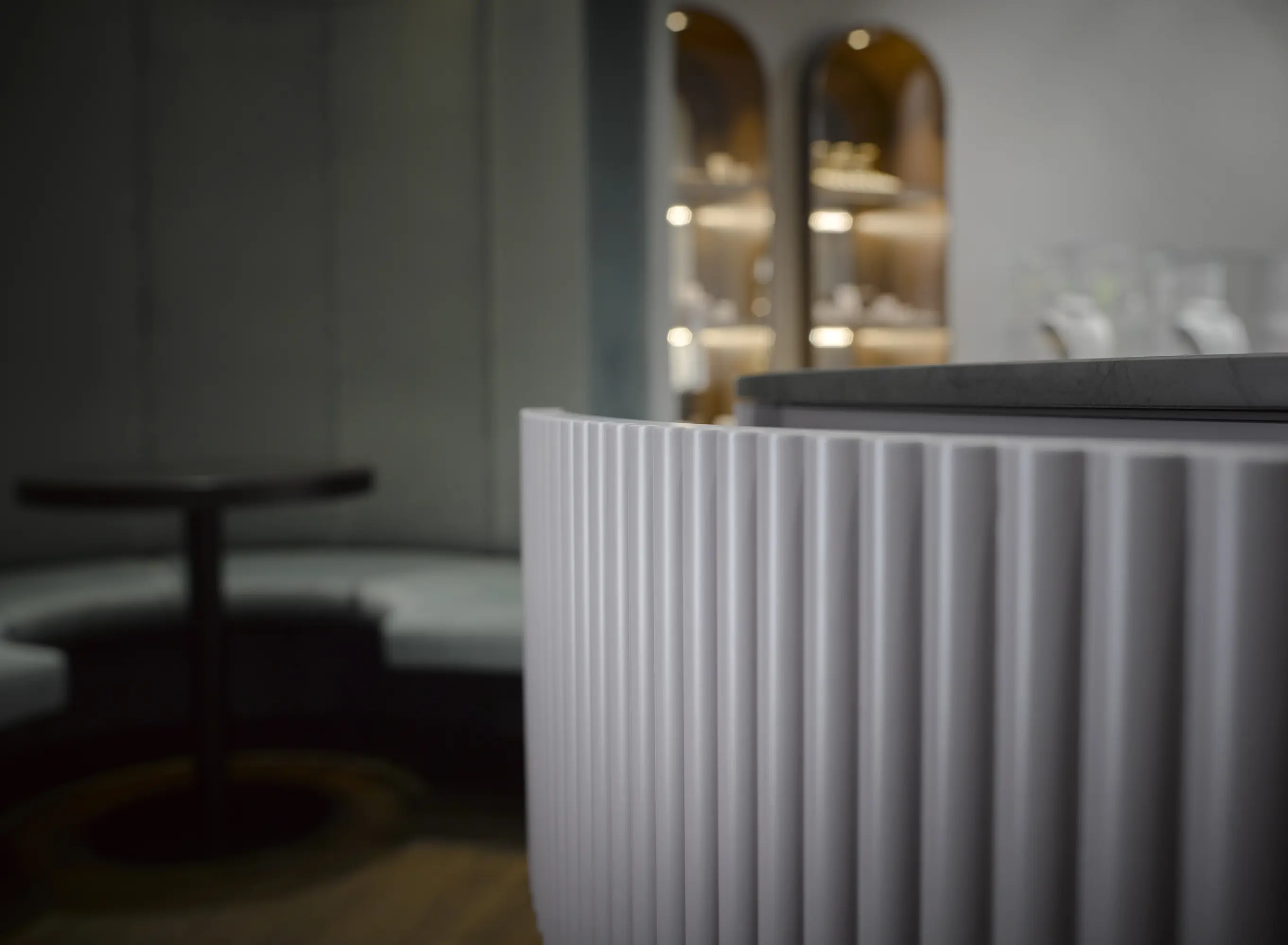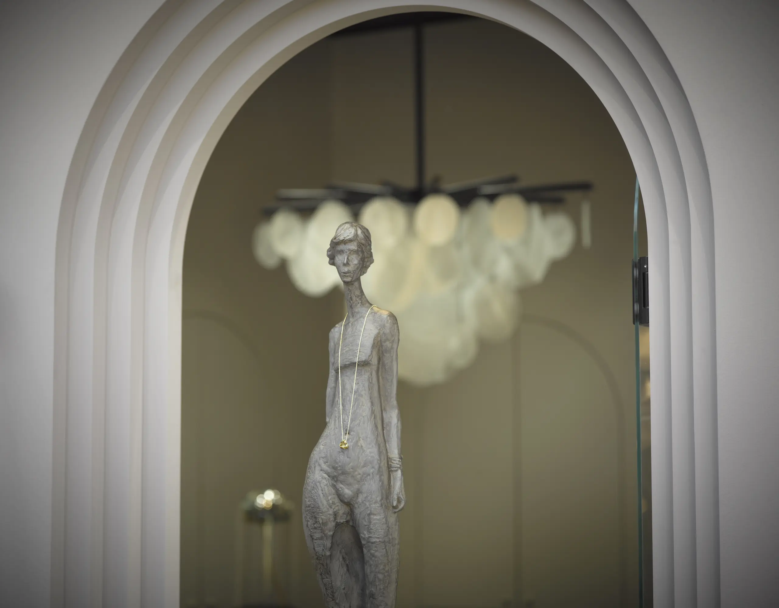 A Jewel of a Jeweller. This boutique jewellery store blends timeless elegance with the cosmopolitan flair of Paris or Milan. From the first glance, the space draws visitors into a world of refined brilliance—open yet intimate, with carefully zoned areas balancing exclusivity and approachability. Materiality defines the atmosphere: natural stone columns, vertical slats, soft oval silhouettes, and arches shape flow and depth. A bespoke glass lighting feature crowns the space as a luminous centrepiece. More than a store, it is a sanctuary of beauty and emotion, where space, light, and craftsmanship merge in perfect harmony.