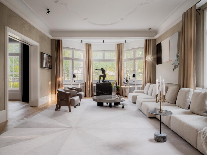 The listed villa has been meticulously renovated and lovingly restored. Historical features such as the intricately carved wooden staircase, sash windows and doors, stucco ceilings, and original built-in cupboards now blend seamlessly with modern design and technology. The rooms are used as a showroom for designer Olaf Kitzig’s carpet collections. The homely environment helps customers visualise the size, colours, and spatial impact of the products while creating a relaxed and comfortable setting for discussions.