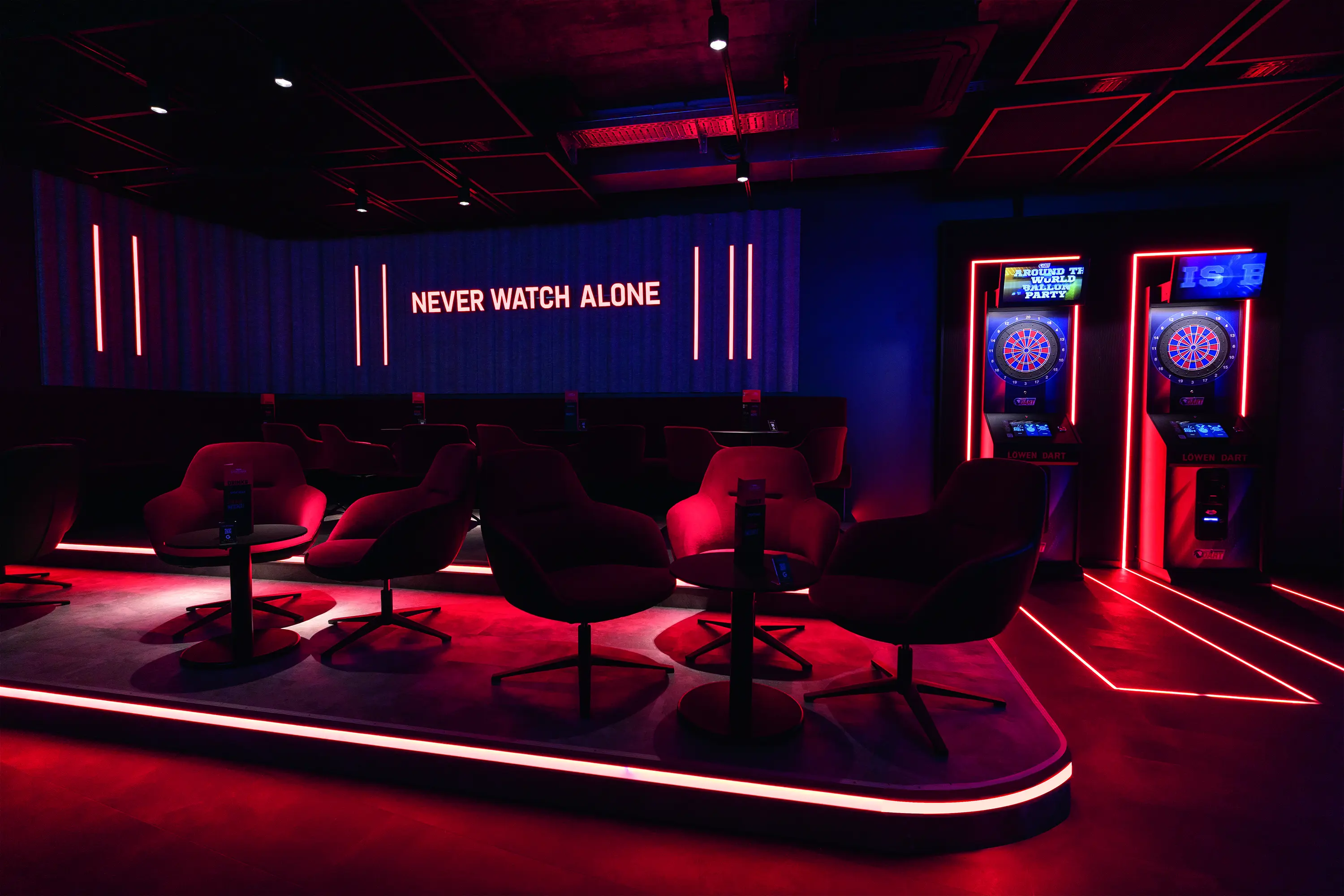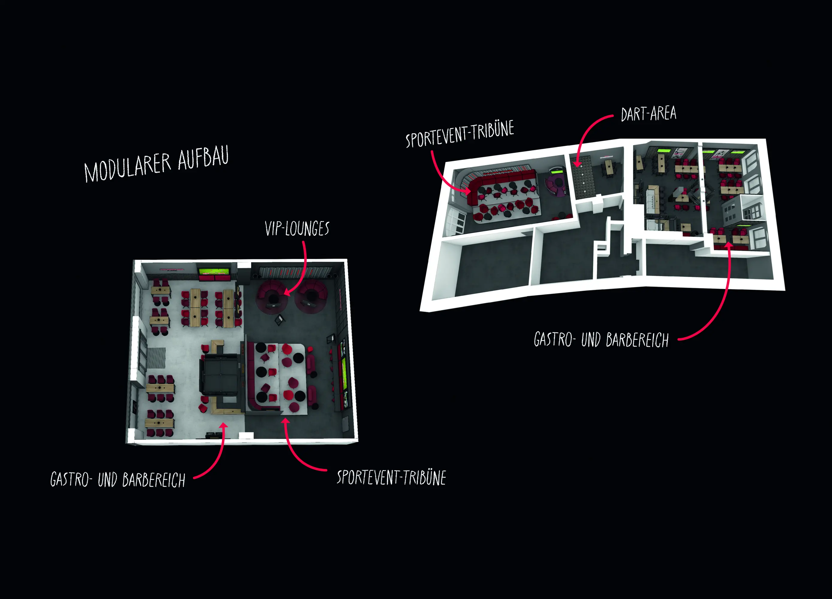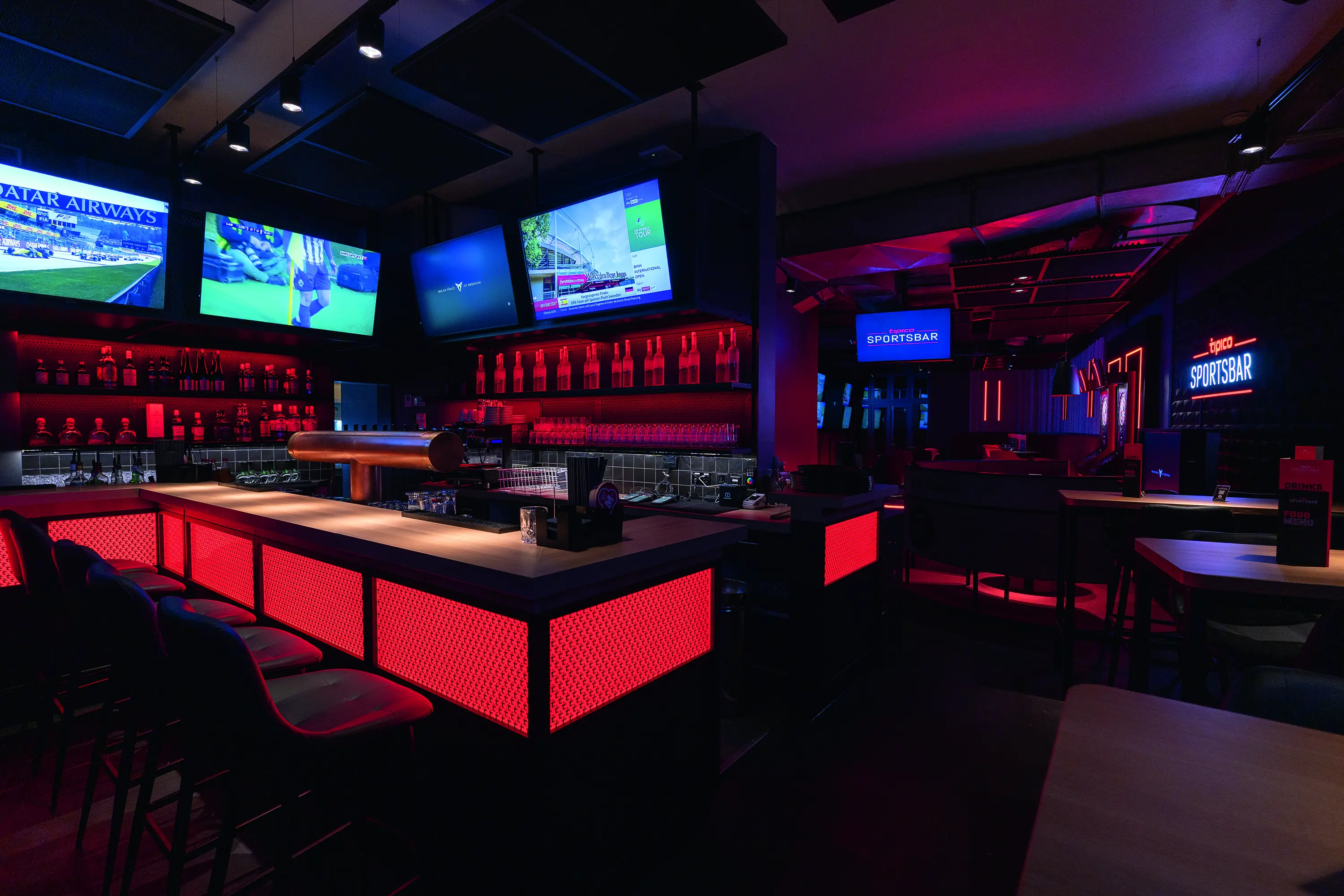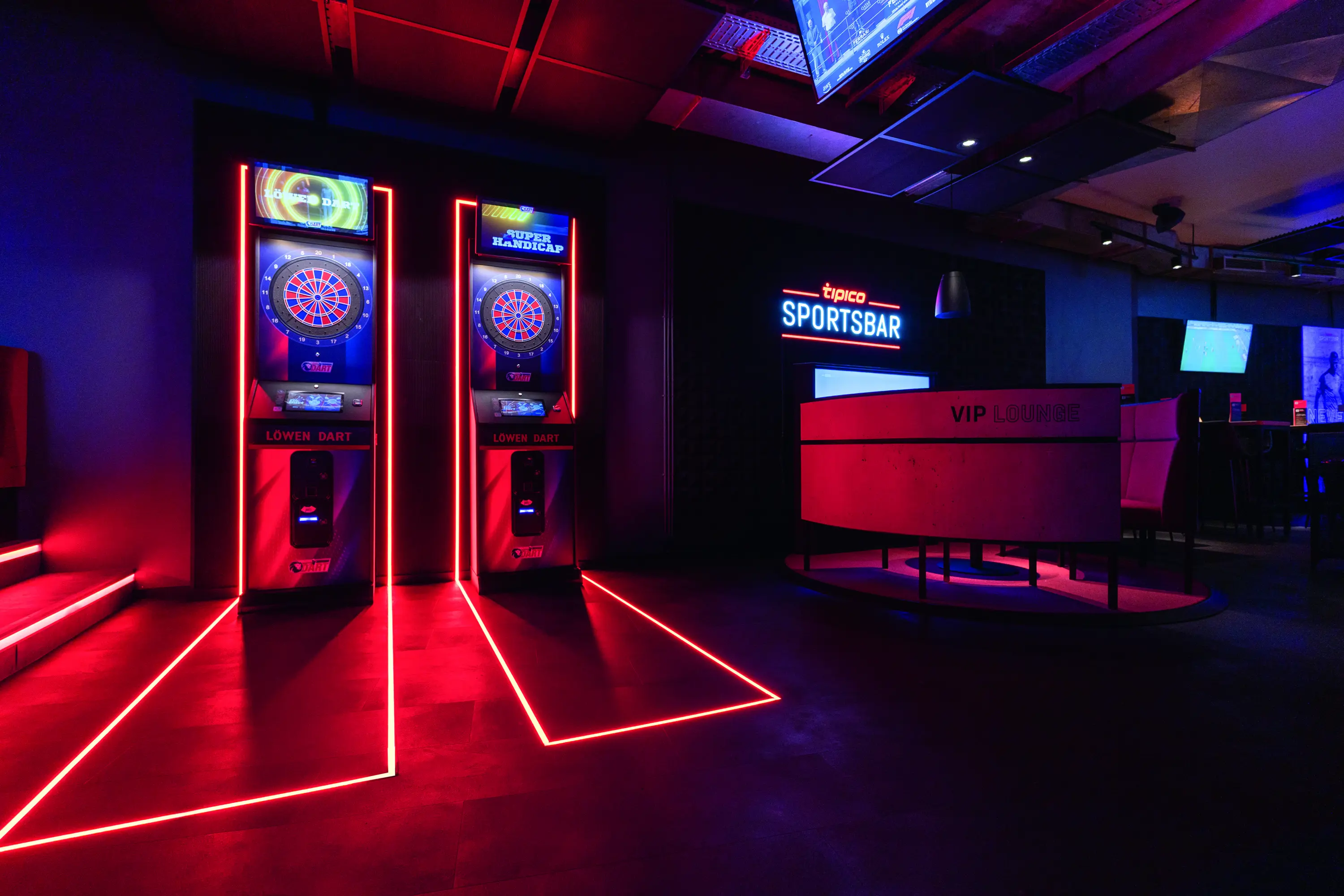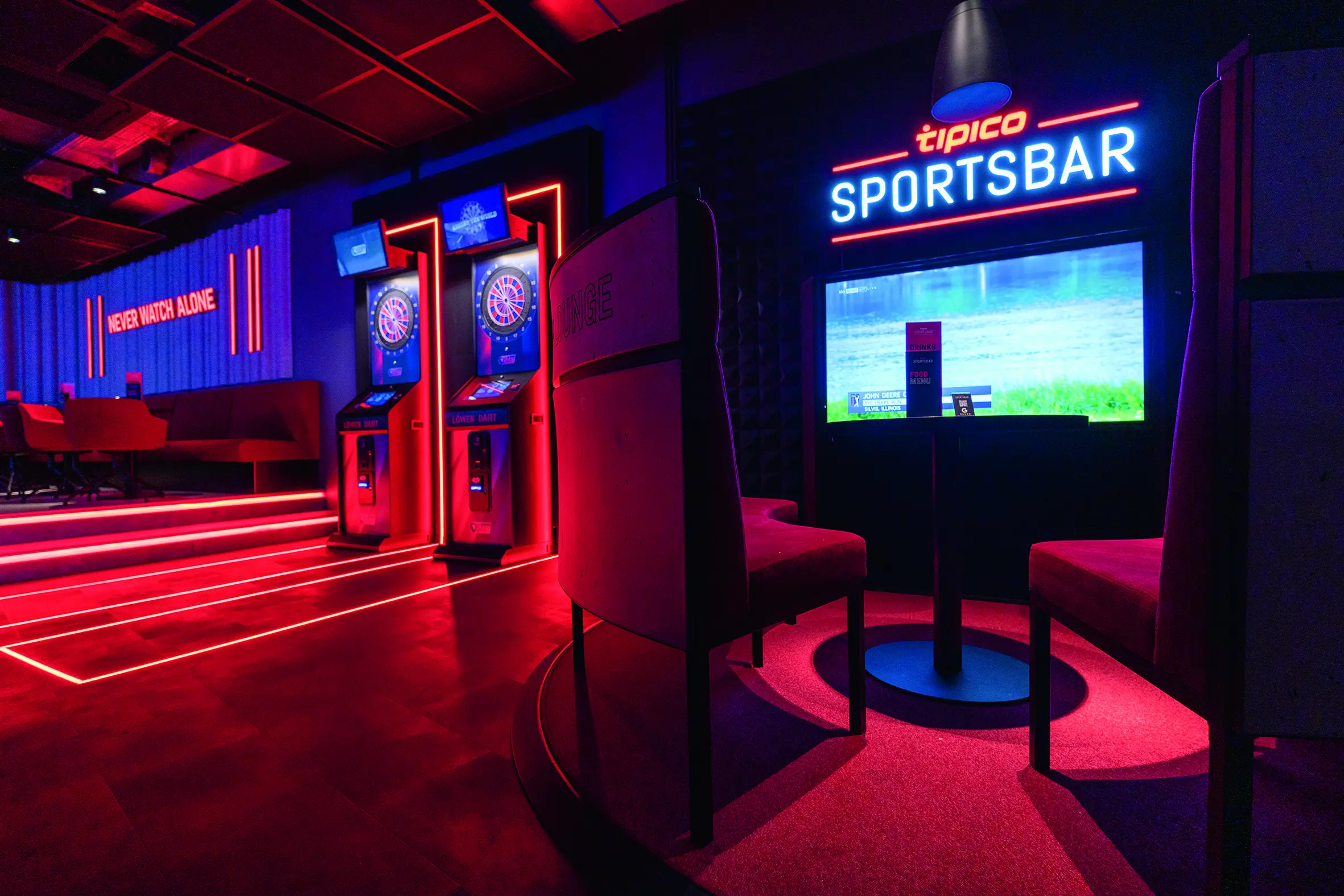 Flexible bar design for real sports fans: Preussisch Portugal has developed a modular sports bar concept for sports betting provider Tipico. The area is clearly divided into three zones: The front area consists of a bar and restaurant area, equipped with over 30 screens. At the centre, a rentable VIP area is flanked by an integrated darts space. At the rear, sports highlights can be watched together on a grandstand with lounge atmosphere – the perfect setting for real sports fans.