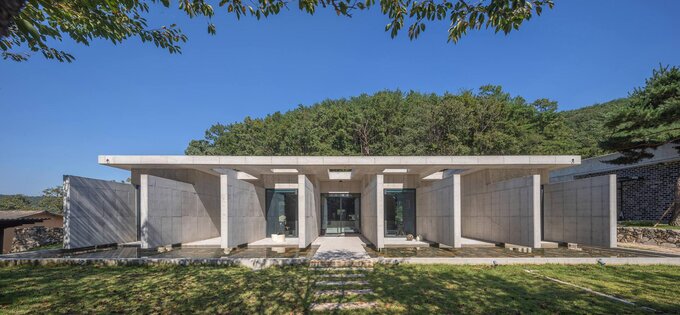 A radical approach was proposed: to break away from the traditional practice of displaying ceramics indoors, instead making it possible to enjoy tea indoors admiring the ceramics exhibited outdoors in the grand nature, thus extending the possibilities of displaying endlessly without limits. I aimed to construct eight walls that connect these mountains, as if to apply human-made cracked glaze to nature. It is here that ceramics are exhibited. The walls connecting the interior and exterior lead occupants to discover their inner worlds, focusing solely on tea and ceramics. The infinitely extending world connects the inside and outside as one.