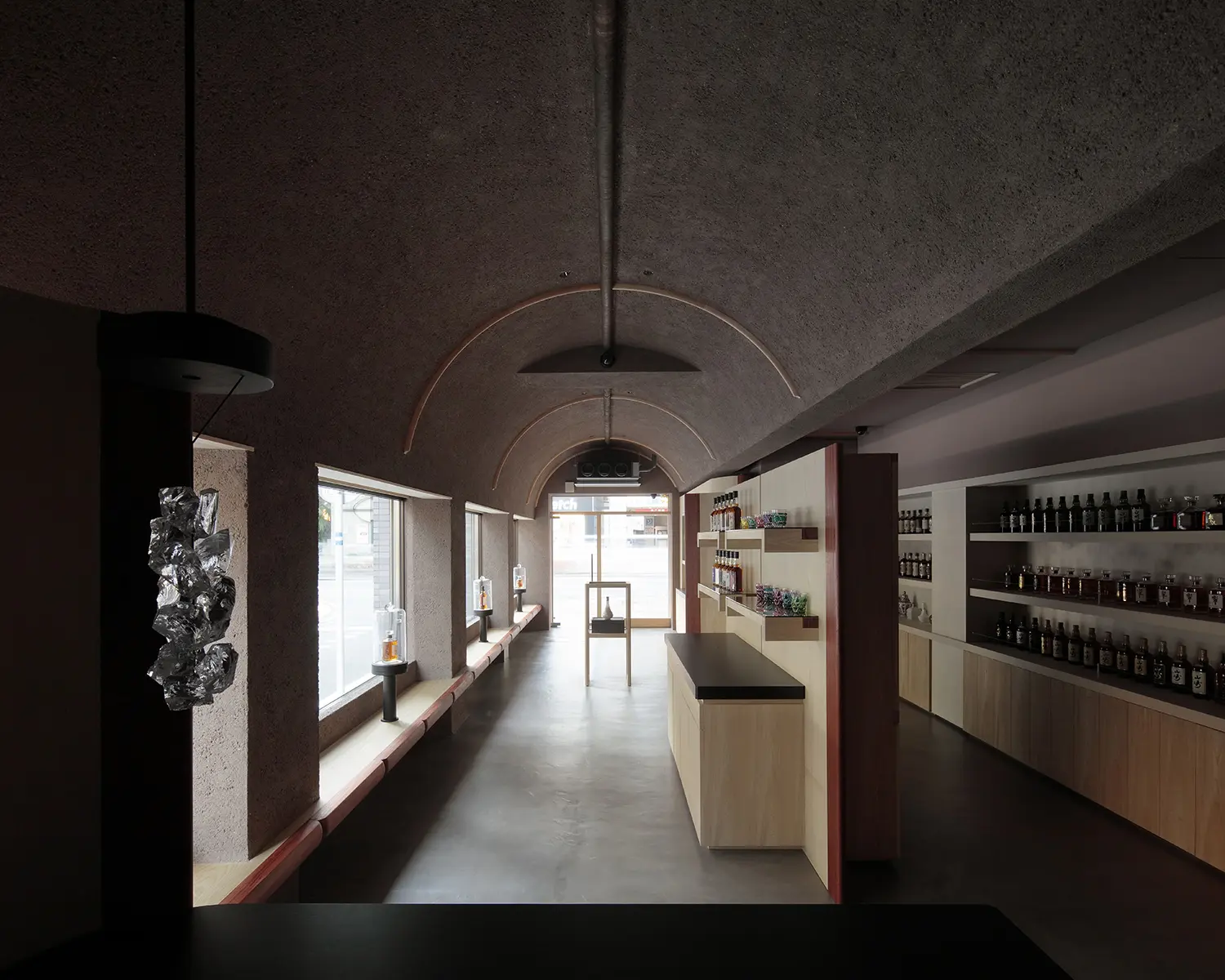 This whisky retail store in central Fukuoka evokes the monastic origins of whisky through a vaulted space inspired by cloisters. Four natural elements essential to whisky-making—earth, water, wood, and fire—are expressed through soil plaster, washi paper, ash wood, and glass. These elements, vital to the spirit’s creation and ageing, are reinterpreted to craft a tactile, sensory experience. The vaulted ceiling guides visitors naturally, while shifting displays invite curiosity. Locally sourced materials and traditional craftsmanship ground the store as a contemplative, layered encounter—more than retail, a quiet passage of discovery.