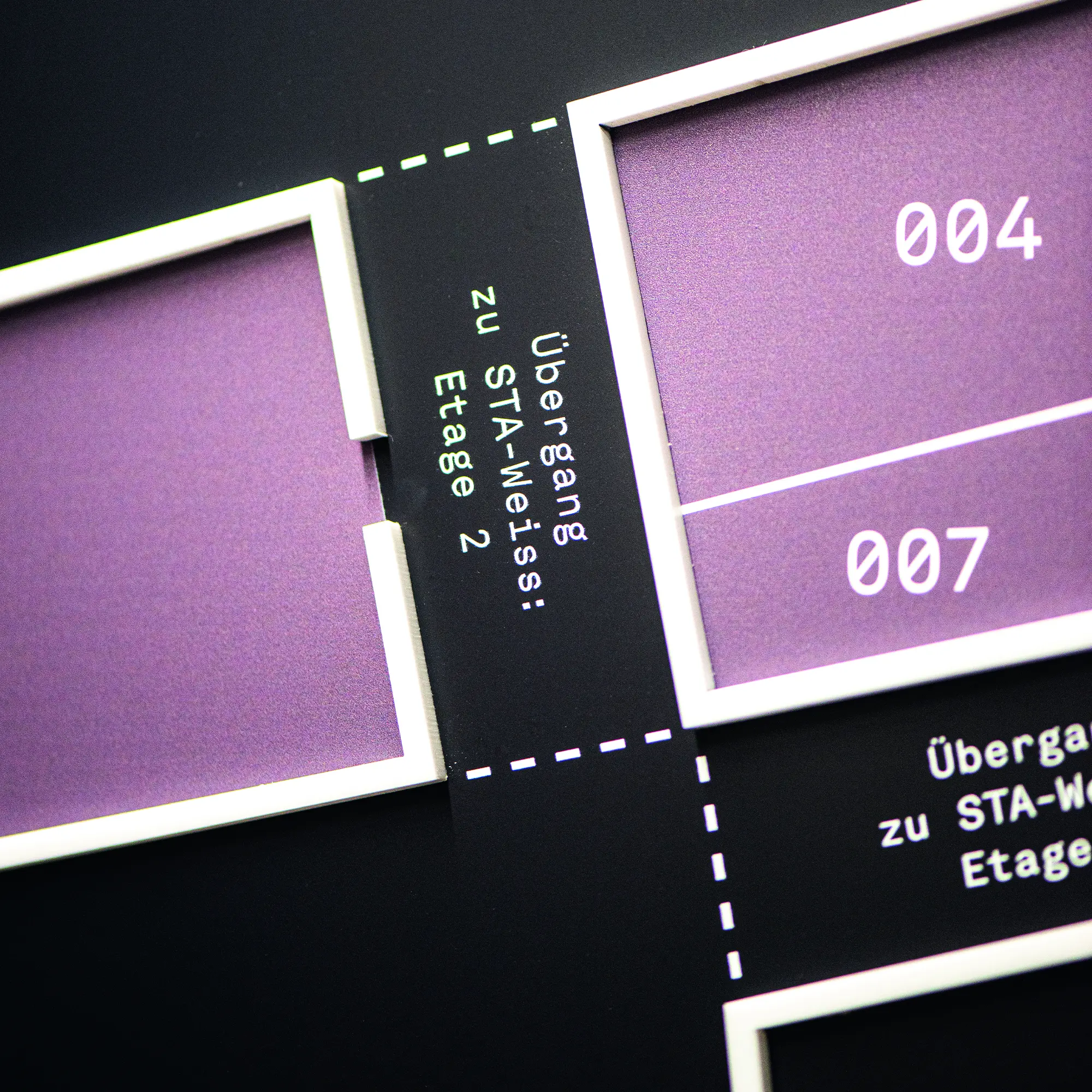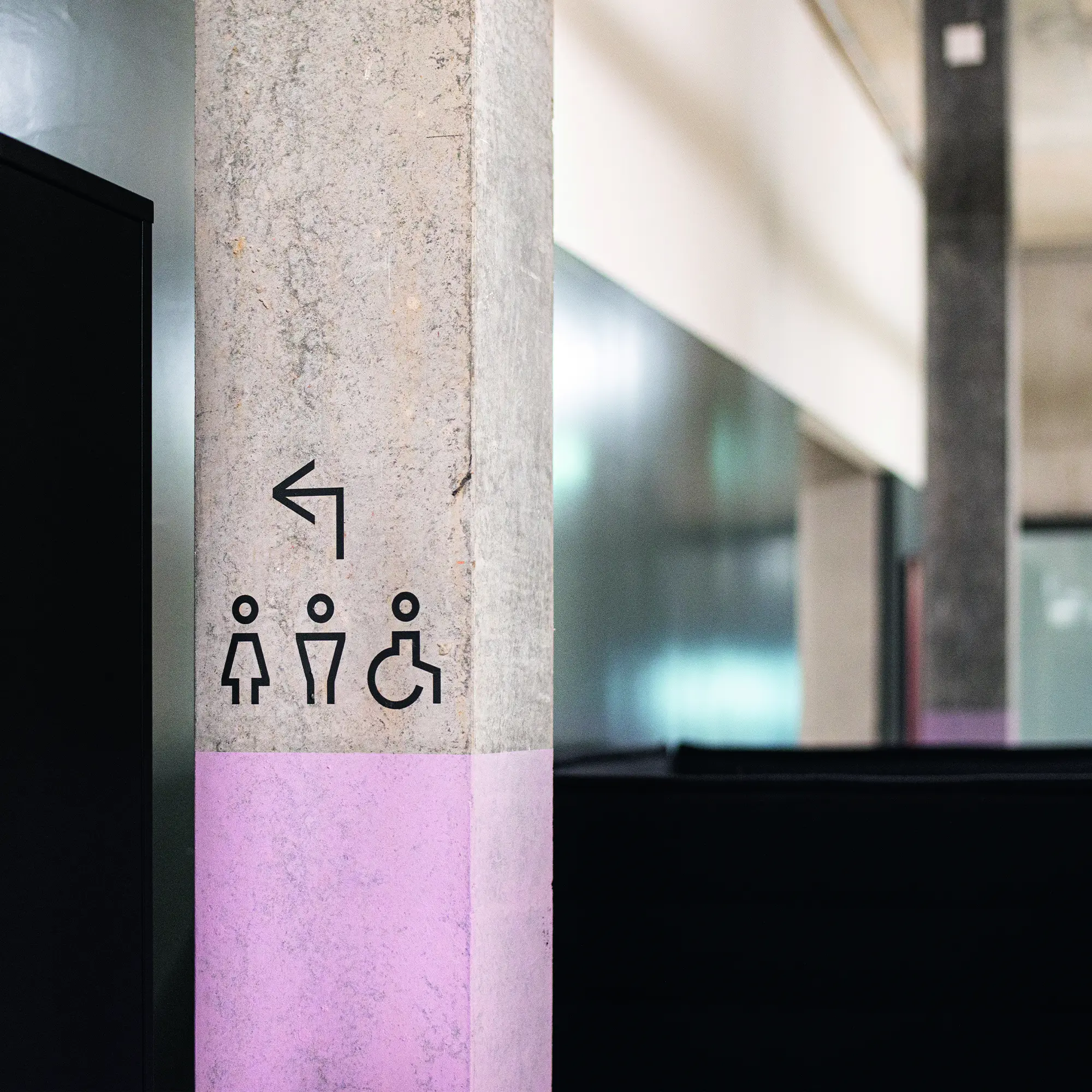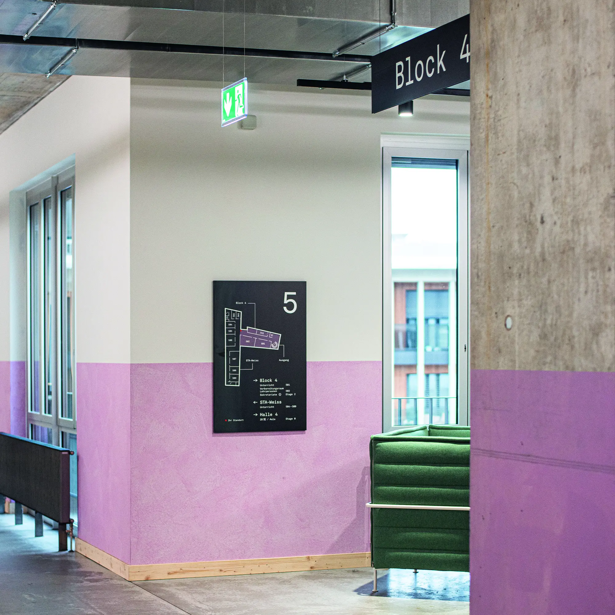Today, the former Deisswil cardboard factory is home to the Bern School of Design and spread across five buildings with different architectural styles. Our wayfinding unifies the campus, provides orientation and builds bridges: between past and present, function and aesthetics, Swiss design tradition and international understanding. Local materials emphasize the industrial and historic building fabric. Clear lines of Swiss typography, barrier-free colours, and a simple design ensure quick orientation. The outcome: A signage system that preserves the past and shapes the future.