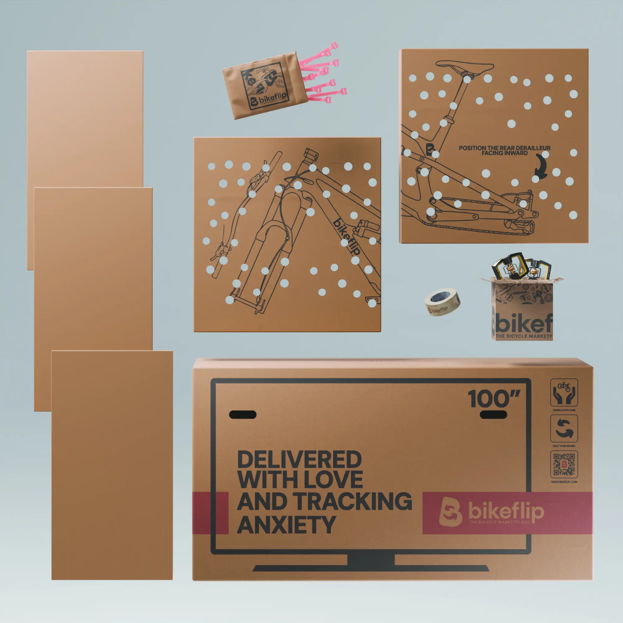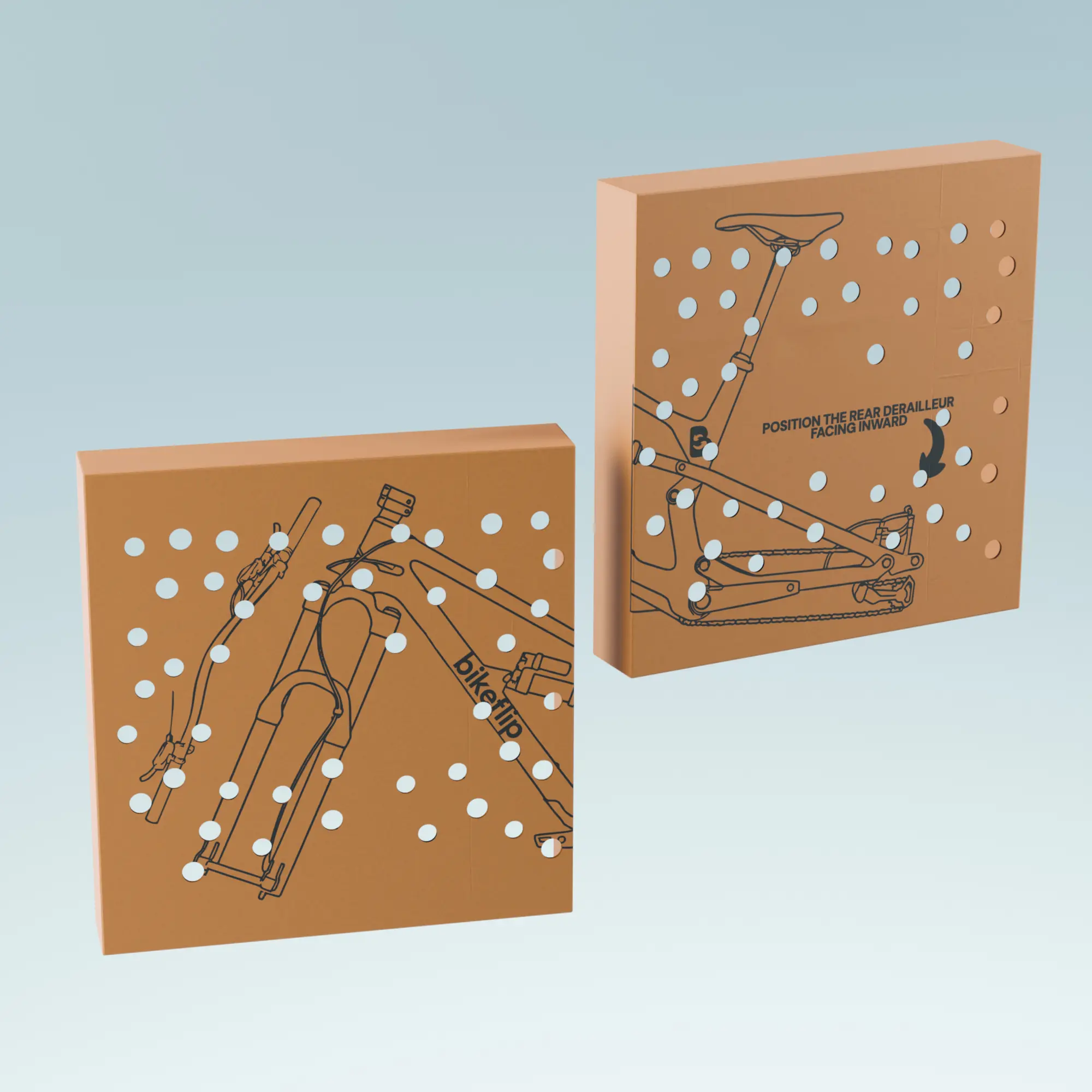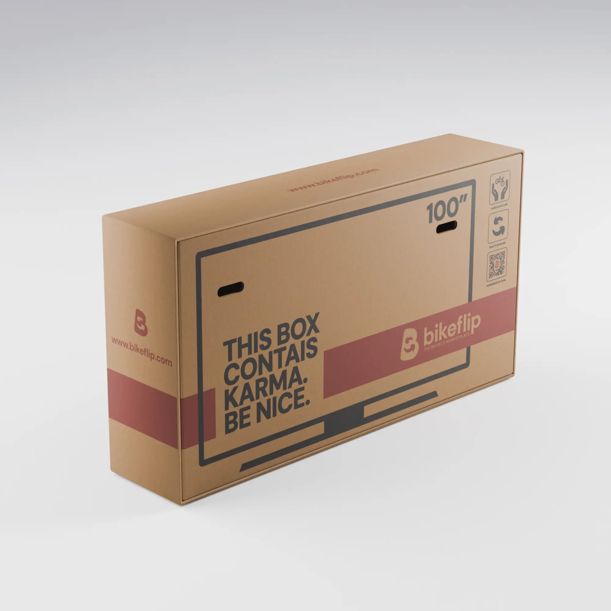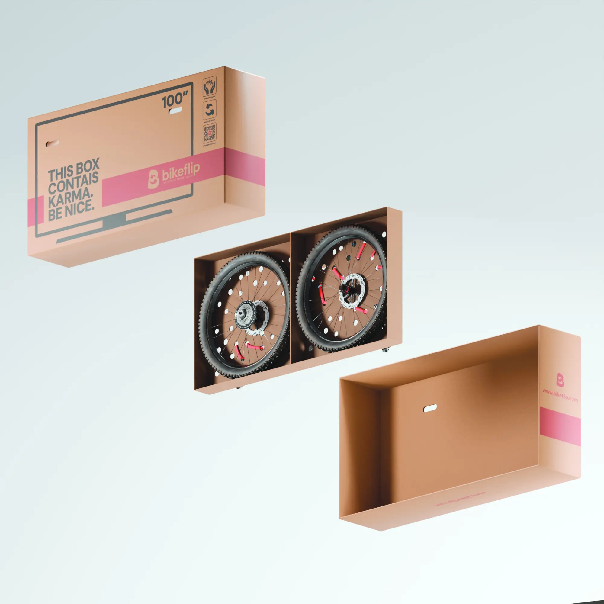 The Bikeflip Box is a patented, 100 % recyclable and reusable cardboard solution for bicycle transport. Designed to stay within courier parcel limits, it reduces shipping costs while ensuring safe delivery. Its innovative perforated inner panel secures any bike frame with strong Velcro straps, while the wheels are placed behind it for optimal protection, making the box suitable for all types of bikes such as MTB, e-bike and city bikes. Perfectly designed for both courier shipping and travel, the Bikeflip Box offers a safe and sustainable way to transport bicycles.