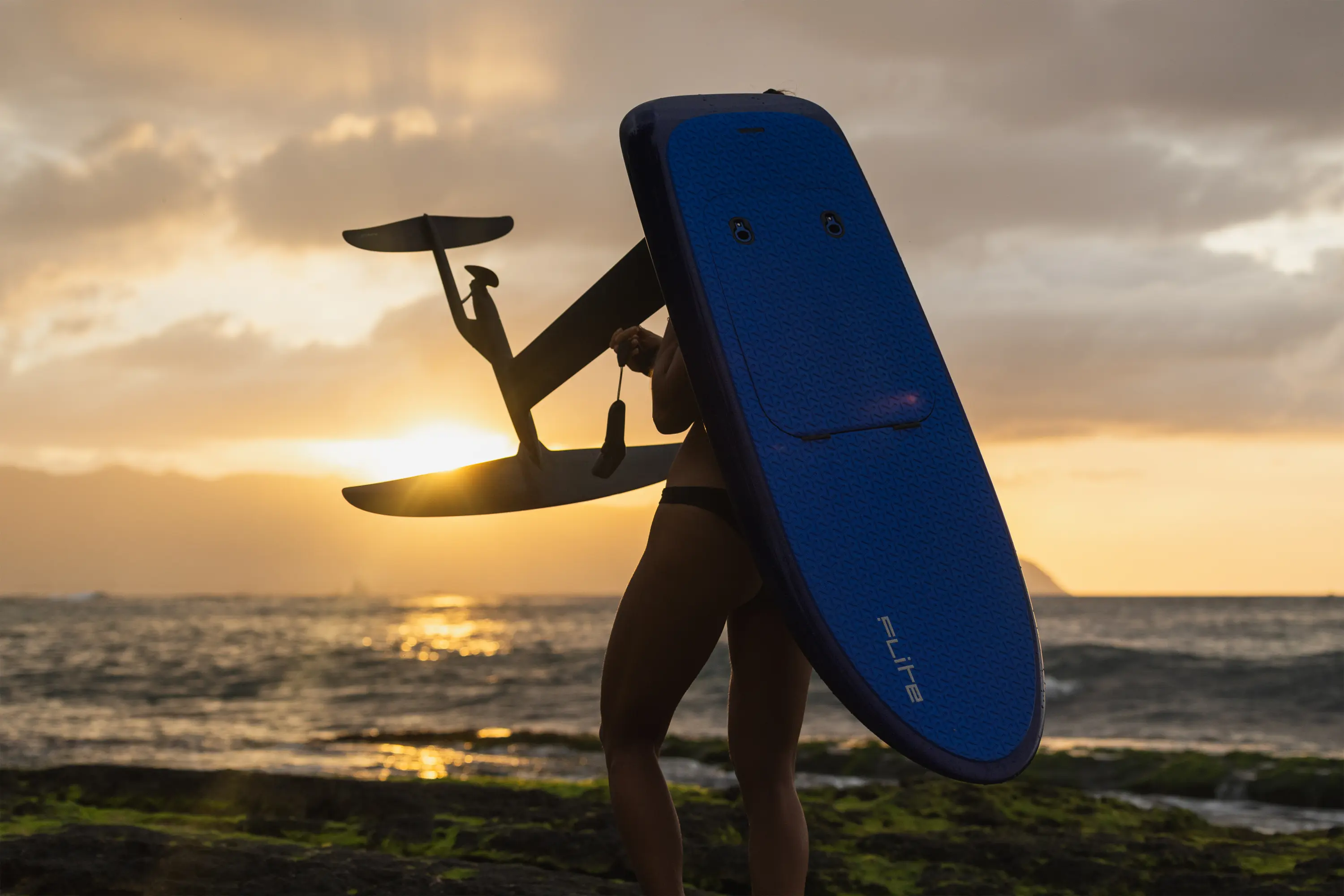 ULTRA L2 is the world’s lightest production eFoil. At just 18.3kg (including battery), it has been perfected for wave riding agility, blurring the line between powered eFoil and unpowered surf foil, to give the rider the best of both worlds. Every aspect has been designed with weight saving and drag reduction in mind, producing an eFoil that is unmatched in performance, aesthetics and usability. Underneath the carbon board is the world's lightest, slimmest and most drag efficient production eFoil system (a monocoque mast, fuselage and tail) powered by the smallest, lowest drag eFoil motor on the market - a patented Fliteboard design.