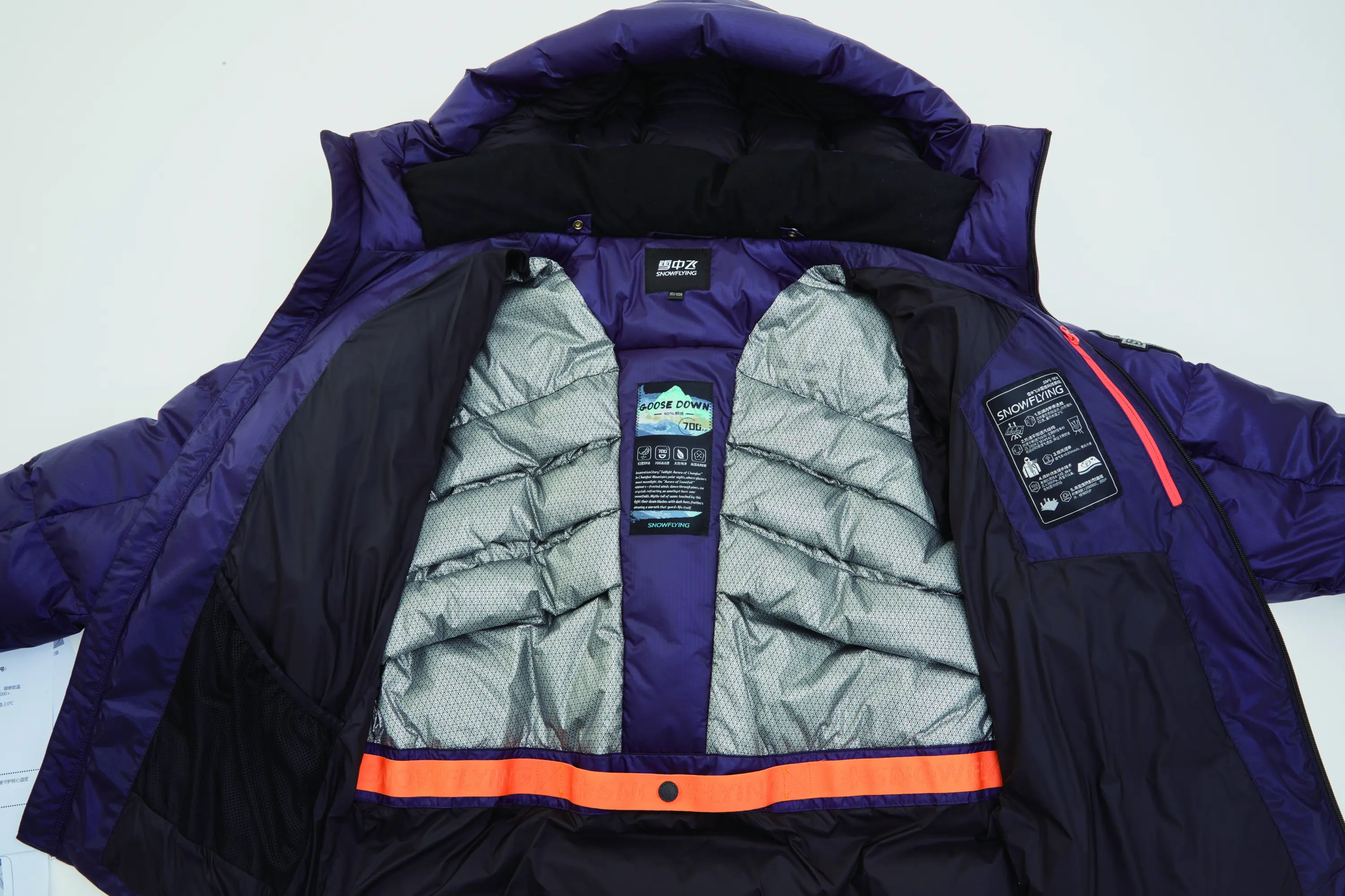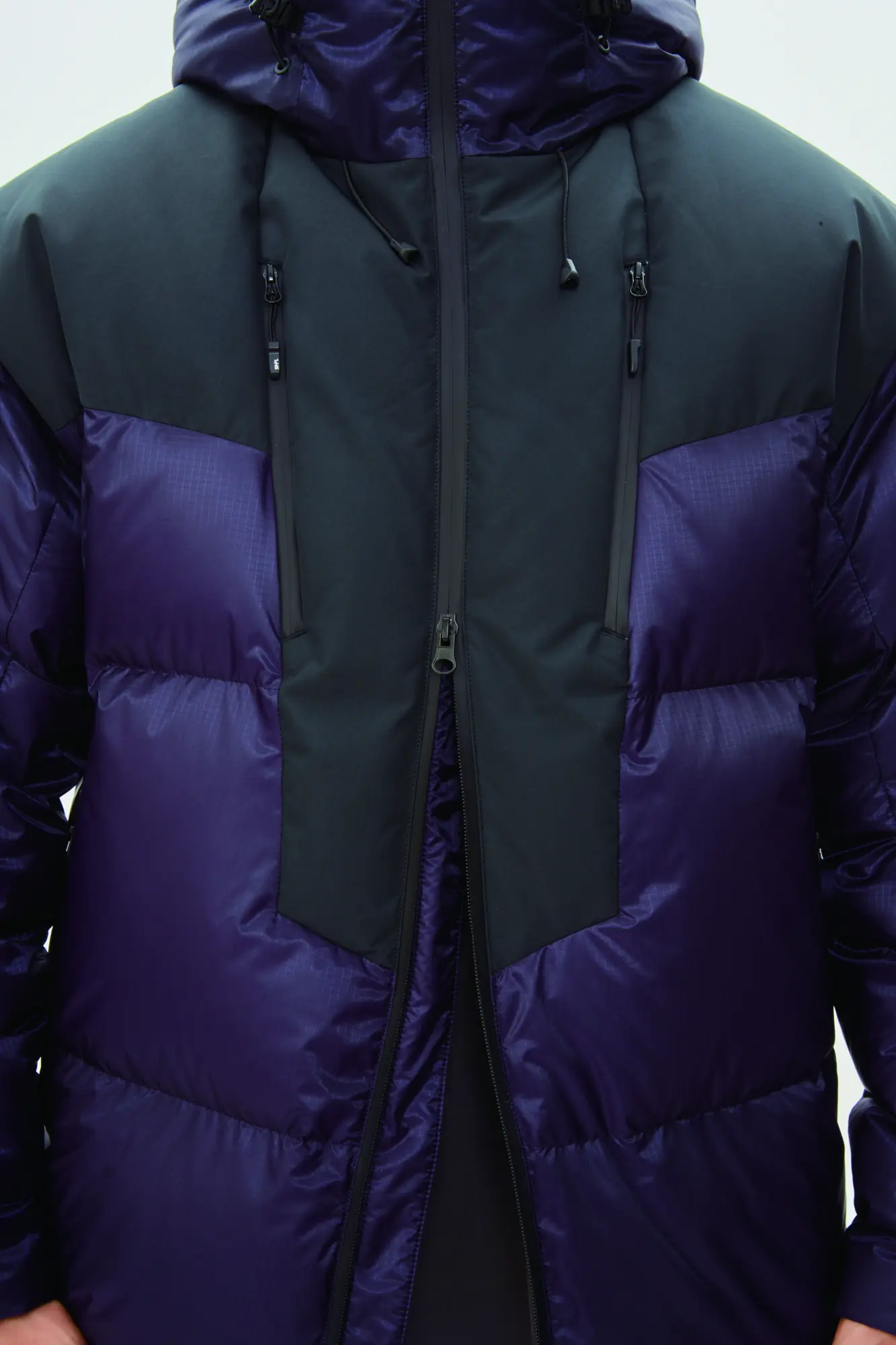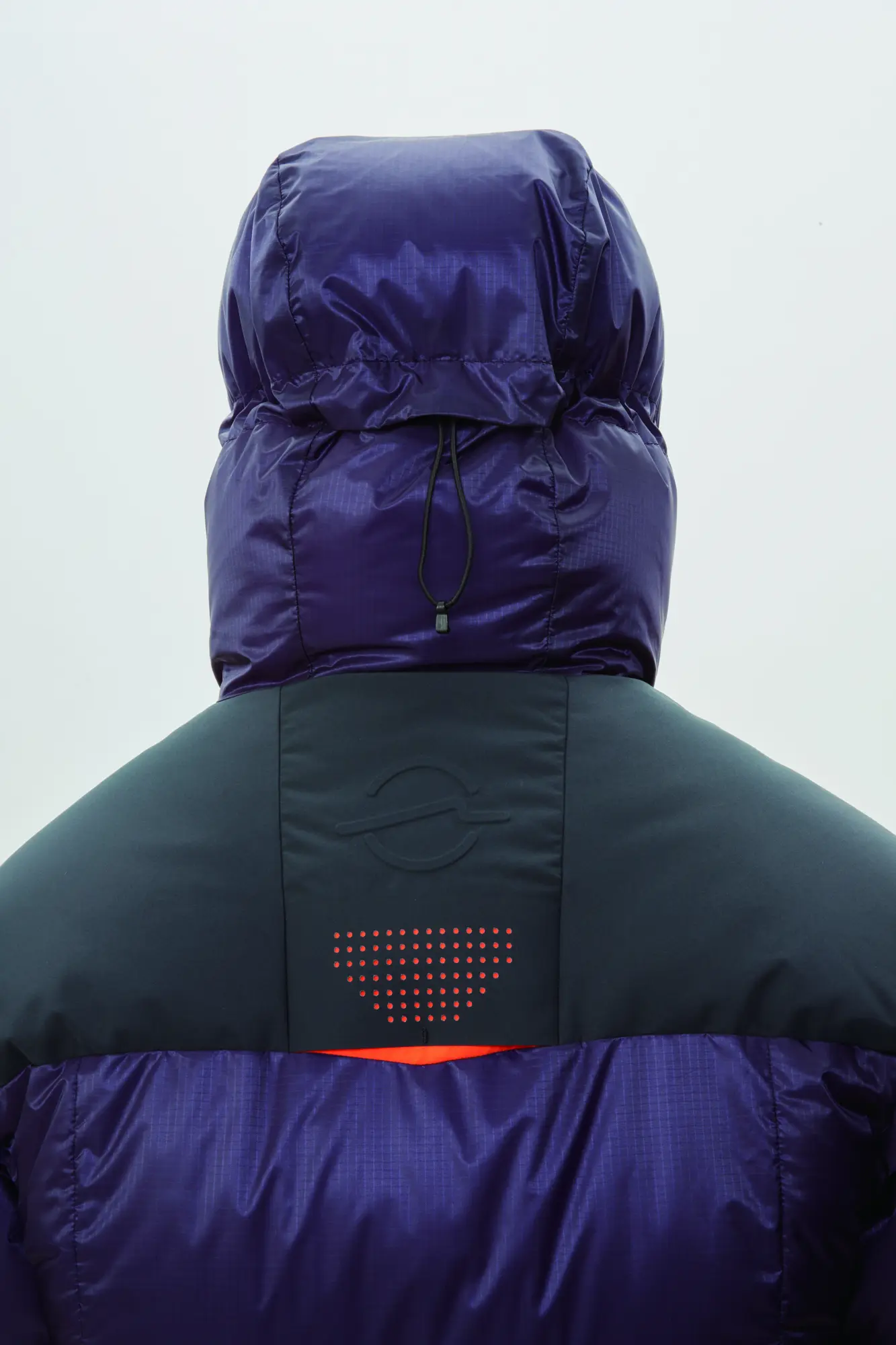 The down jacket features four glacier-inspired colorways with metallic sheen. Made from 40D glossy nylon with grade 4-5 water resistance and 50,000+ abrasion cycles. 90% goose down (700+ loft, 700+ cleanliness) with silver-ion thermal lining performs to -30°C. Patented Cloud-Ridge structure and Heat-Moisture Balance (3000g MVTR) ensure dynamic warmth and comfort. Double-layered hood, 13cm collar, elastic cuffs, waterproof zipper, and quick-pack design maximize functionality. Recyclable down and clean manufacturing reflect environmental responsibility. It blends technology and aesthetics as both premium cold-weather gear and lifestyle statement.