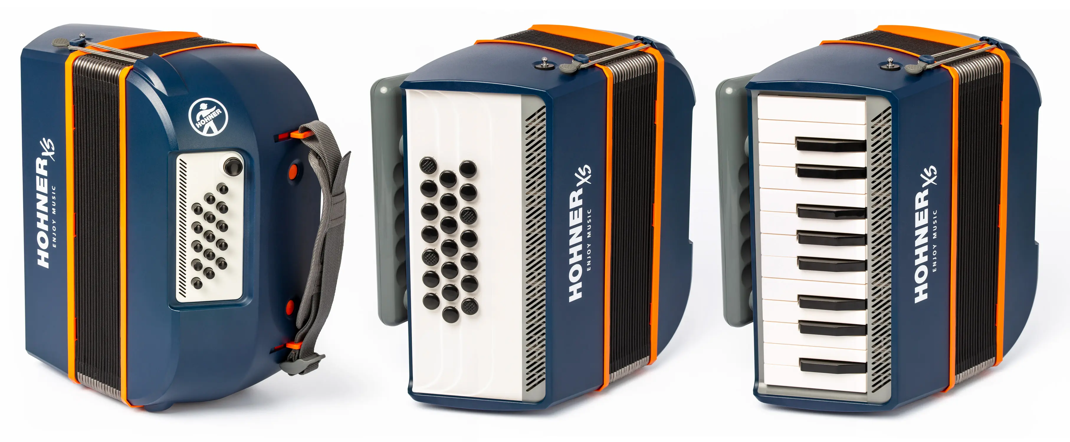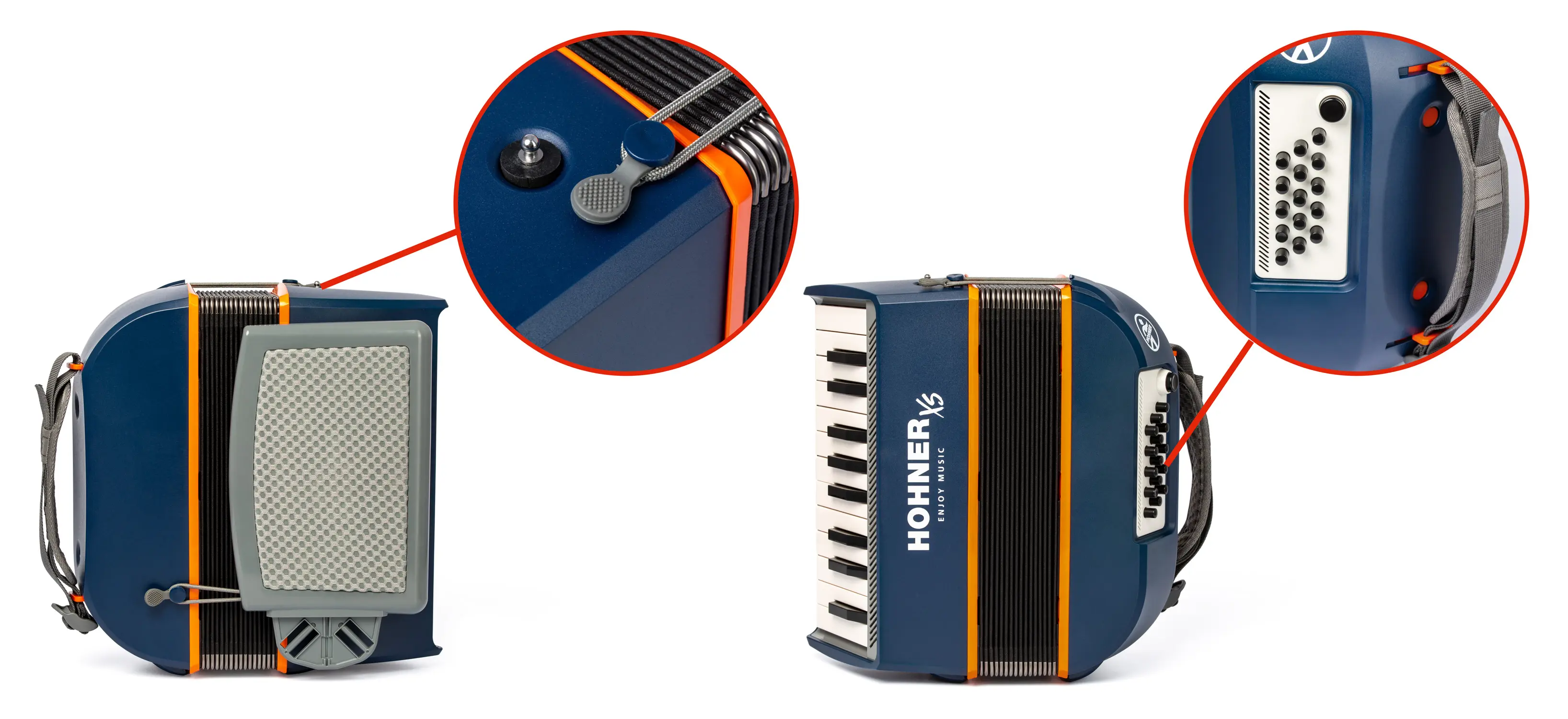 HOHNER XS – The accordion reimagined: Specially developed for children aged 4–7, the HOHNER XS impresses with its light weight (2.9 kg), ergonomically designed construction, and intuitive operation. The integrated piano or button keyboard, innovative carrying system, and patented internal construction ensure comfort and stability. Modern materials replace wood, resulting in a robust, child-friendly instrument with an amazingly full sound. The ergonomic gig bag rounds off the concept – ideal for music education and on the go.