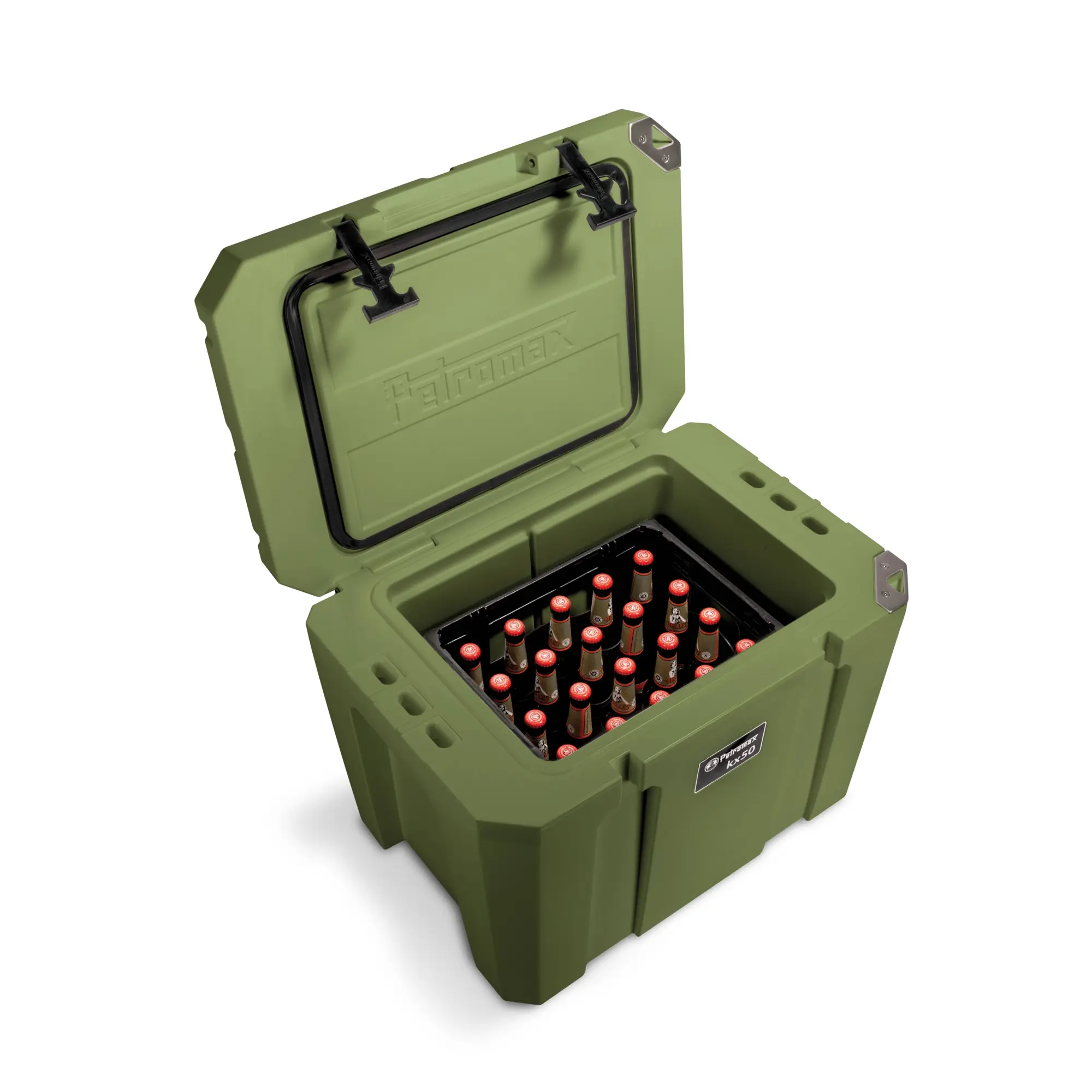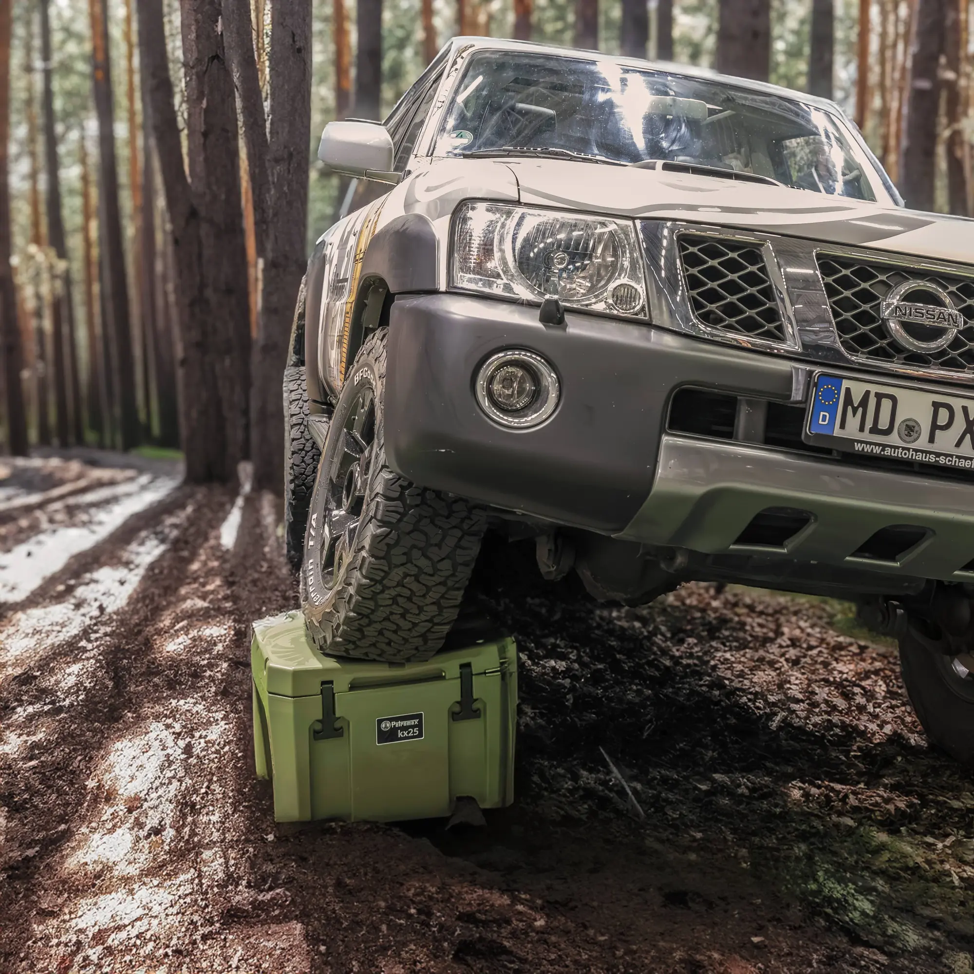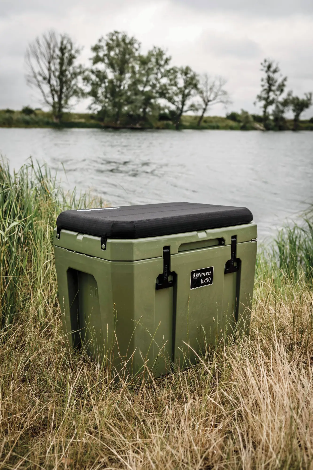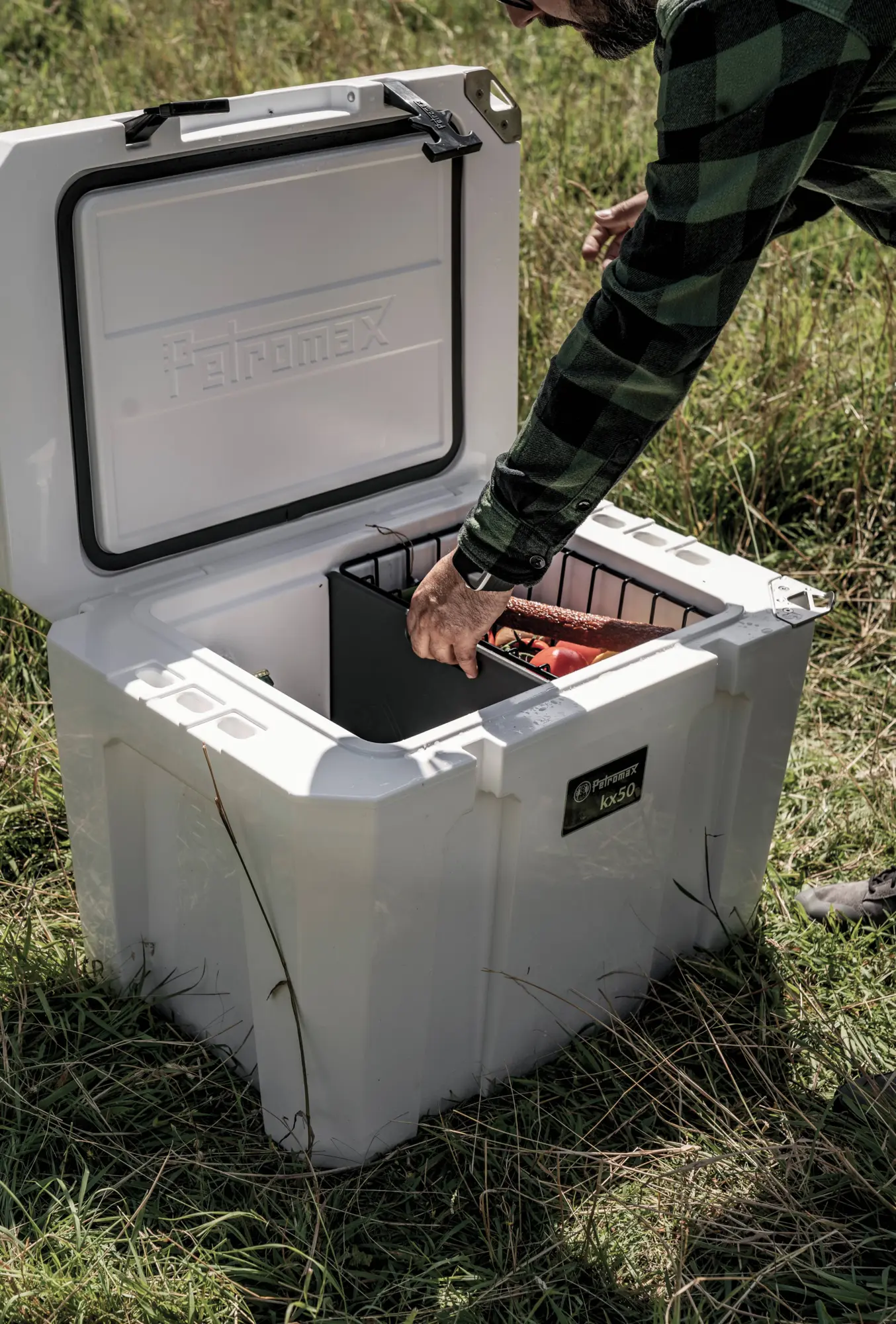 Cool drinks and fresh food for days on end, without electricity? The ultra-passive cooling system of the Petromax KX50 cool box keeps contents cold for up to 12 days with ice or ice packs. The long cooling time is made possible by the 60 mm thick insulation layer. The box is equipped with lashing points, ergonomic carrying handles and non-slip rubber closures. It stands firmly on rubber feet and can be operated with one hand. The robust construction with the capacity of a beer crate also serves as a seat. A drainage system for melt water extends the cooling time and simplifies cleaning. Available in white, olive, sand and, from 2026, in black.