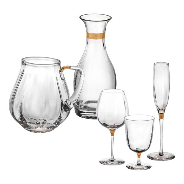 The beautifully shaped crystal crockery combines traditional craftsmanship with decorative minimalism. The fluted glass and subtle golden band create an elegant harmony between past and present. The result is a versatile table arrangement that meets the demands of modern life in a stylish yet functional way.