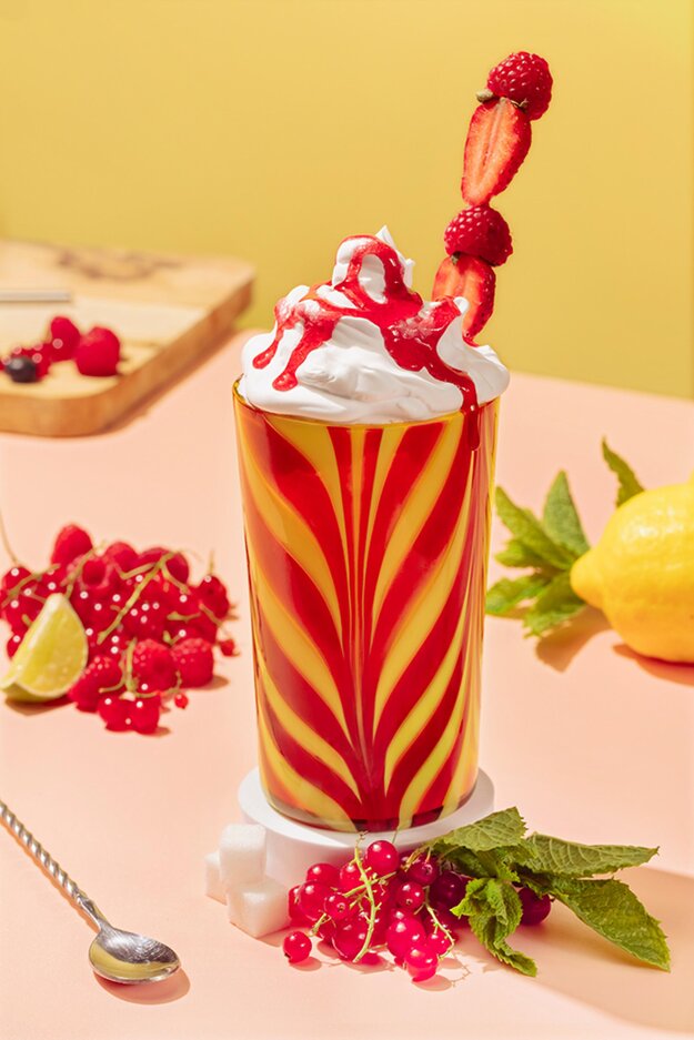 The "Pop me Up" drinking glass/ice cream tumbler collection combines extremely creative and diverse bright colours with various glassblowing techniques. A great collection that sets unmistakable accents on every table with its vibrant colours and shapes.