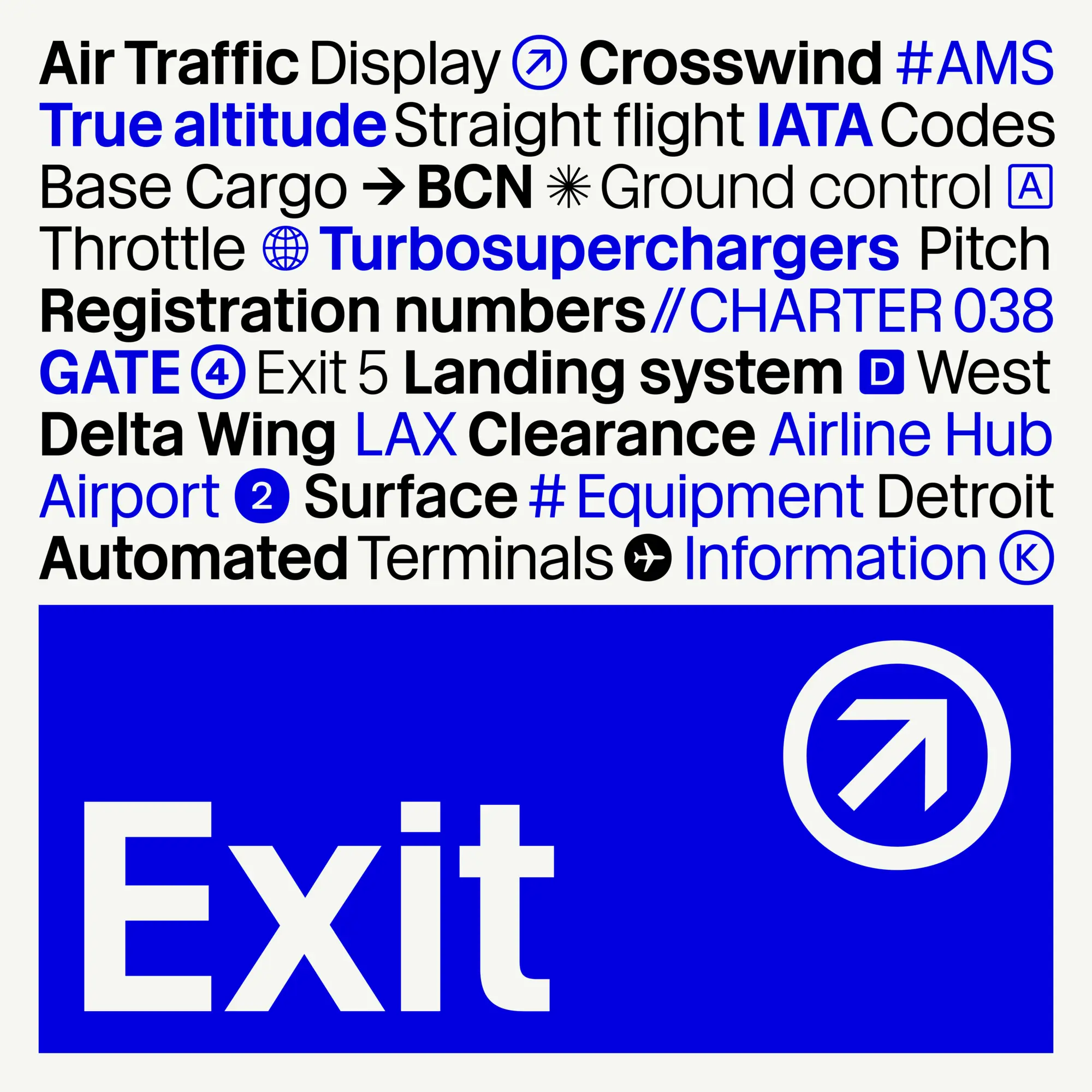 Airport is an interpretation of Matthew Carter’s alphabet for London Airport. The original was drawn in 1961 for the wayfinding system in the newly built Oceanic Terminal, today known as Heathrow Terminal 3. The digital reimagination expands Carter’s design to seven weights and optimizes it for contemporary use. Airport supports a large number of Latin-based languages and includes numerous extras like alternates, arrows, and circled and squared glyphs. An additional variant, Airport X, with a lower x-height, was also developed, which is better suited for texts in smaller font sizes.