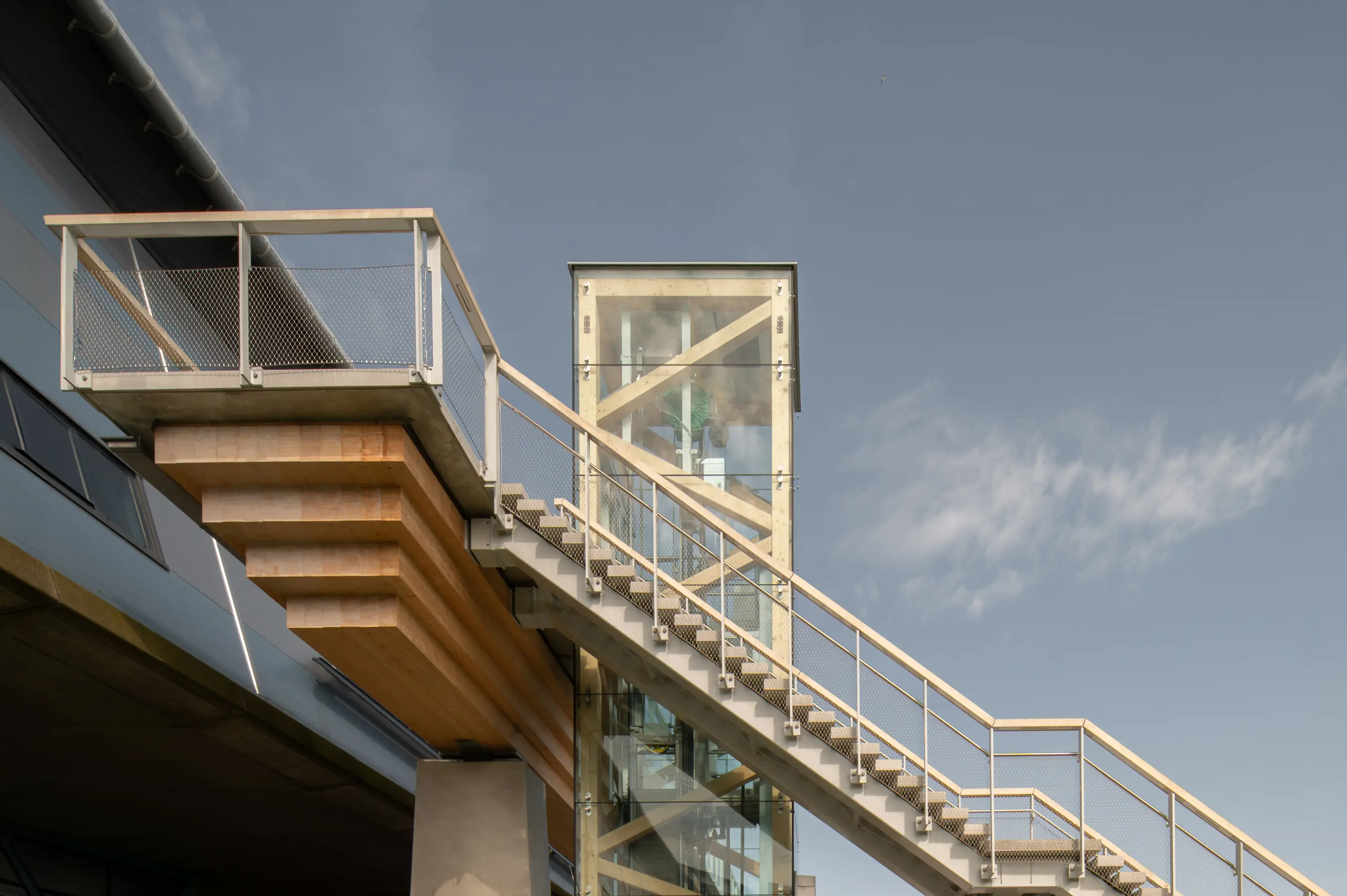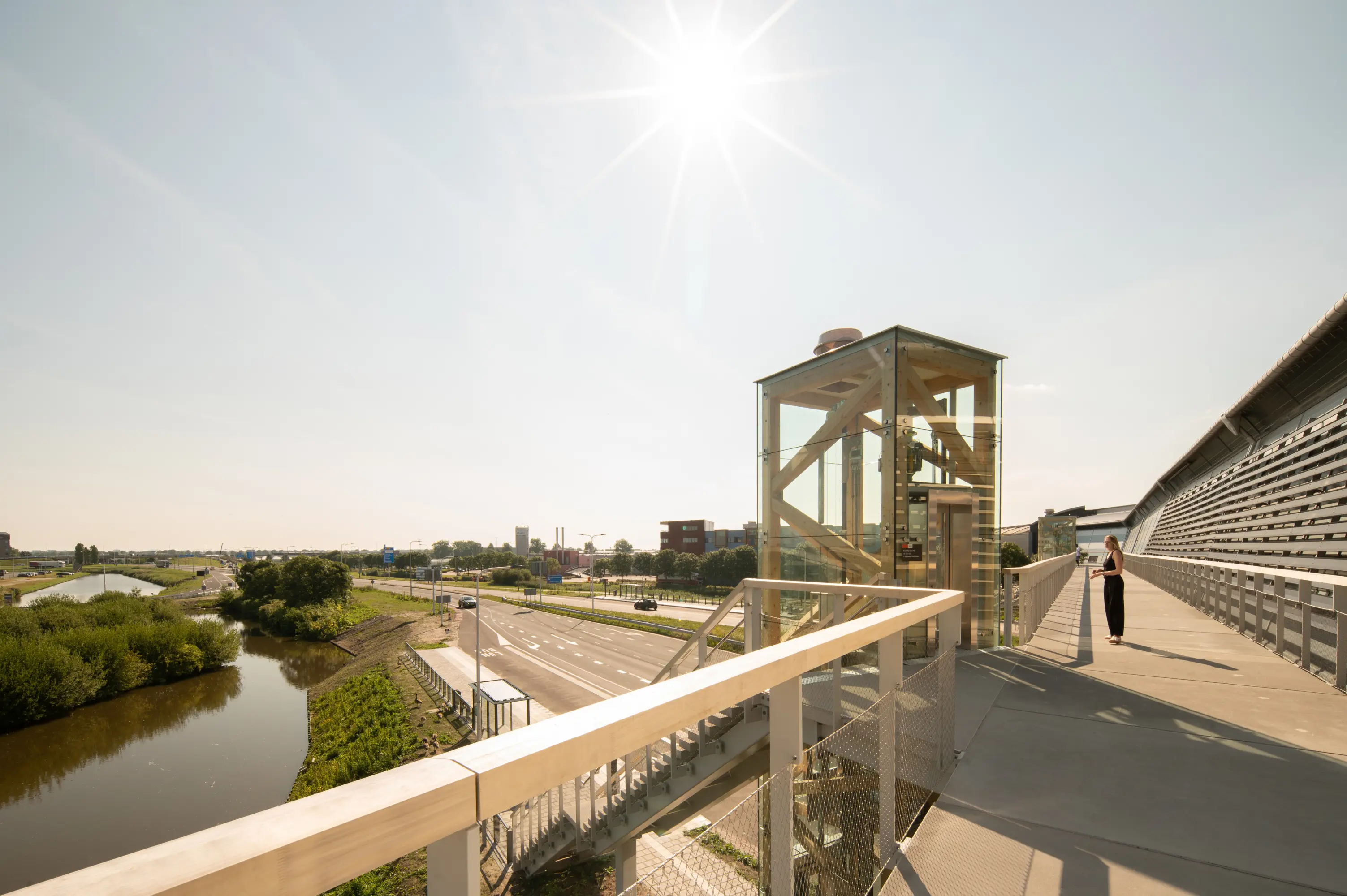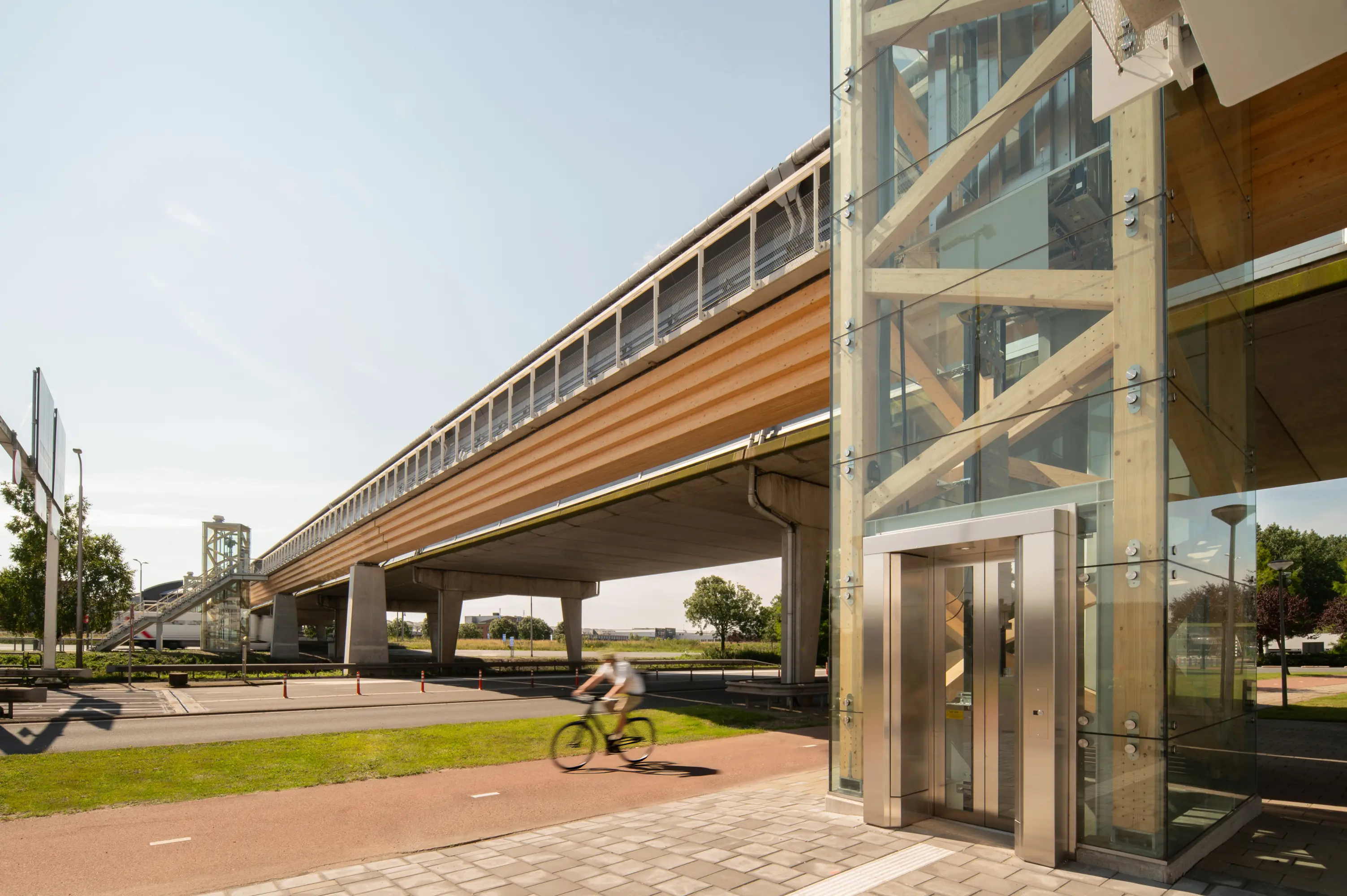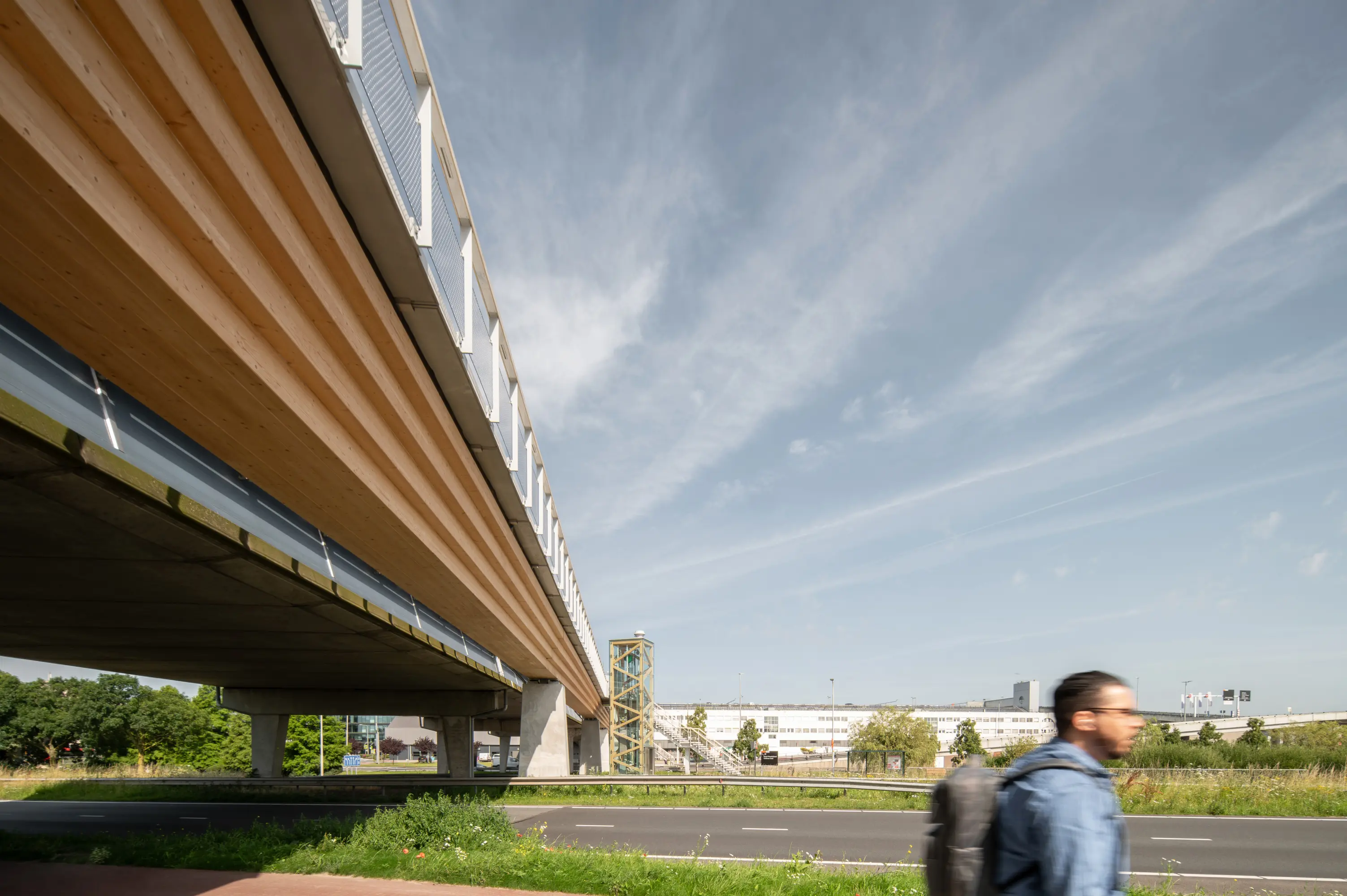 A new timber bridge serves as a link to the world's largest flower auction hall in Holland. With a total length of 140 meters and a width of 3.2m, the multi-span beam bridge extends as a continuous timber block girder with a constant cross-section, supported by prefabricated concrete columns. Prefabricated concrete deck slabs and a steel railing with mesh infill and wooden handrail are attached to the timber girder. These panels protect the timber girder from rain. The timber girder is tapered by 30° to protect against driving rain. Special feature: the elevator towers are also made of wood. Cooperation: wUrck architectuur, Rotterdam.
