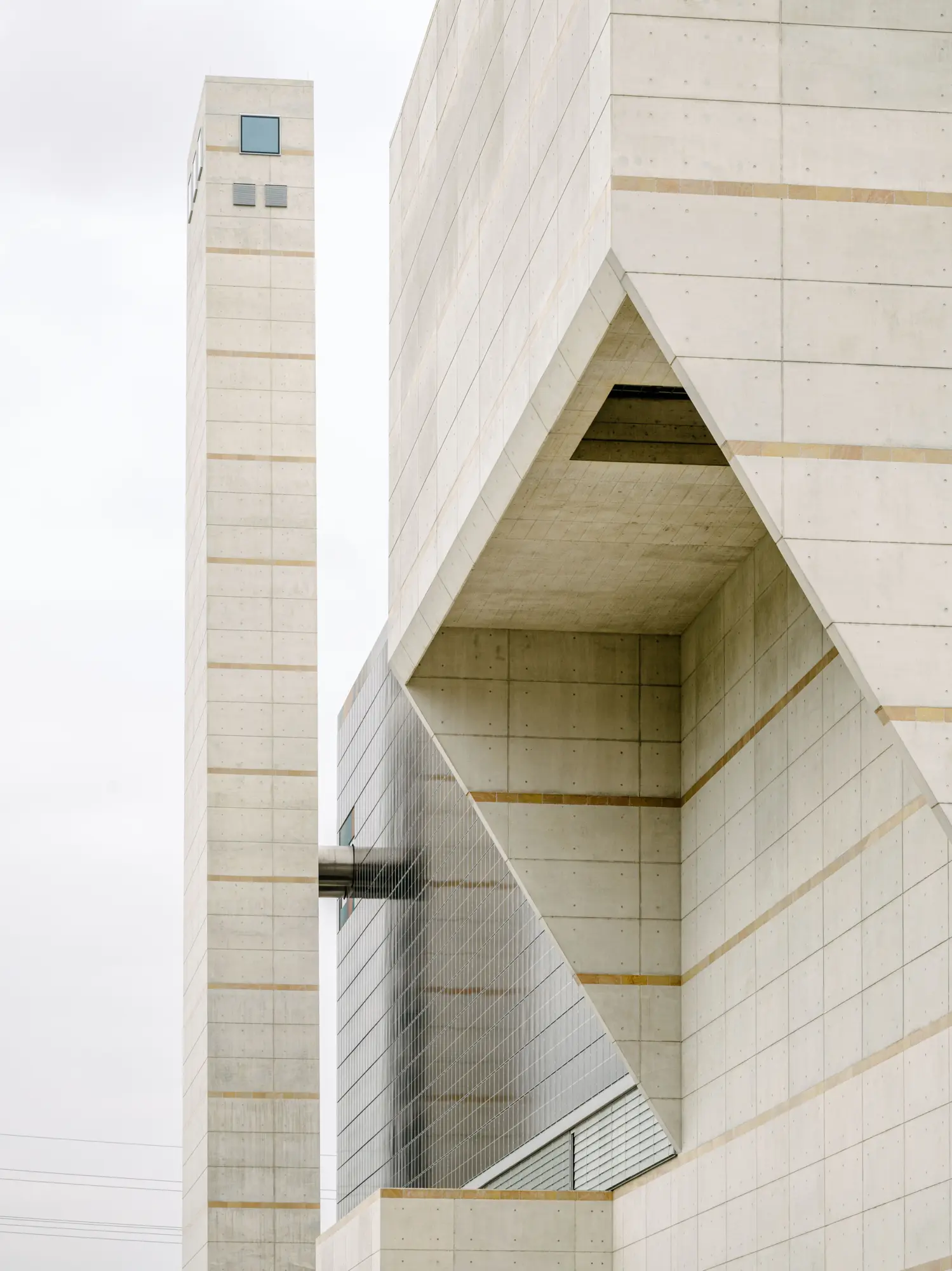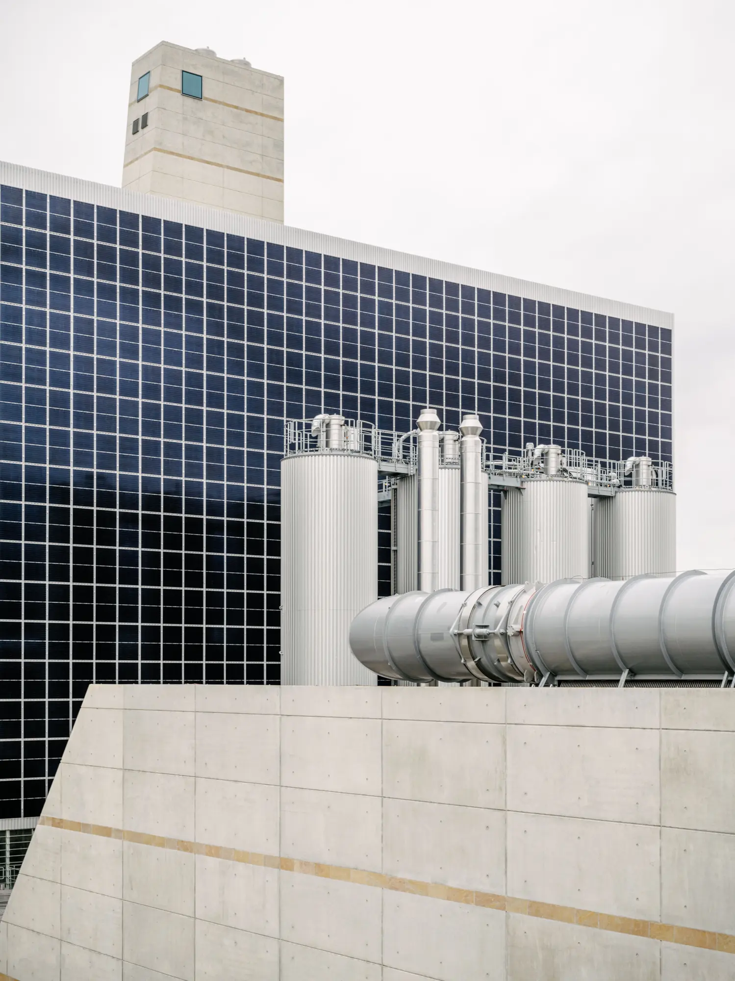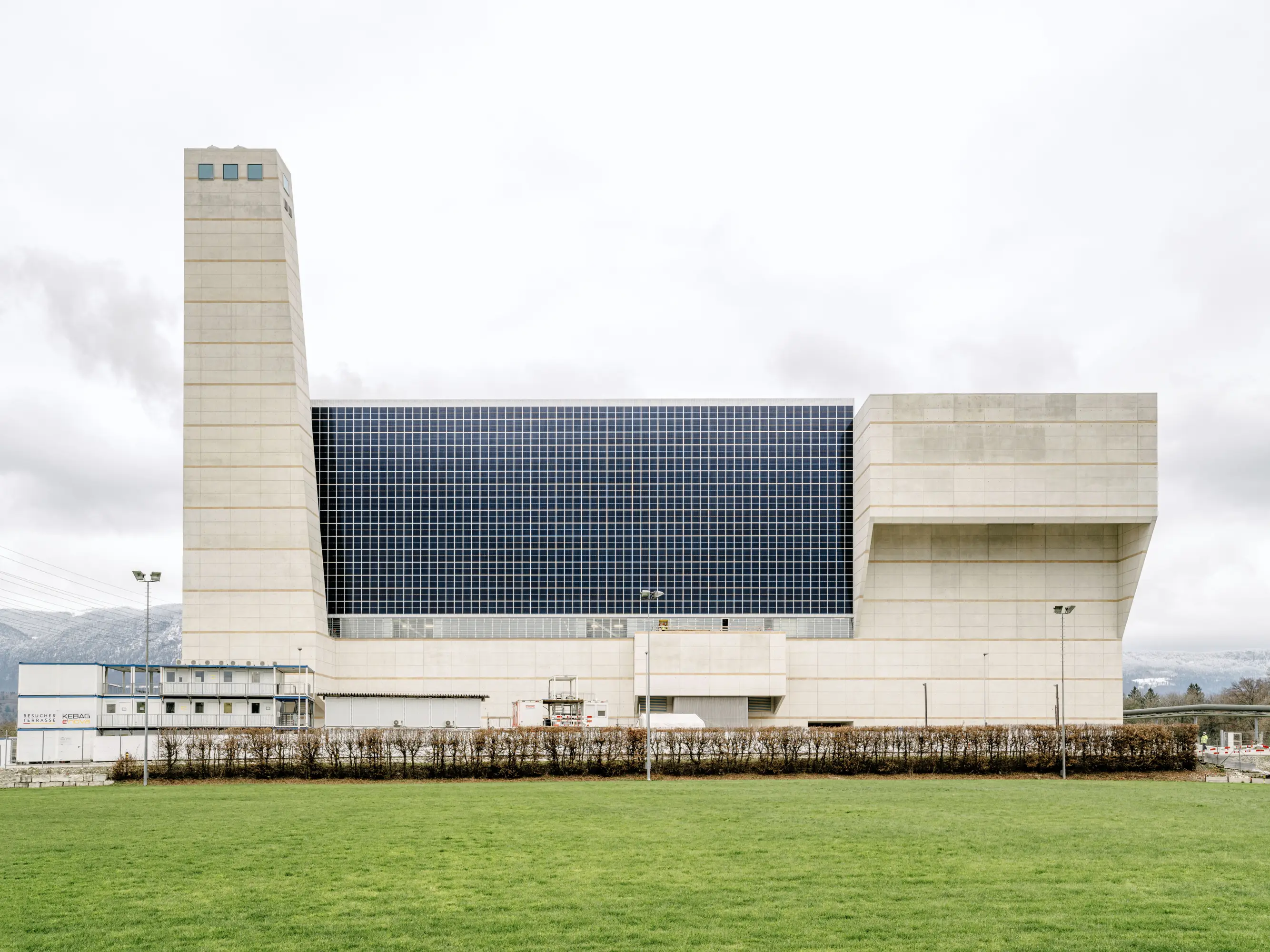 Our goal was to develop a powerful overall form integrating the infrastructural components. The power plant is divided into two parts: a solid plinth containing the main infrastructure and the machinery above. This improves functional clarity and balance. The technical facilities rest on the base and are enclosed in a lightweight shell, like a car body. A glazed band marks the transition and offers glimpses into the impressive machine hall. The chimney also emerges from the base and rises alongside the process building to a height of 80 meters. With more than 5,000 square meters, the PV façade is one of the world’s largest.