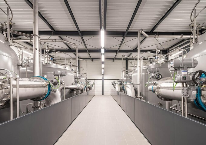 The waterworks in Weiden is not only impressive in terms of technology, but also aesthetics. The different-coloured aluminum composite panels on the building's façade reflect nature and the sky depending on the perspective, allowing the monolithic building to blend attractively into its surroundings.