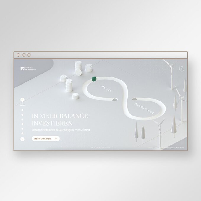 Problem: Many DZ Privatbank clients are oriented towards ethical ESG values, but usually associate lower profitability with this. Idea: The ESG Compass - a digital advisory tool that takes visitors on a journey of discovery around the topic of ESG in order to break prejudice around sustainable investments. It all starts with a green coin, which represents the personal investment that sets off a chain reaction of positive changes. Through personalizable and interactive elements, the customer consultation becomes much more in-depth and the results show that more contracts are concluded.
