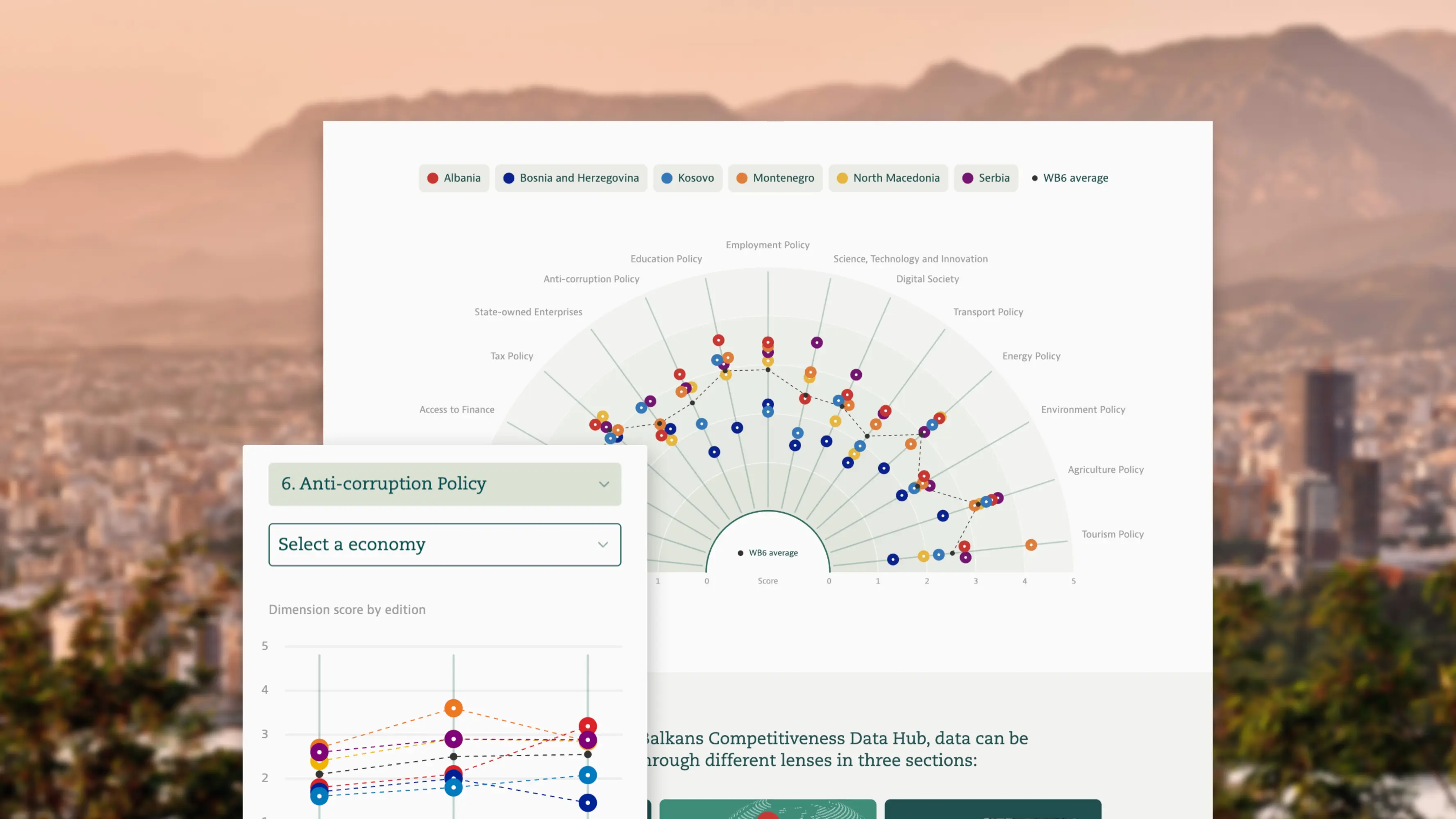 The Competitiveness Data Hub, created for the OECD and the European Commission, helps the six Western Balkan economies benchmark their economic reforms essential to competitiveness and formulate better policies in response. A series of interactive visualizations showcase the progress of individual economies and the region over time, enhancing the understandability, accessibility, and dissemination of the assessment results.
