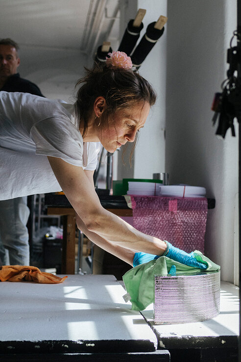 The creative process unfolds not only on the screen but also between the cutter and the cardboard, where hands fold, cut, layer, and shift. Like Paale and Tobias, who now, with the help of a spirit level and tape markings, interlock rings of acrylic glass, brick, granite and metal.