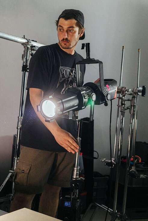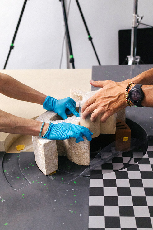 A brightly lit photo studio. Light stands wait in front of white walls, and cables snake across the grey industrial floor. Cameras are poised. Occasionally, a few quiet words are exchanged, but the focus stays on the work surface in the centre of the room. Set designer Marc Ulm (buero.us) lies on the floor, clamping the last chipboards together. Photographer Felix Schöppner adjusts one final spotlight. Then, the puzzle begins – a visual dialogue that will soon become the face of the German Design Awards 2026.