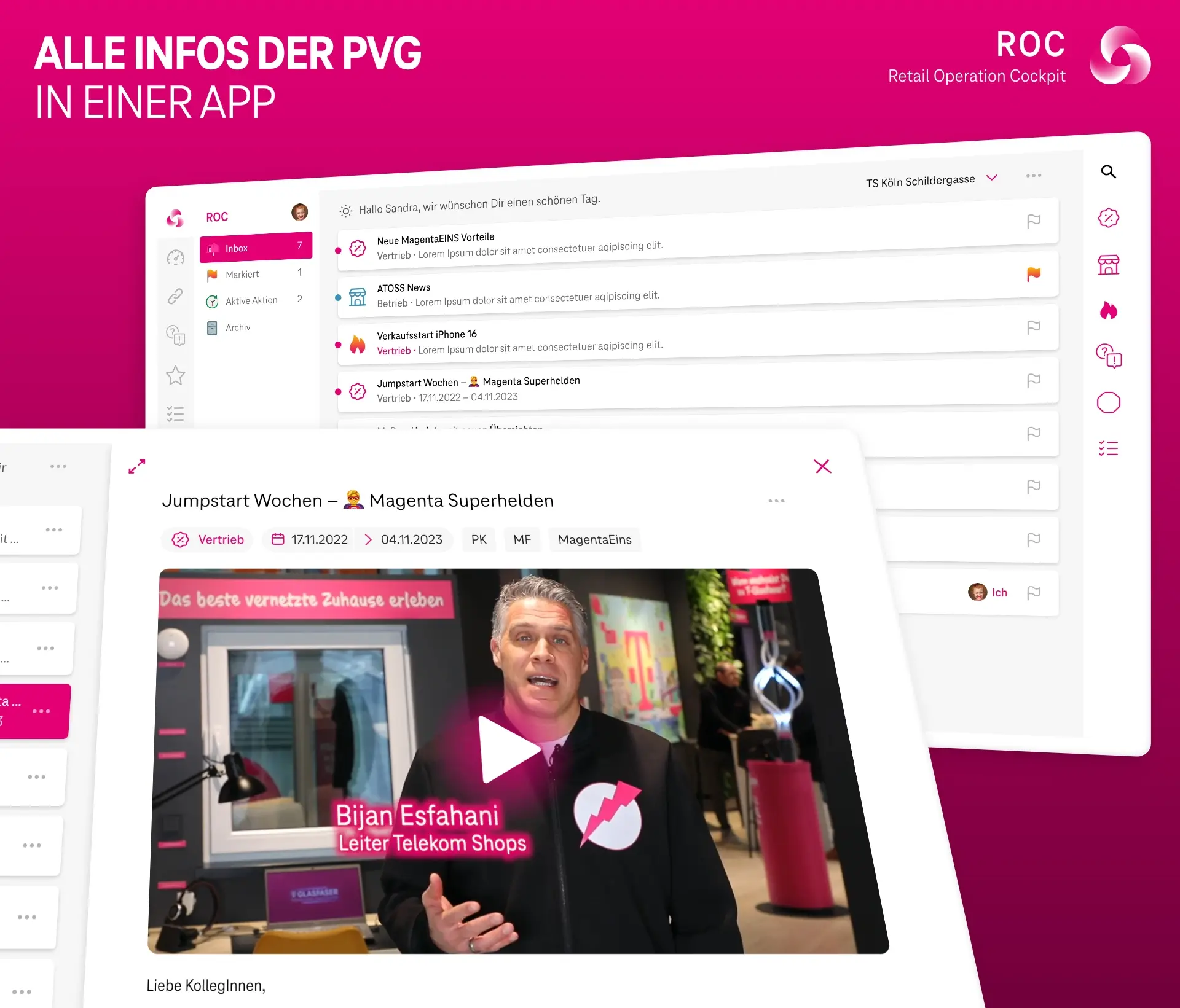 ROC – Retail Operation Cockpit ist die zentrale Plattform der Telekom für effiziente Shop-Abläufe. Mitarbeitende steuern Prozesse schnell und einfach in einer browserbasierten Anwendung mit News-Inbox, Q&A-Tool (KOM), zentralen Links und PowerBI-Reports – erreichbar per Web oder App (iOS/Android). Designed & entwickelt von Wahnsinn Design GmbH auf Basis ihrer ION-Software, optimiert ROC Kommunikation zwischen Shops, Partnern und Vertrieb. Sicher auf Telekom-AWS gehostet, kontinuierlich erweitert und zukunftssicher.