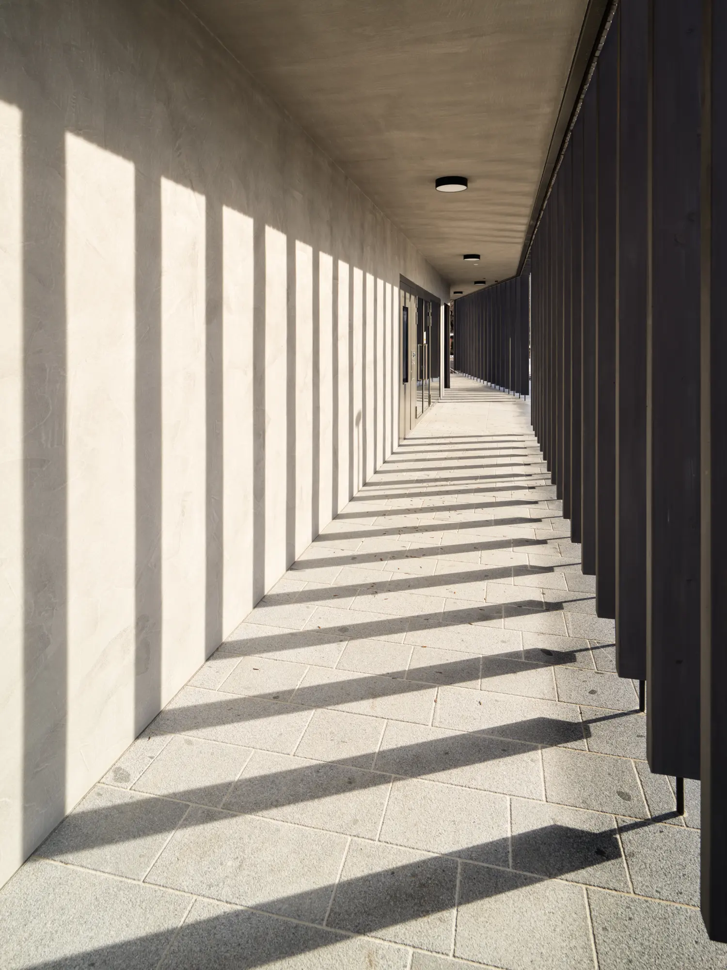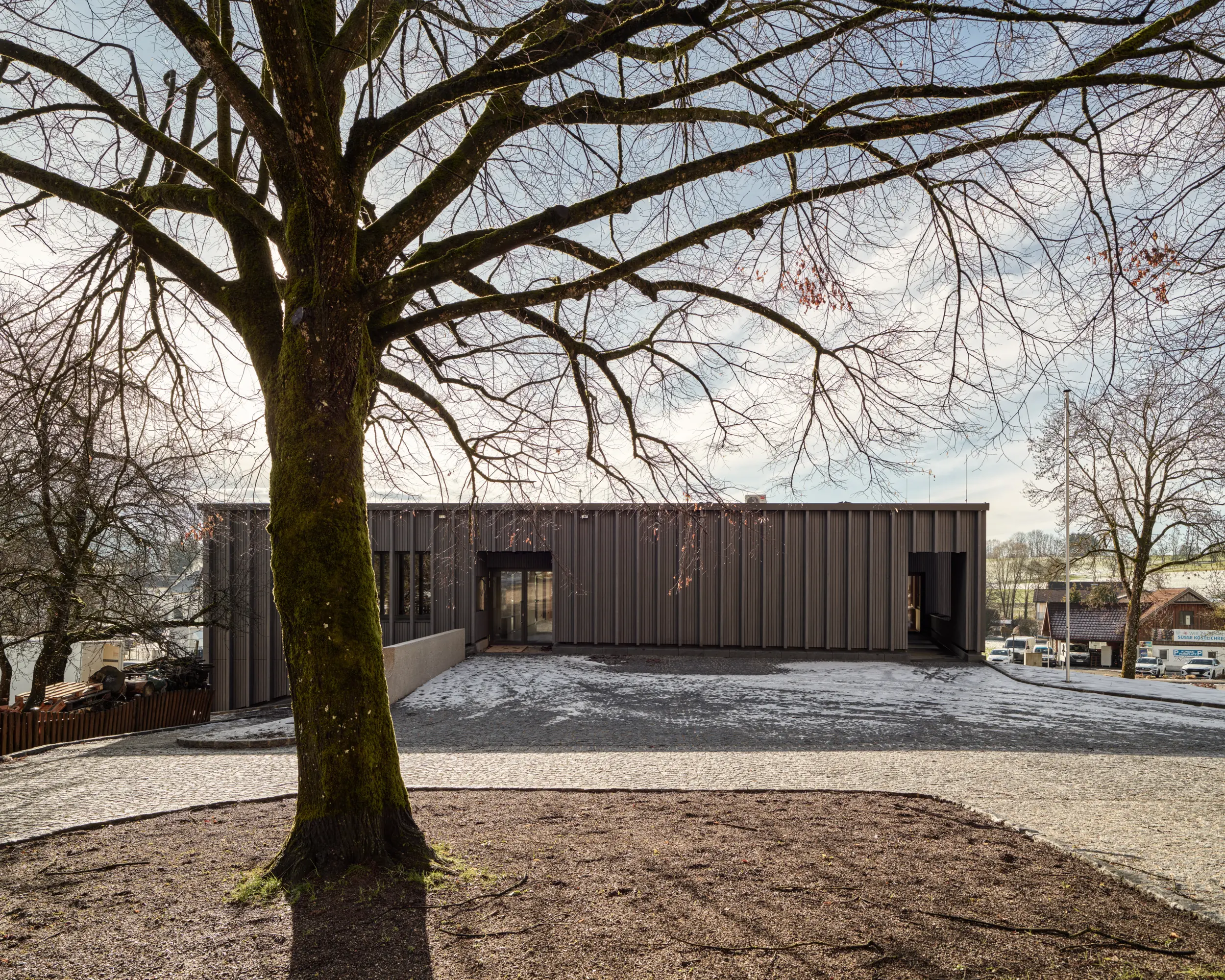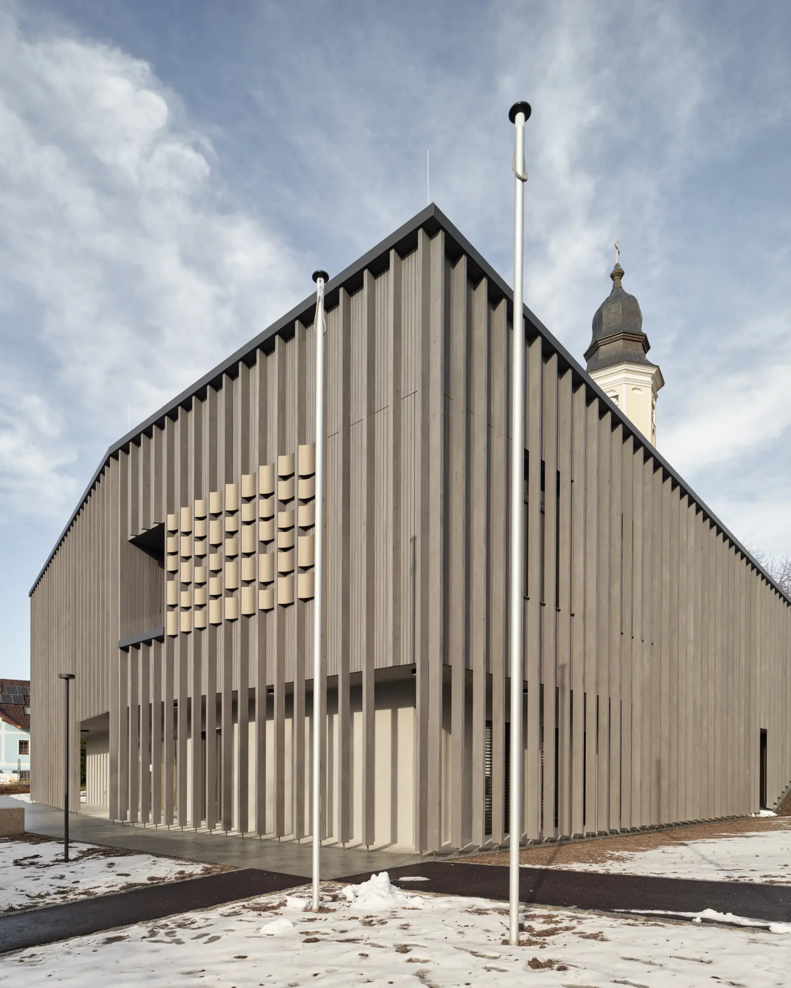 Das neue Gemeindezentrum in Zell am Pettenfirst fügt sich harmonisch in den Ortskern ein, ohne der Kirche die Dominanz zu nehmen, und schafft mit umliegenden Gebäuden und Grünflächen eine neue Mitte. Der 435 m² große Bau folgt der Hangneigung und erhält eine alte Esche. Erdgeschoss in Massivbauweise, Obergeschoss in Holz mit Pultdach, Photovoltaik und Wärmepumpe. Graue Fassade mit Holzlamellen, warme Eichen-Details innen. Unten Büros und teilbarer Saal, oben gemeinsam genutzte Vereinsräume für optimale Flächennutzung.