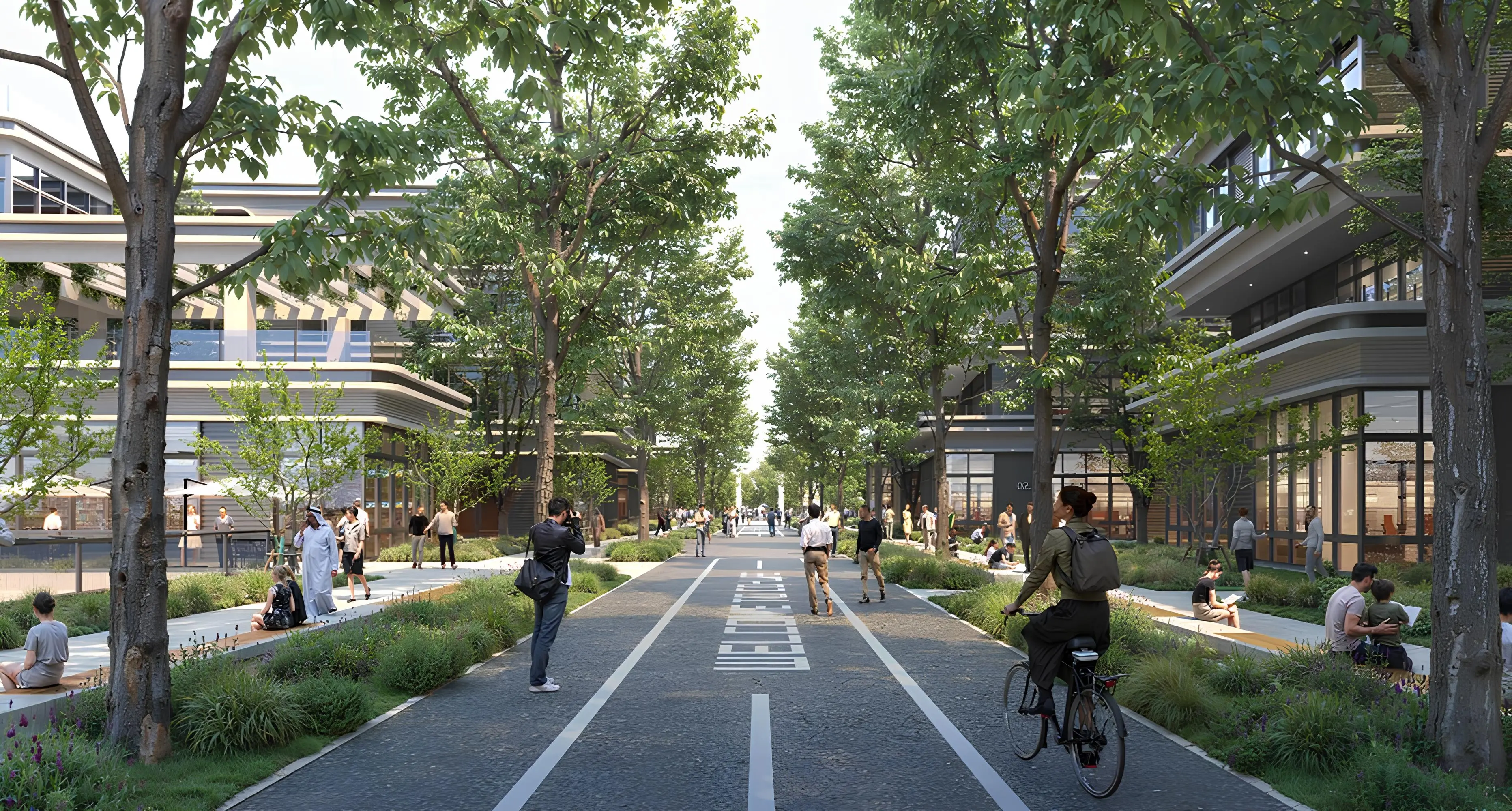 Bei diesem Projekt handelt es sich um einen Industriepark im Rahmen der chinesisch-saudiarabischen Kooperation. Der Industriepark umfasst 33 kleine Werkstattgebäude, die in linearen Nord-Süd-Reihen angeordnet sind und so markante Cluster bilden. Die Fassaden zeichnen sich durch ausgeprägte horizontale Bänder, geschwungene Fasen, versetzte Balkone und eine dezente Hintergrundwand aus, um die Identität und Modernität des Gebäudes zu unterstreichen. Eine zentrale grüne Achse teilt das Gelände in 2 Phasen und verbindet die östlichen und westlichen Zonen mit dem nördlichen Ökopark. Es entstehet eine grüne, sichere und angenehme Fußgängerpromenade.