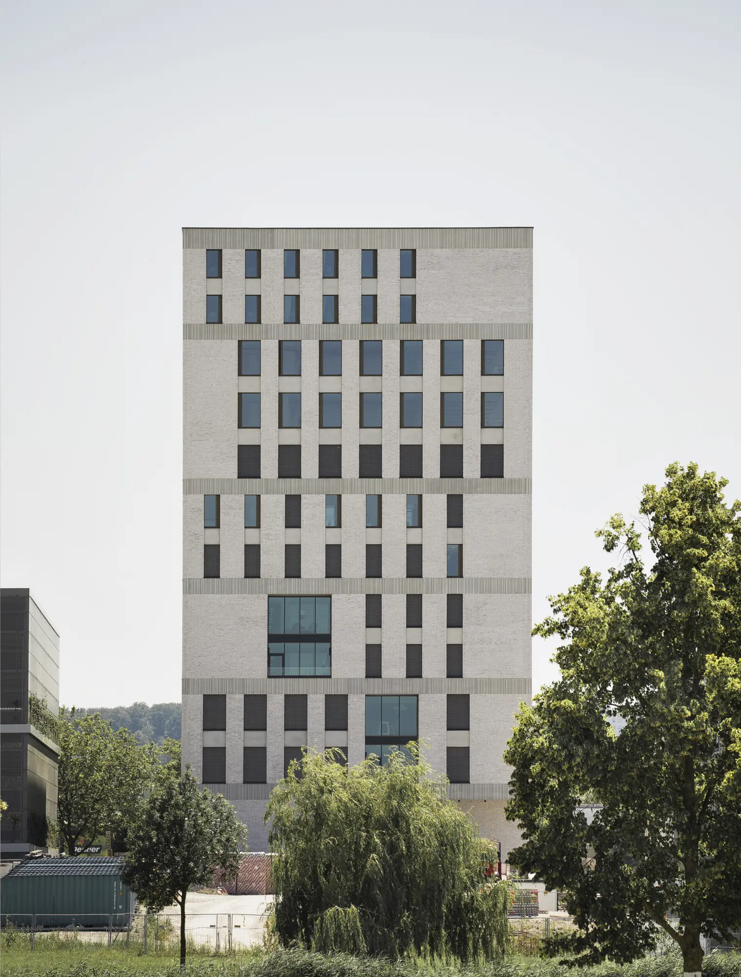 Der Hochpunkt am Flugfeldklinikum Böblingen ist ein multifunktionales Hochhaus mit 13 Geschossen. Es vereint Verwaltung, Bildungsräume, eine Kita und Mikroapartments in einem flexibel nutzbaren, robusten Baukörper. Die tragende Klinkerfassade mit horizontalen Betonbändern verleiht dem Gebäude eine klare, dauerhafte Gestalt. Der kompakte Grundriss mit zentralem Kern ermöglicht vielfältige Nutzungen bei hoher Energieeffizienz. Als städtebaulicher Auftakt zum entstehenden Gesundheitscampus setzt der Hochpunkt ein prägendes architektonisches Zeichen für die Zukunft der Gesundheitsversorgung.