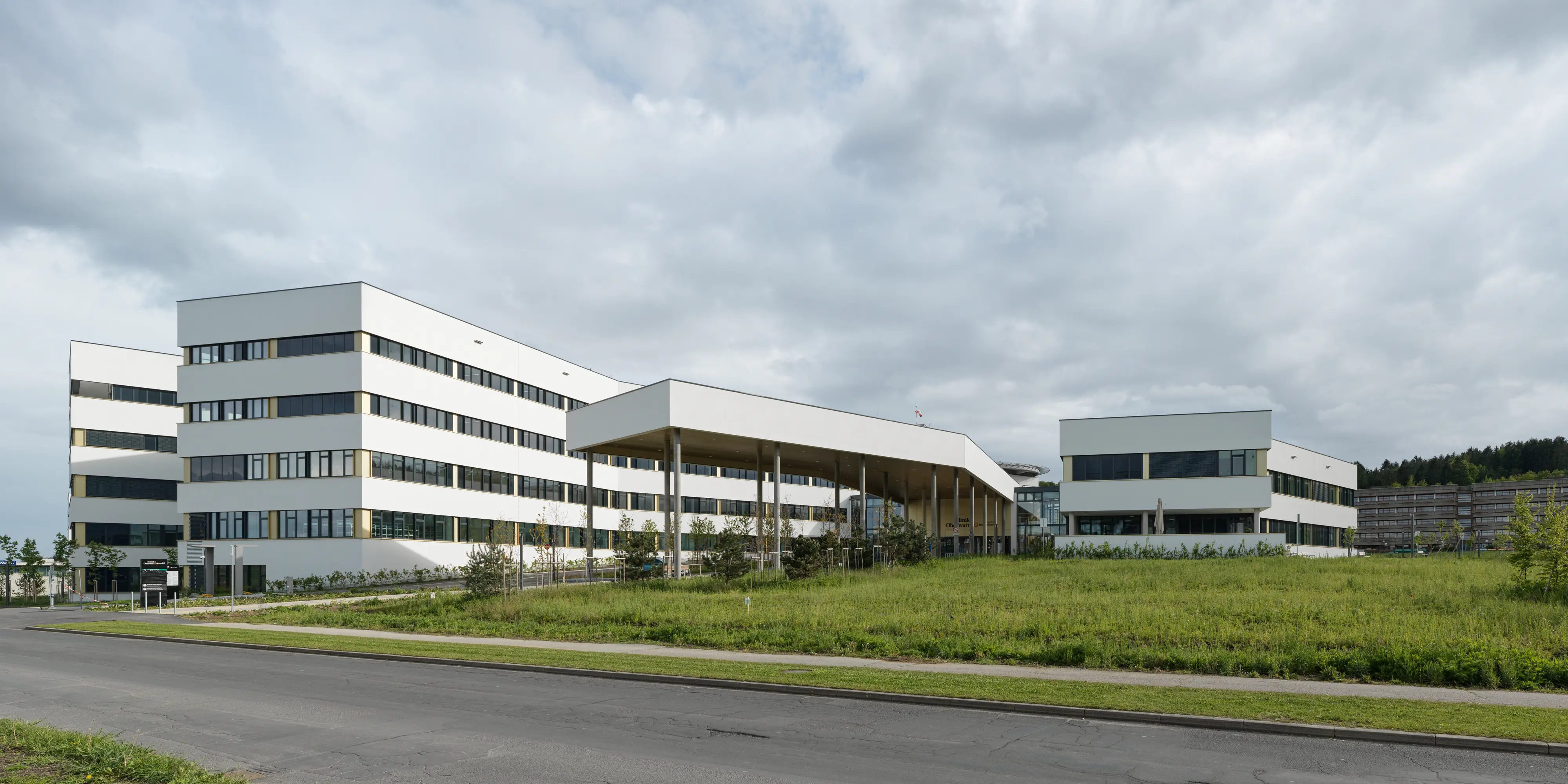 Die Klinik Oberwart bietet mit ihren schlanken, zueinander verschränkten Baukörpern einen lichtdurchfluteten und abwechslungsreichen Rahmen für die vielfältigen Behandlungs- und Pflegeaufgaben eines modernen Krankenhauses. Hauptmagistrale, Nebenmagistralen und Gänge bilden kleinteilige, helle Verteiler-, Warte- und Kommunikationsräume. Mehrgeschossige Licht-, Luft- und Blickverbindungen fassen mit sanft ansteigenden Treppenanlagen das Gebäude über mehrere Geschoße hinweg zu einer großen Einheit zusammen. Der Außenraum ist auch im Gebäudeinneren jederzeit präsent.