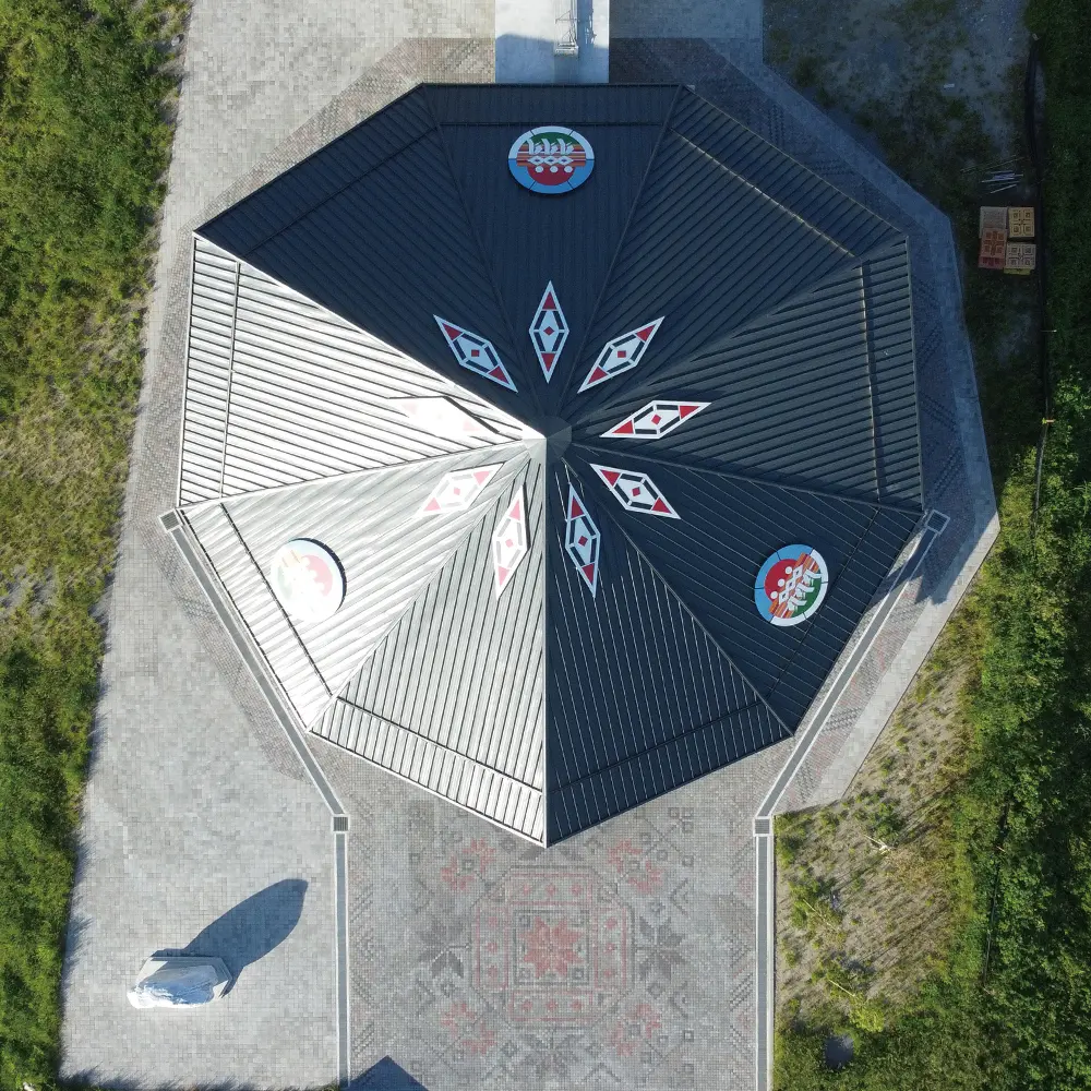 Das Gebäude des Amis-Matang-Stammes in Taiwan vereint traditionelle Kultur mit modernem Design. Es integriert die Amis-Farben – Rot, Schwarz und Weiß – und zeichnet sich durch eine schirmförmige Struktur mit aufgewölbten Dachecken aus, die den Gottheiten und Ältesten Ehre erweist. Ein rotes stählernes Dreieck-Fachwerk sorgt für Stabilität bei Erdbeben und Taifunen, während drei Stützen die Altersstruktur des Stammes symbolisieren. Der Boden zeigt Sonnen- und Wellenmuster, die den Göttern gewidmet sind und die Verbundenheit des Stammes mit dem Meer widerspiegeln, zusammen mit Totems, die die Amis- und Matang-Stämme repräsentieren.