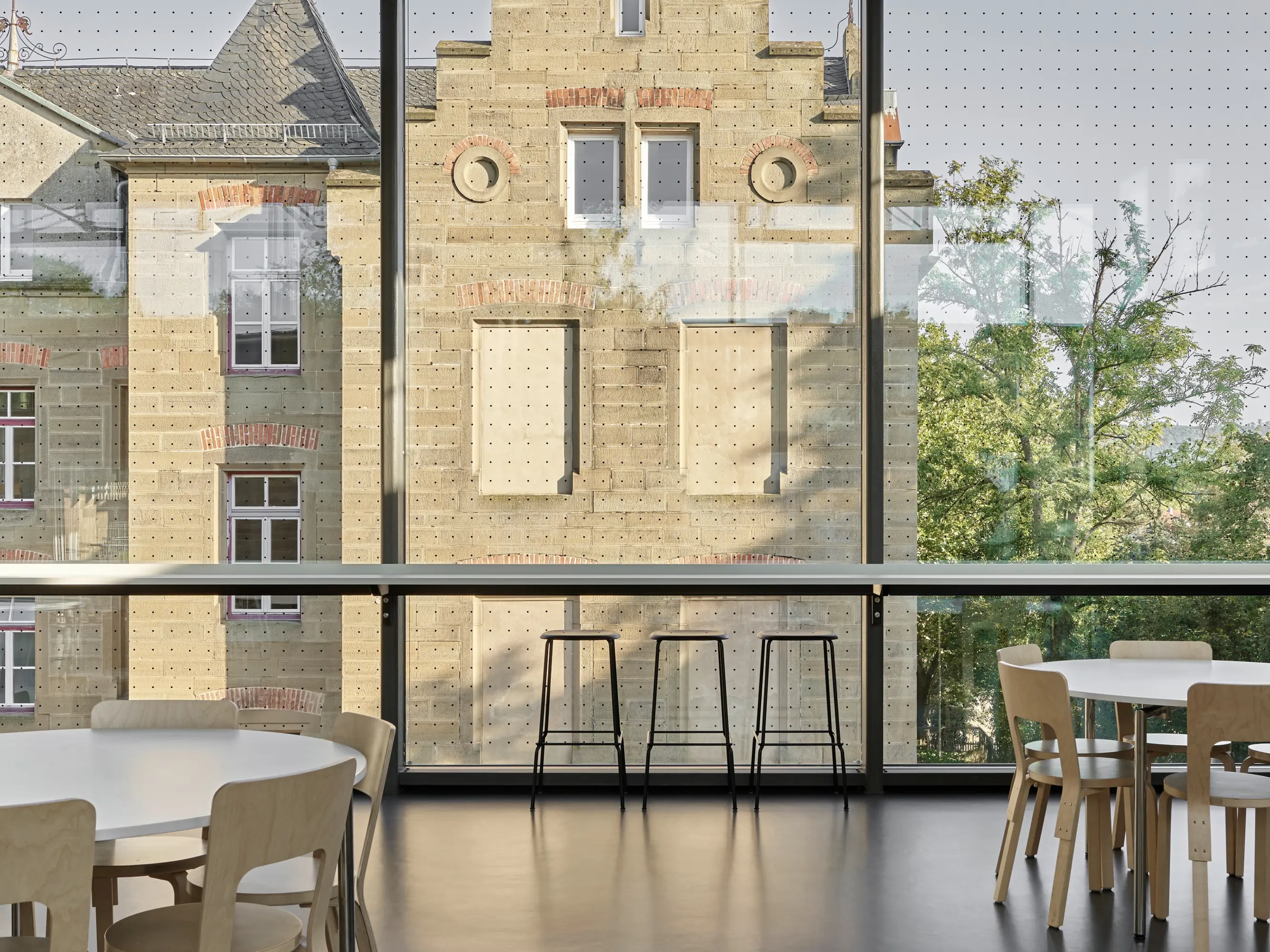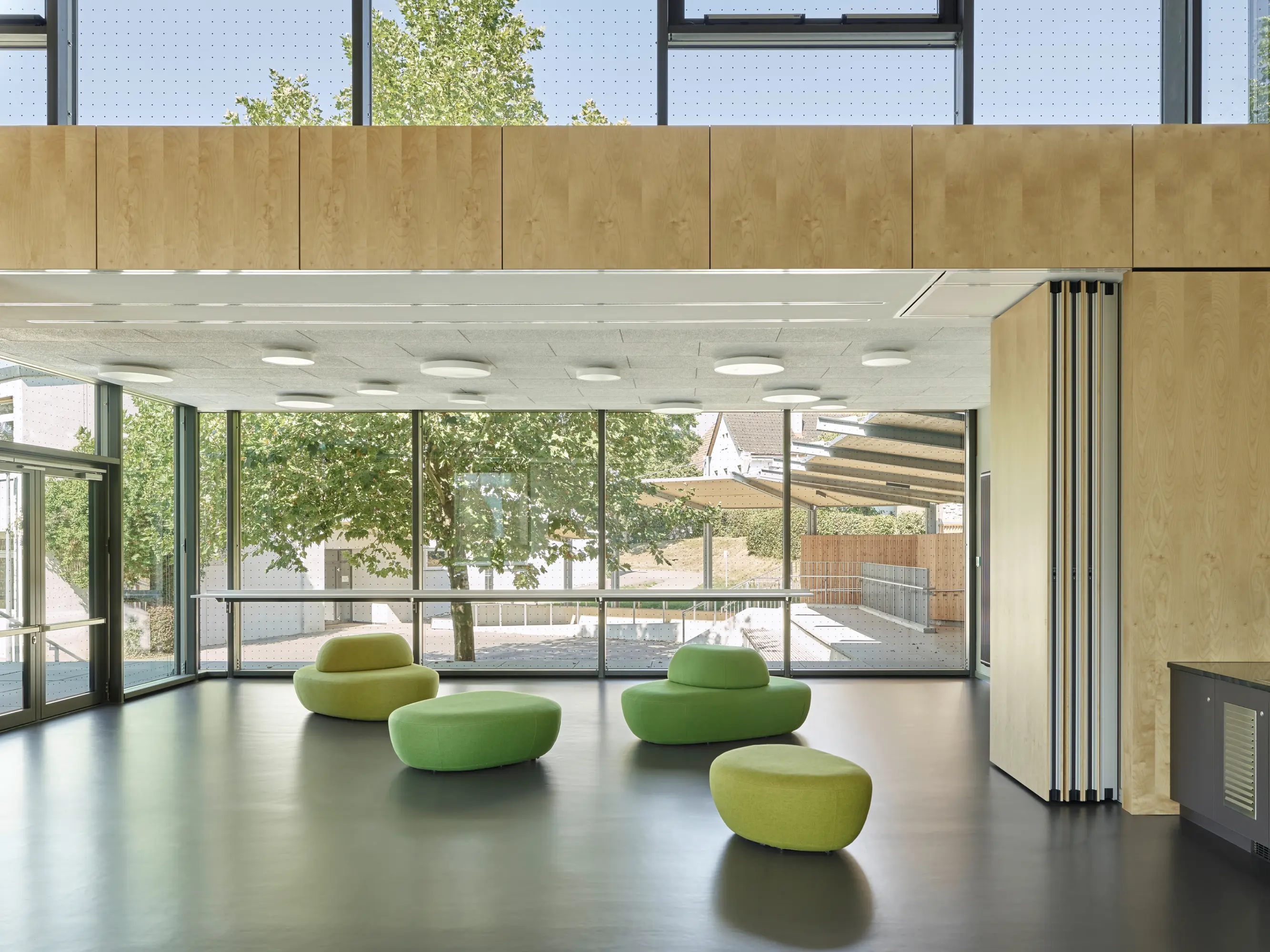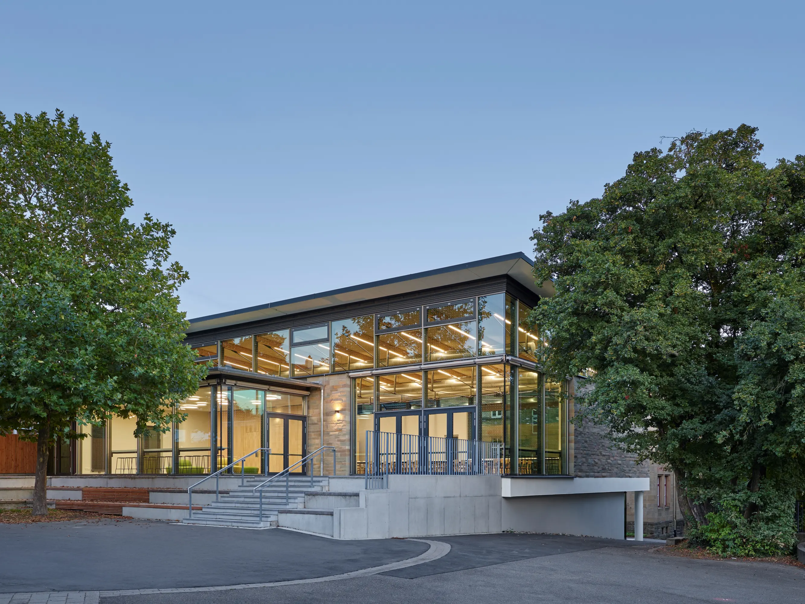 Der Neubau der Mensa verbindet Schulgebäude und Freibereiche. Ein hoher, lichtdurchfluteter Speisesaal öffnet sich zum Schulhof, während Nebenräume im zurückhaltenden Baukörper untergebracht sind. Großflächige Verglasungen und eine schwebend wirkende Dachkonstruktion betonen die Transparenz und bringen viel Tageslicht ins Gebäude. Der Ganztagesbereich im Untergeschoss ist ebenerdig erschlossen. Klare Struktur und funktionale Gliederung sorgen für Orientierung und Aufenthaltsqualität.